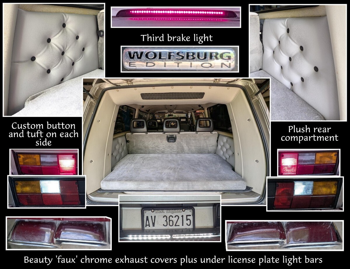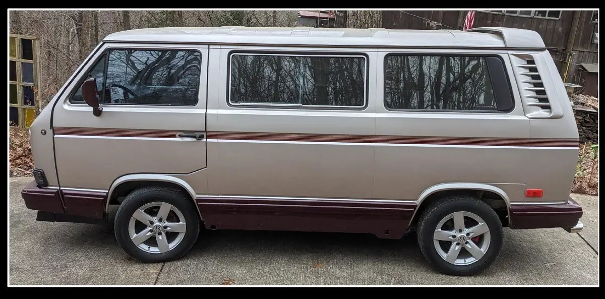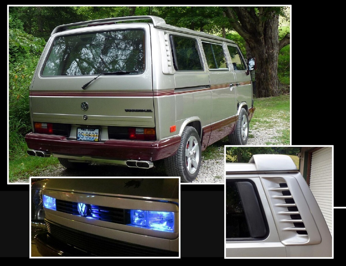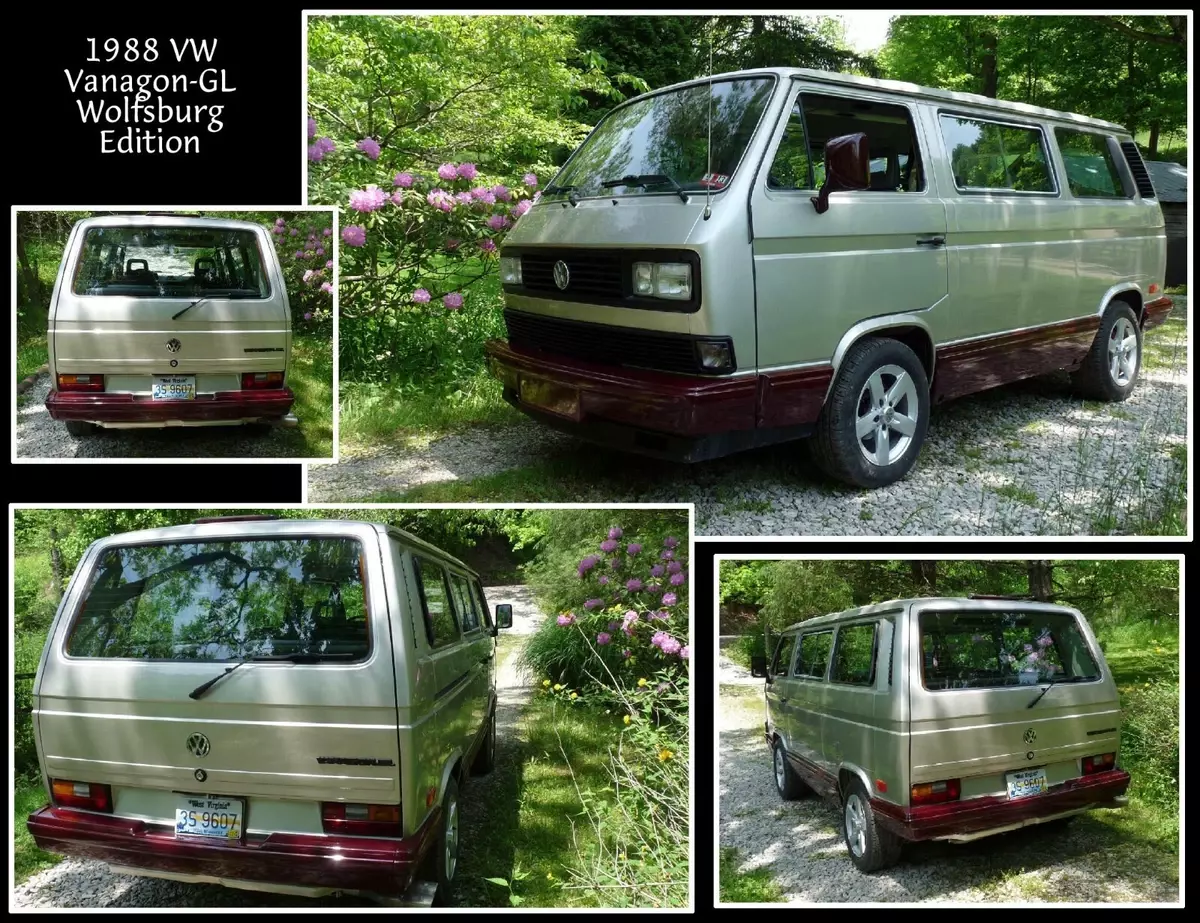 • 1988 Vanagon GL Wolfsburg Edition - priced at $14,900• Garaged since 2000; immaculate; little rust (I found 2 tiny places under a window)• Condition: Excellent - All body work, mechanical work, maintenance done by owner• Exterior and paint: In 2013 all windows and trim removed; seams sand blasted to eliminate rust; prepped and primered - then completely repainted in silver grey with burgundy accents by the owner• Interior: Velour grey seats with adjustable arm rests• Panasonic radio + CD player with Kenwood speakers front and back• Removable face plate for radio• External mirror position control on driver door• Defroster on rear hatch; rear wiper• Transmission: Automatic• Engine 2.1L w/ power steering• See through headrests• Has won several awards at local car shows• Mileage: 260,450• New air channels, wing and tail light trim brought from Germany and installed in 2013• Faux chrome exhaust tips• Custom button & tuft sideliner both sides in the rear• Fully functional AC & heater• Regular oil changes and maintenance• Crank windows, interior spotless• Bench folds down to make a bed• Third brake light plus extra backup light bar below license plate installed 2013• Behind grill lights / headlight reflectors installed 2013• 'BlazeCut' automatic fire suppression system installed over engine