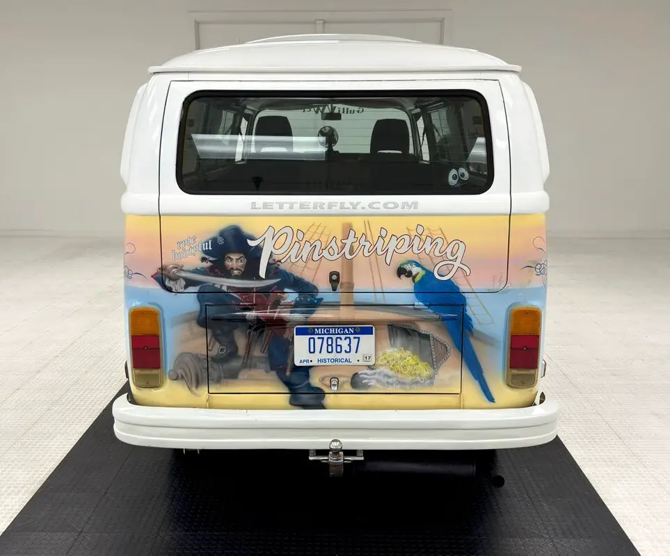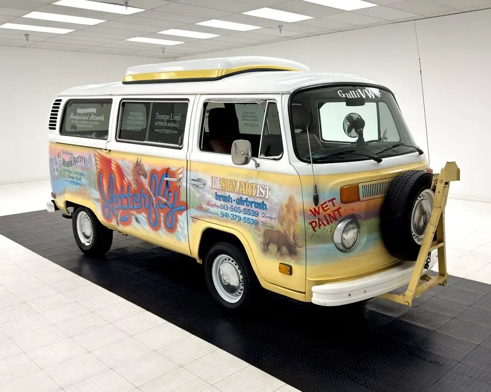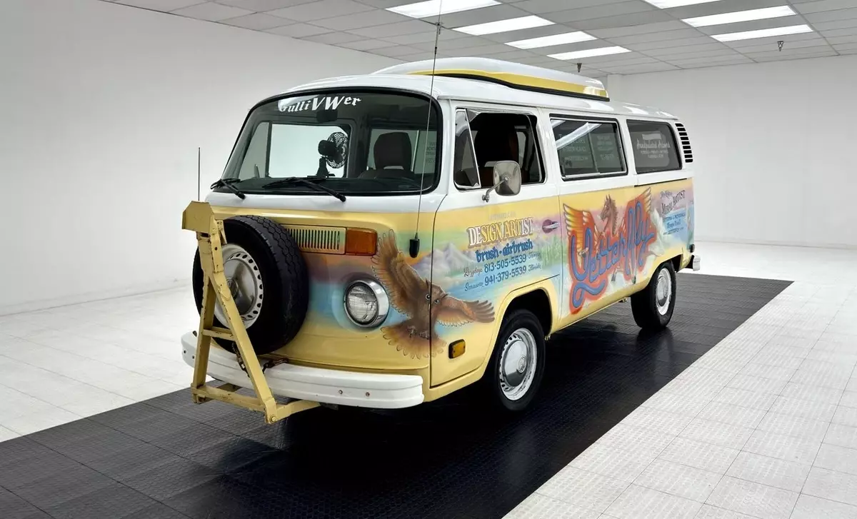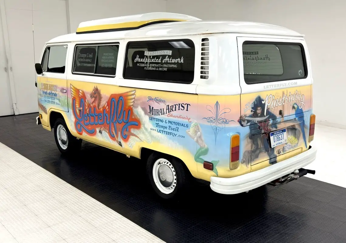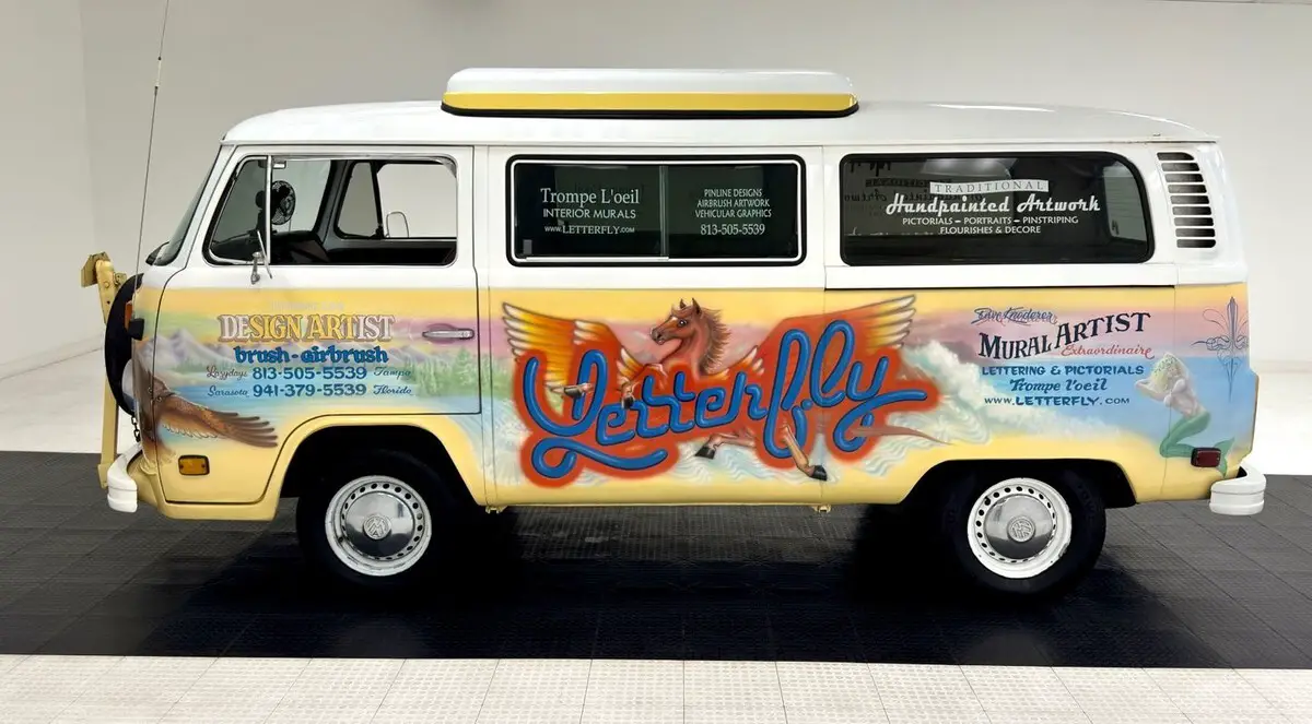 1976 Volkswagen Type 2 Kombi Bus For consignment, a 1976 Volkswagen Type 2 Kombi bus showing 90,383 miles, but the true miles are unknown. This storied van served a mural artist for 30 years, travelling to 32 states, (behind an RV), to work his craft, and having seen three engines and two transmissions. There's so much you can do with this Kombi bus, but if you happen to be a mobile artist, your ship has just come in! Exterior In the words of our consignor, "the artwork evolved over the years from signs to mural work to pinstriping" and it has retained all of it to this day. While the top half of the van presents in white, the lower section contains a continuous mural including mountains, waterways, and trees. Above that, lettering abounds, a Pegasus spreads its wings on each side while pirates, birds and other wildlife along with pinstripe flourishes color additional panels, all on a yellowish cream base. A front tow bar leads the way stowed over a spare tire while the pop up is bordered in yellow and intact when extended. Imperfections include metal work that shows age, numerous cracks in the paint, flaking paint over surface rust on the drip rails, and numerous spots of bubbling. Interior Saddle vinyl door panels contrast with the typical VW black hardware, including the vent that doubles as an armrest and other than some looseness at the bottom, the panels are in decent shape. Camel and tan vinyl bucket seats are supplied up front in decent shape with a tear in the base of the passenger seat. The black dash and two spoke steering wheel all show some age but it's all there, plus an AM/FM/Cassette radio in the middle under a dash mounted fan looking remarkably period correct. And speaking of period, there's a Cobra CB radio on board and the microphone is connected to the floor mounted shifter. A ribbed rubber mat covers the floor. In back, a canvas for creativity with an artist's drafting table like surface accompanied by a chair that was in every school in 1976. A cord is strung on one side equipped with clothespins with which to hang your fresh finger paint or pastel. The headliner and pop up are in good shape with some staining and the way back wears some well worn carpet. Windows are covered with film that doubles as signage. Drivetrain In back we have a 1600cc flat four cylinder engine producing 47 horsepower with a 1-barrel carburetor and 4-speed manual transmission. Gearing in back is 4.875 and power brakes are provided as front power disc and rear power drum. Undercarriage Plenty of surface rust exists on this driver quality underside, along with a coating of oil on the transmission. The dual exhaust and stock style muffler are tinged by surface rust but intact while we note some flaking rust on a frame rails and where the battery box once was. There are a few spots where grease has accumulated, but the knuckles are in decent condition. Suspension includes a front torsion arms and a transverse torsion bar in back. Drive-Ability We grab our #4 precision brush, some gouache, and a beret and head out into the vast unknown, or as we like to call it, our test loop. Despite sub 100 horsepower numbers, these vans can feel not quick per se, but spry and with the forward cab quite fun to navigate. On our artistic adventure, we note the horn, turn signals, brake lights, tail lights, and heater blower not working. Sacre' bleu also, the brakes feel a bit soft too. Beyond these things, the remaining functions worked as they should. While Classic Auto Mall represents that these functions were working at the time of our test drive, we cannot guarantee these functions will be working at the time of your purchase. If Bob Ross drove a VW van, it might look exactly like this. But exterior aside, this is still a 1976 Kombi, providing somewhat of a blank canvas for the next owner to return it to stock configuration, create a mini camper, or whatever artistic avenues you decide to follow! Van life is waiting and it just showed up in a kaleidoscope covered VW! Classic Auto Mall is home to more than 1,000 classic and collectible vehicles for sale via consignment in a climate controlled 336,000-square foot showroom (that's more than 8 acres!). The largest single location consignment dealer of classic and collectible vehicles in the country is located in Morgantown, Pennsylvania, just 1-hour west of Philadelphia off Exit 298 of the I-76 Pennsylvania Turnpike. For more information visit or call us at 610-901-3804. Contact us anytime for more information or to come see the vehicle in person. There is no guarantee of mileage. A $299 Dealer Administrative fee is not included in the advertised price. With so many great cars, you know we have a lot to talk about, and we do that each week on the Classic Auto Mall Podcast with host Stewart Howden. Stewart discusses new inventory as well as trends in consignments and car prices, while interviewing celebrities and automotive professionals about amazing cars and their history. Tune in each week to the Classic Auto Mall Podcast wherever you enjoy listening. You can also watch on YouTube!