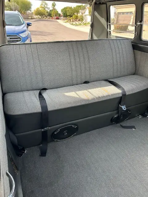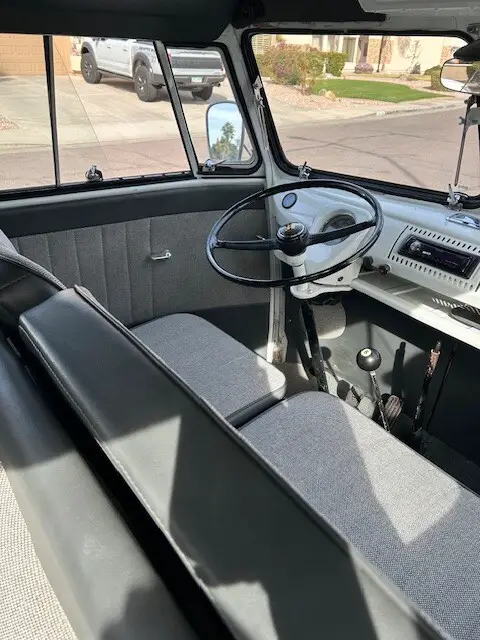 A standout feature is the aftermarket soft top roof, which opens for a breezy, open-air experience—perfect for sunny drives. Inside, you’ll find a spacious bench seat in the back, ideal for road trips or weekend adventures. This VW Bus is not just a vehicle; it’s a lifestyle, perfect for enthusiasts or anyone looking to own a piece of automotive history.