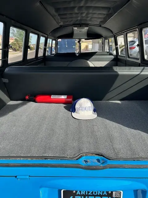 The bus sports a striking blue and white paint job that’s in great shape, with only a few minor chips adding character. Its frame has been lowered for a cool, custom stance, and the undercarriage pan is in excellent condition. The tires are in good shape, featuring traditional white walls and classic chrome dome wheel covers that enhance its retro vibe. The engine compartment is exceptionally clean, reflecting the care this bus has received.