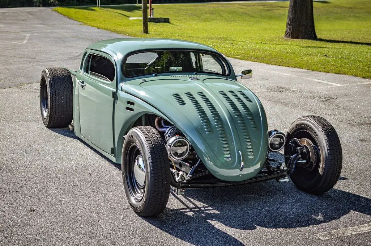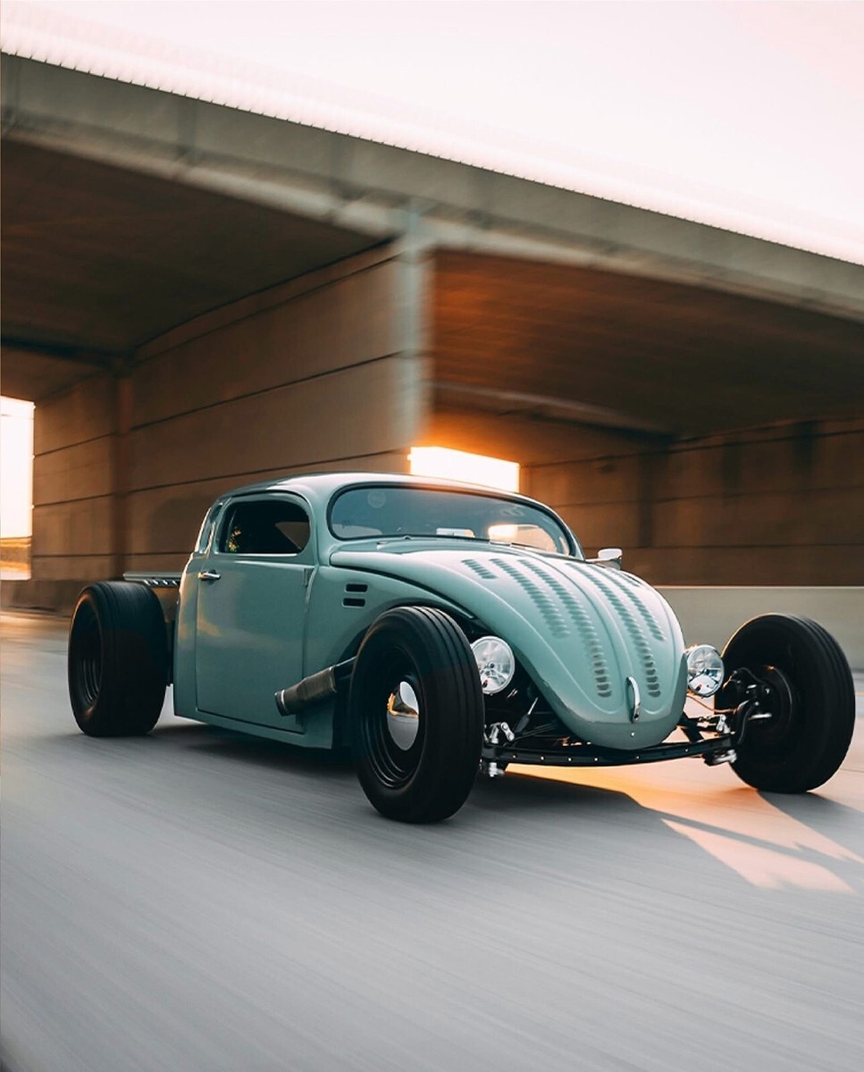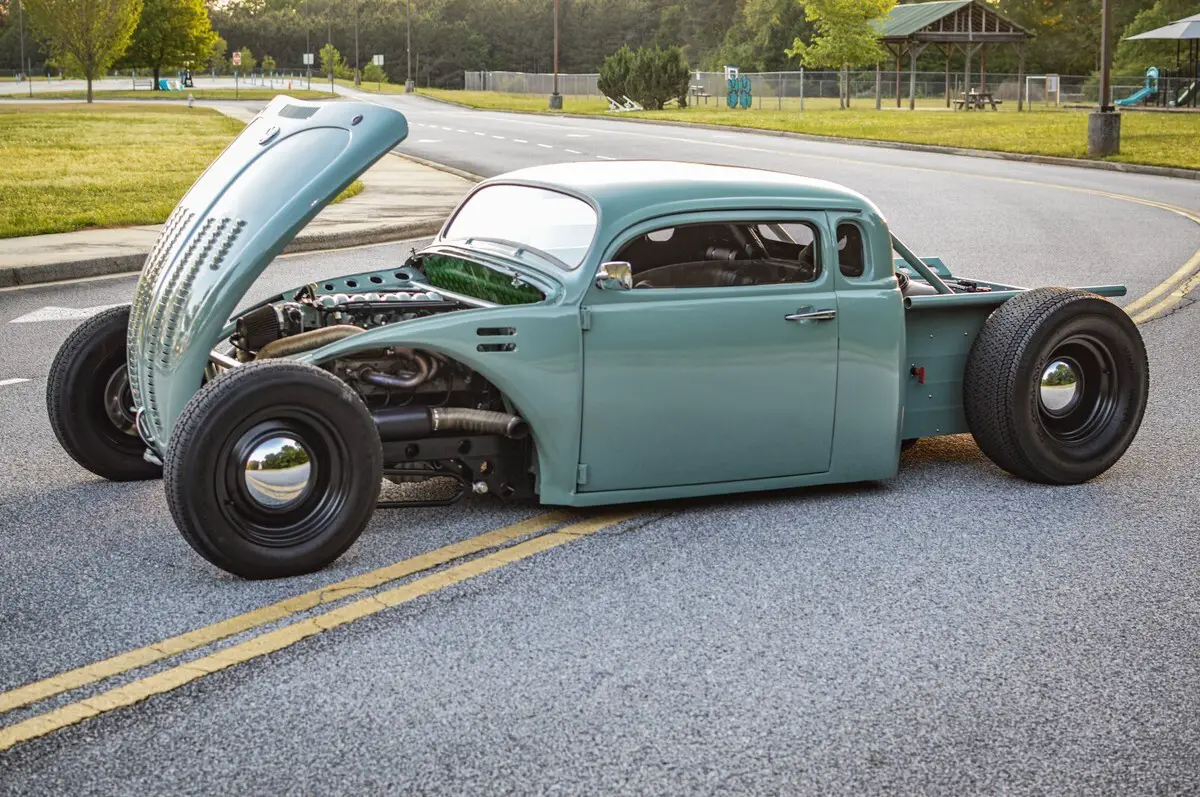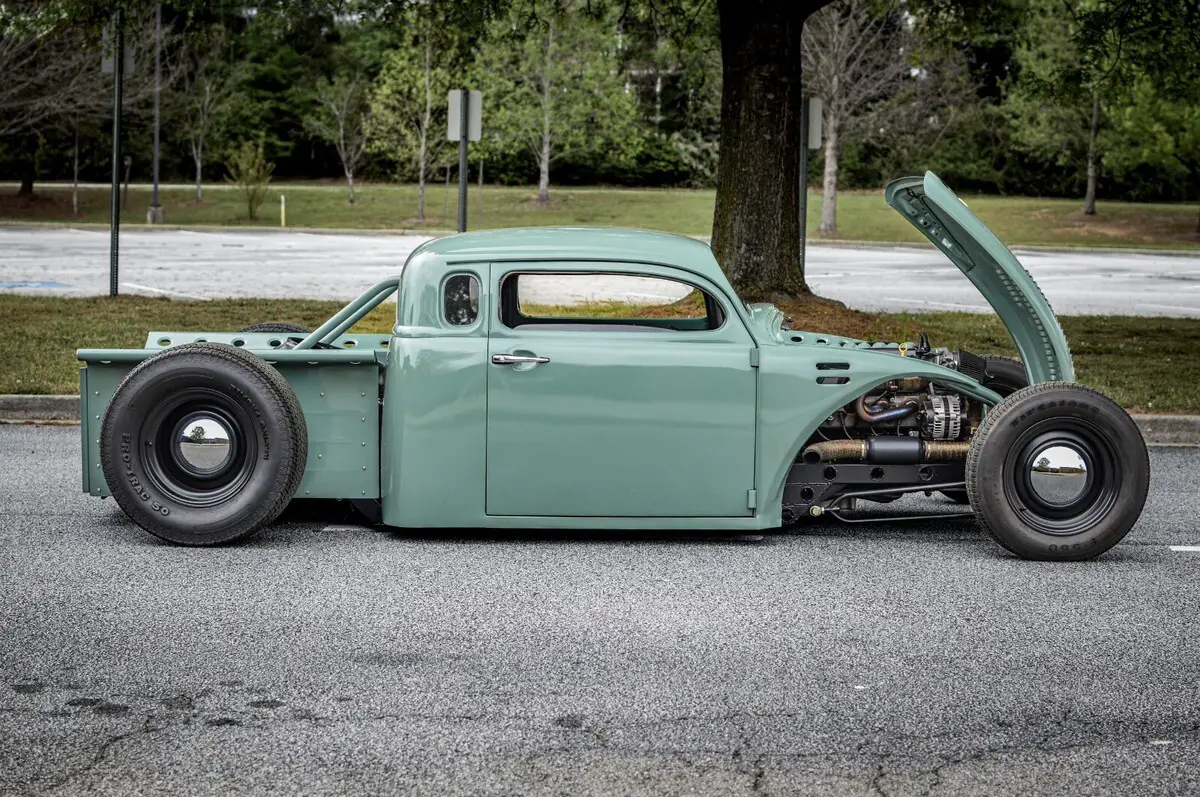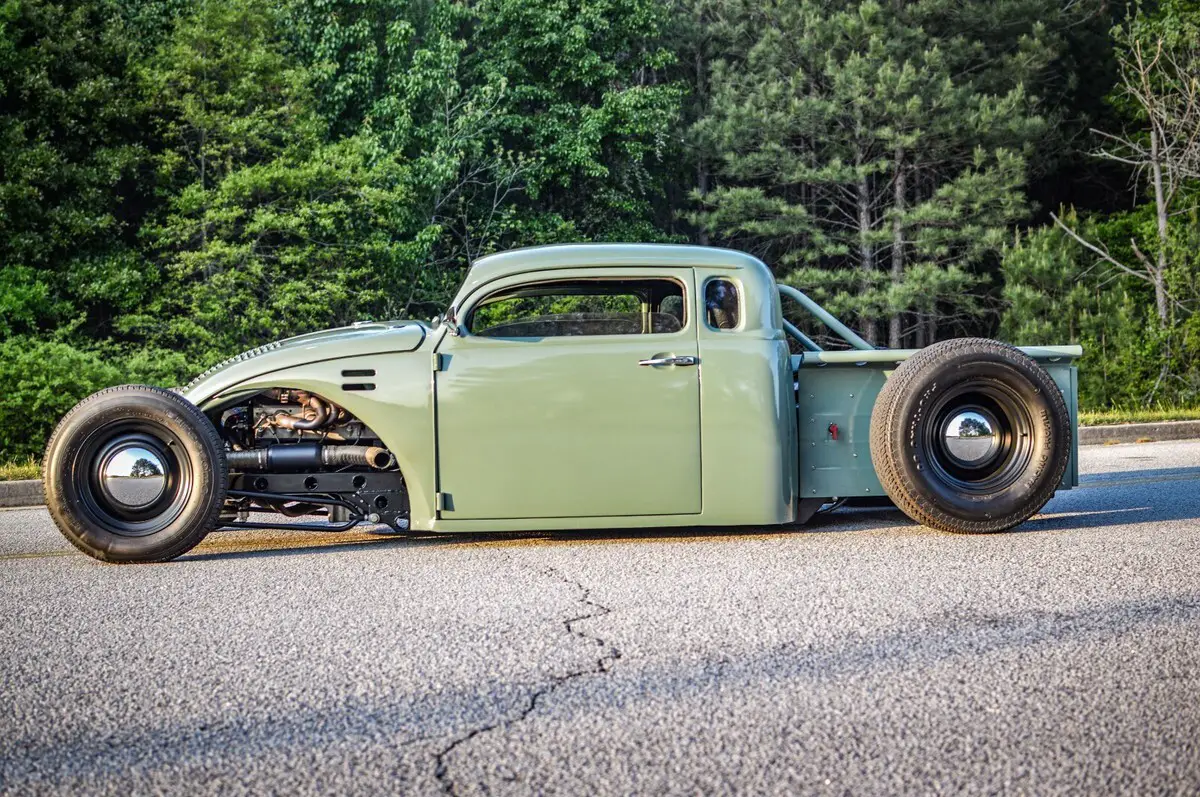 Chopped, channeled, and powered by a 5.3L V8, it blends a Beetle body with a ’49 Chevy cab, a custom-built bed, and a fully hand-fabricated frame with integrated roll cage.