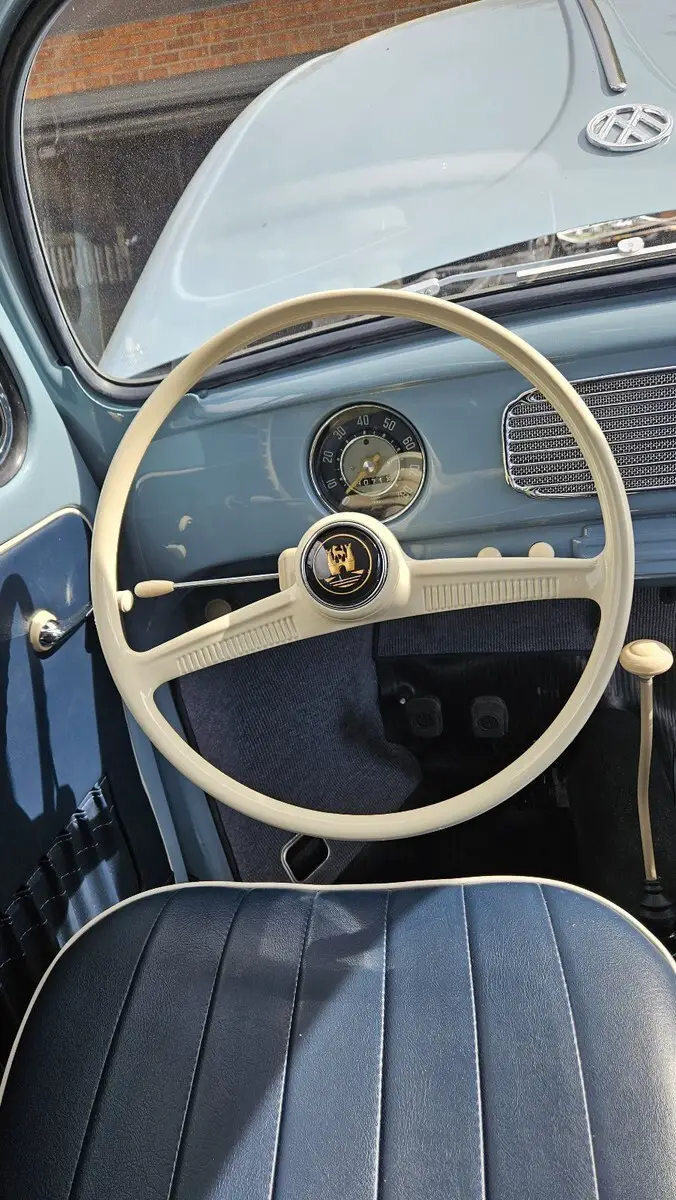 The restoration was completed to match the exact factory specifications shown on its official birth certificate, which is included with the sale. That includes a fully restored navy blue interior with off-white piping and a tan headliner, all brand new from Wolfsburg West.