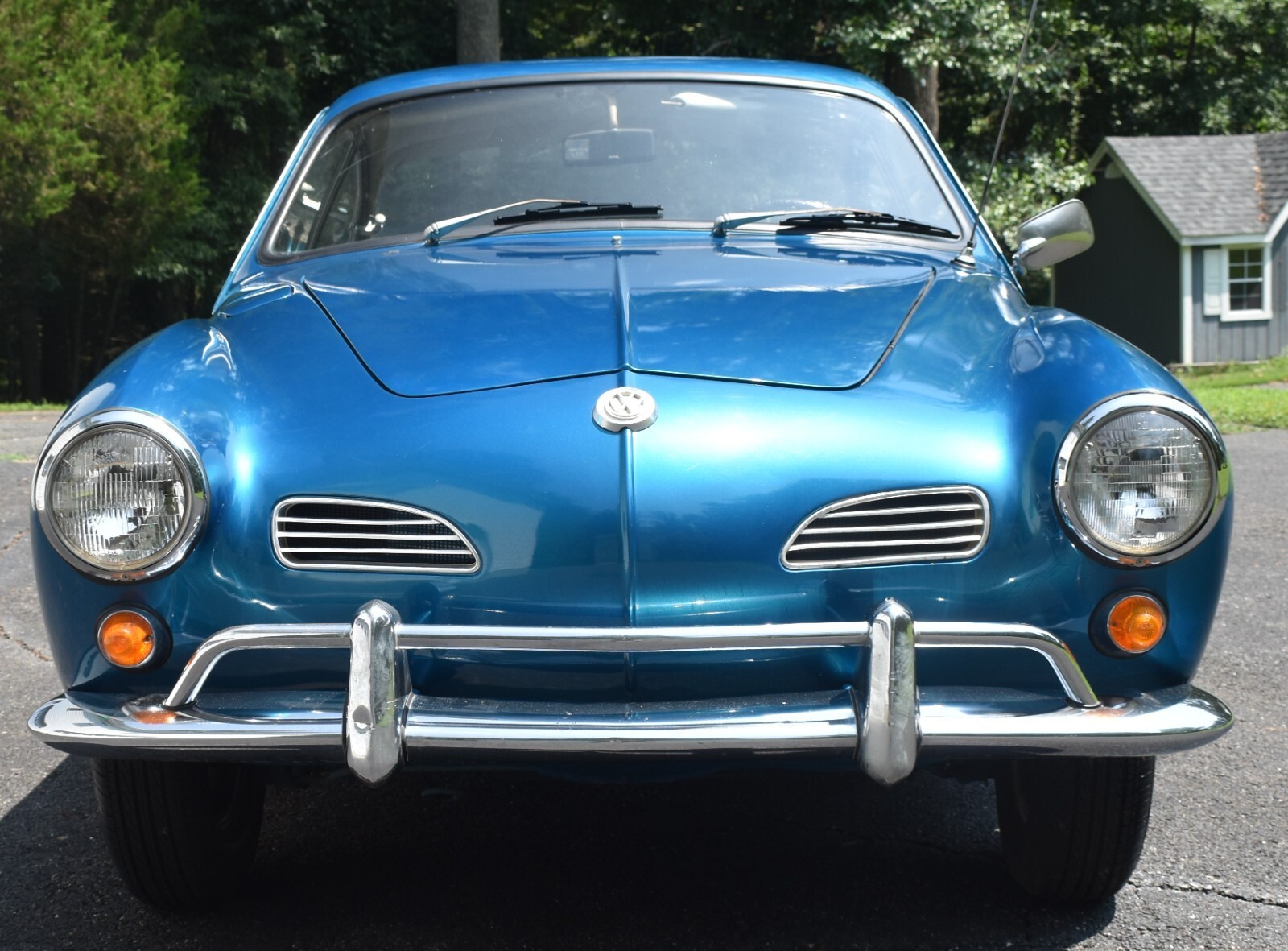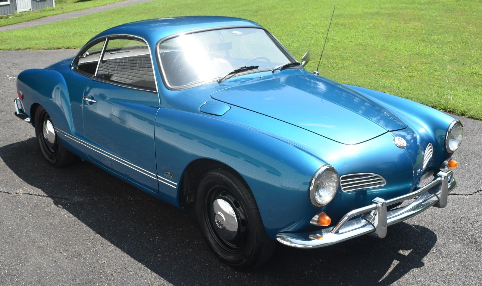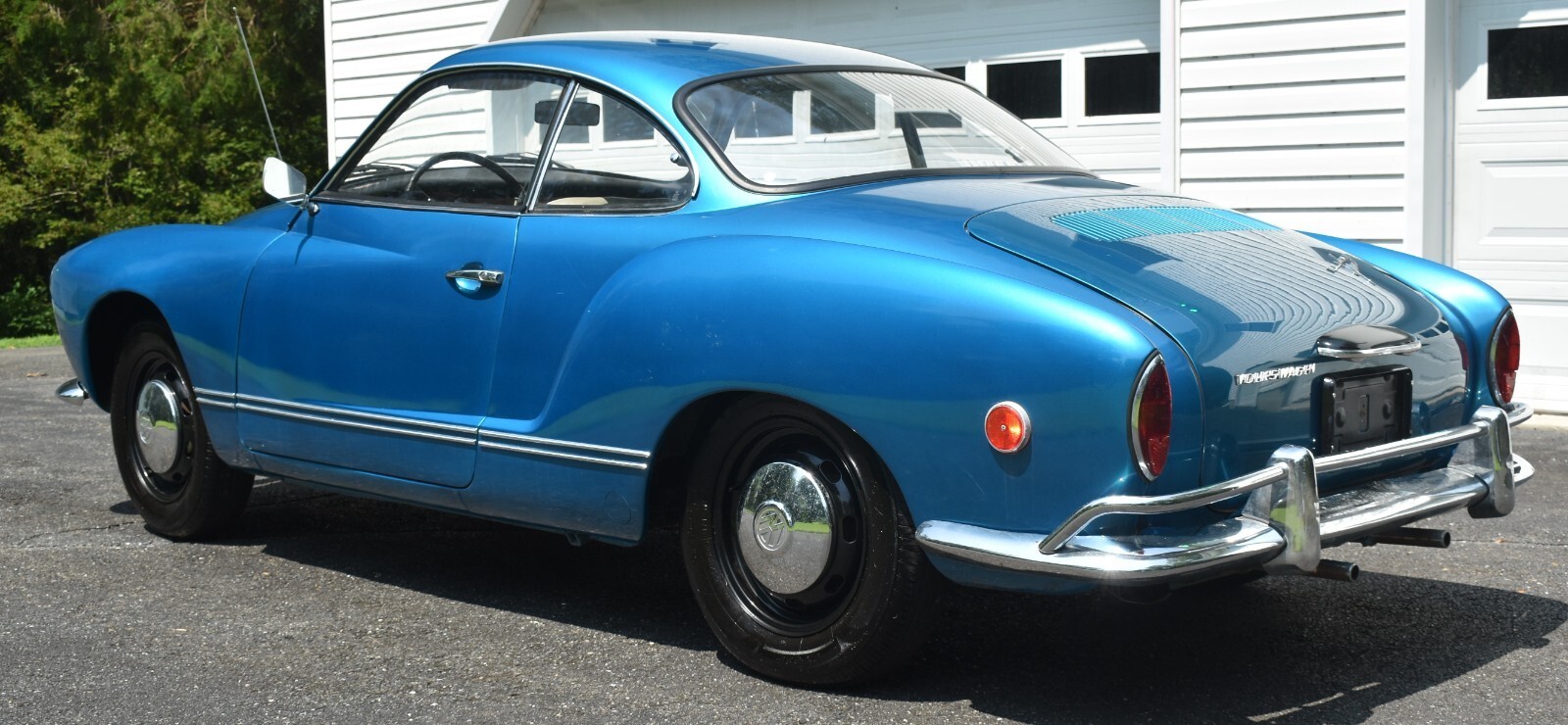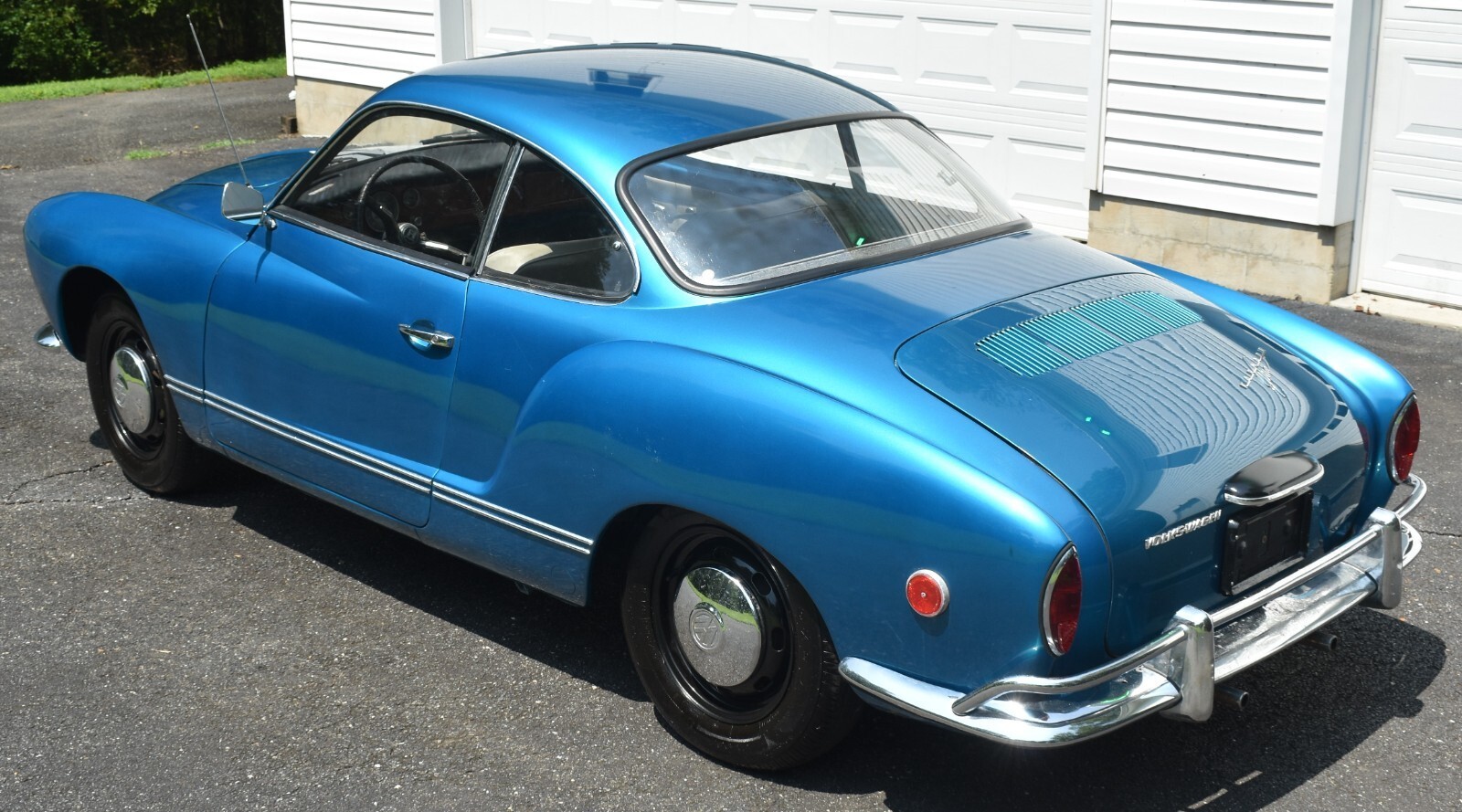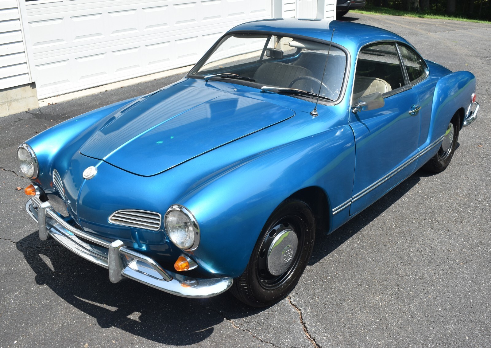 1969 Volkswagen Karmann Ghia Coupe finished in what is believed to be the original Neptune Metallic Blue and a tan interior. It is powered by the factory 1500 cc 4-cylinder VW “flat motor” rated at about 53 horsepower and backed by a manual 4-speed transmission.