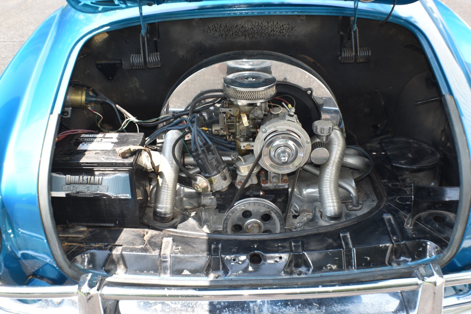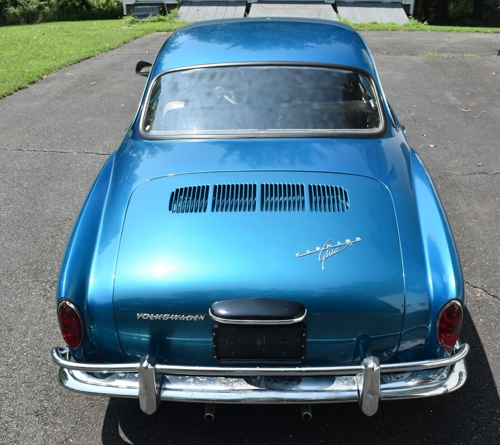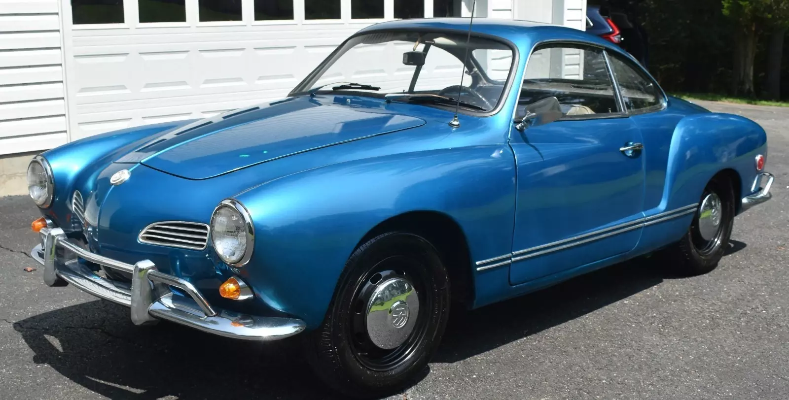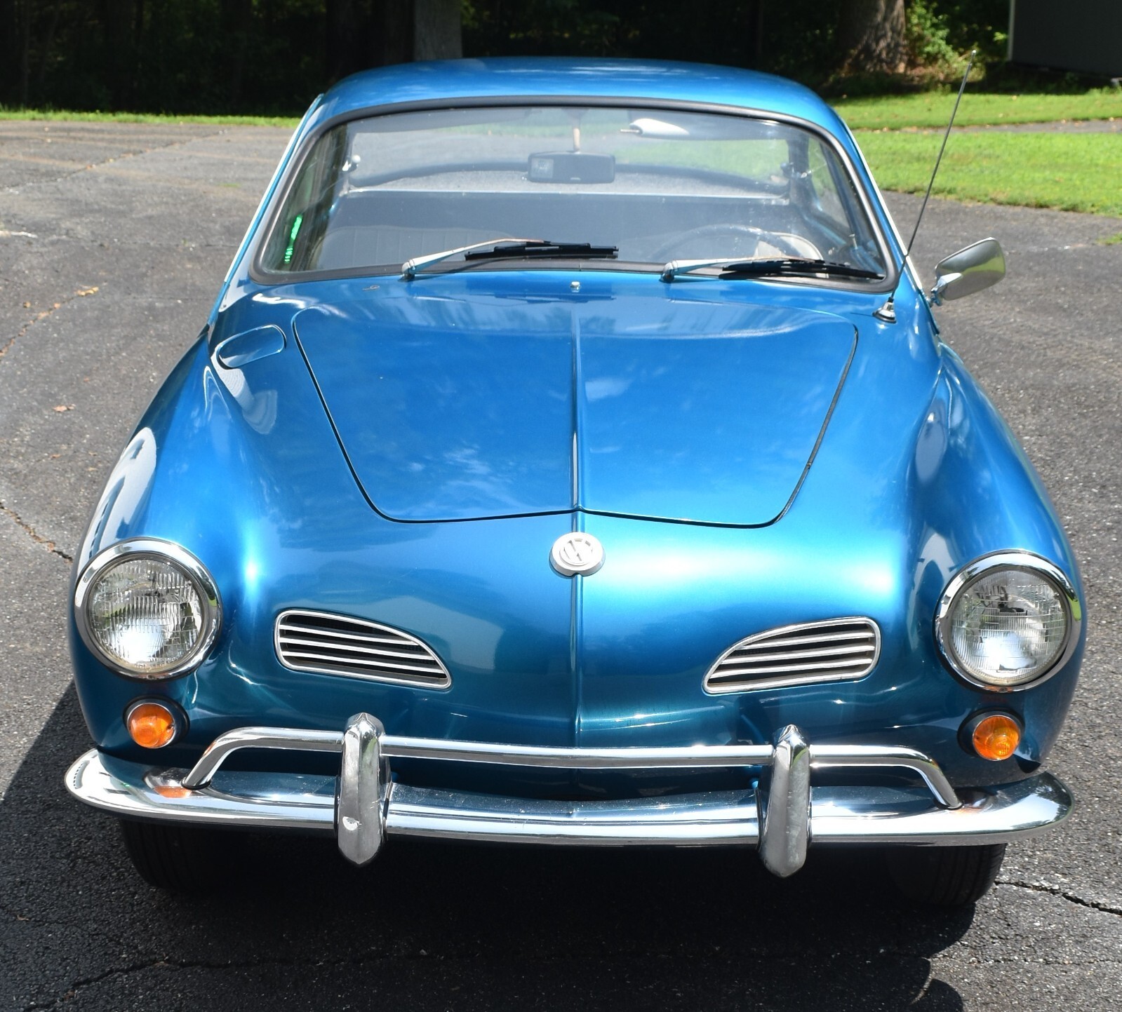 1969 Volkswagen Karmann Ghia Coupe finished in what is believed to be the original Neptune Metallic Blue and a tan interior. It is powered by the factory 1500 cc 4-cylinder VW “flat motor” rated at about 53 horsepower and backed by a manual 4-speed transmission.
