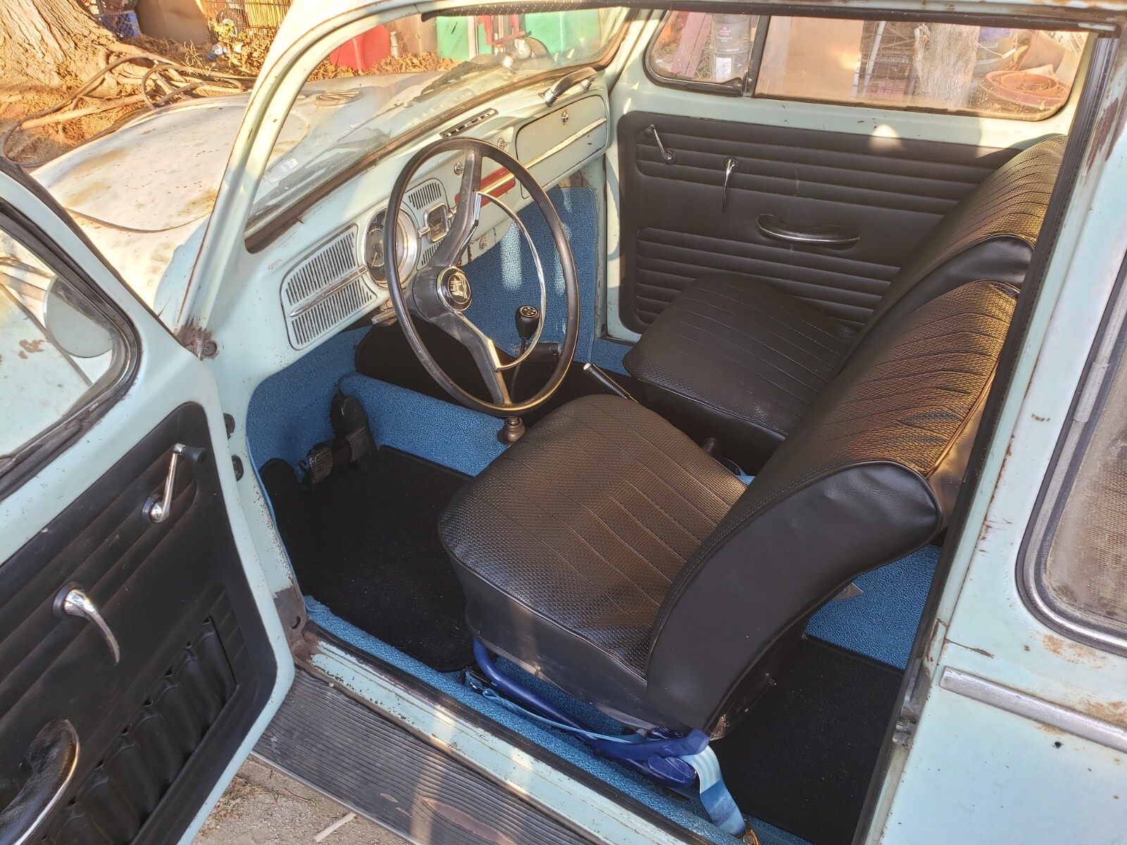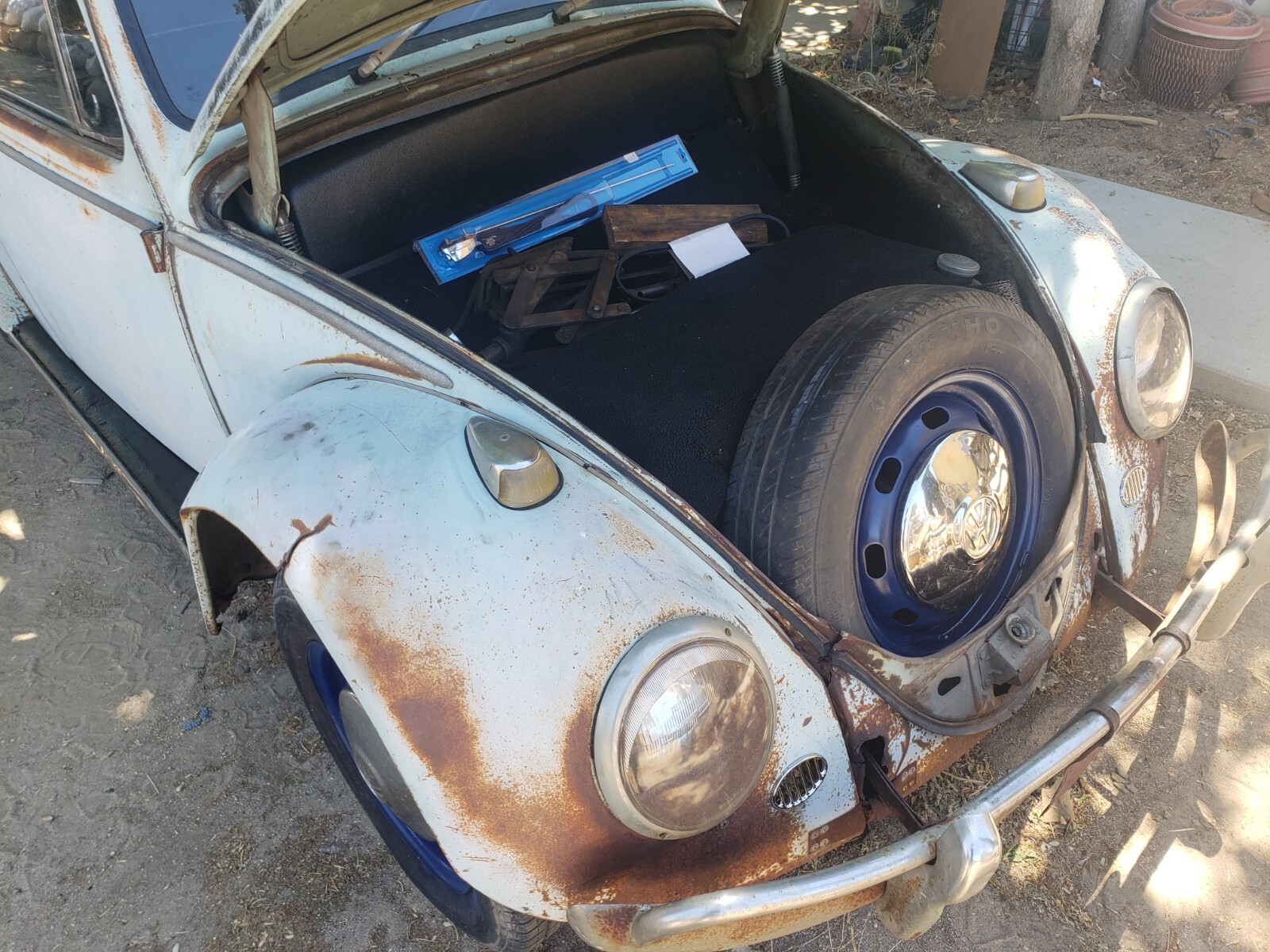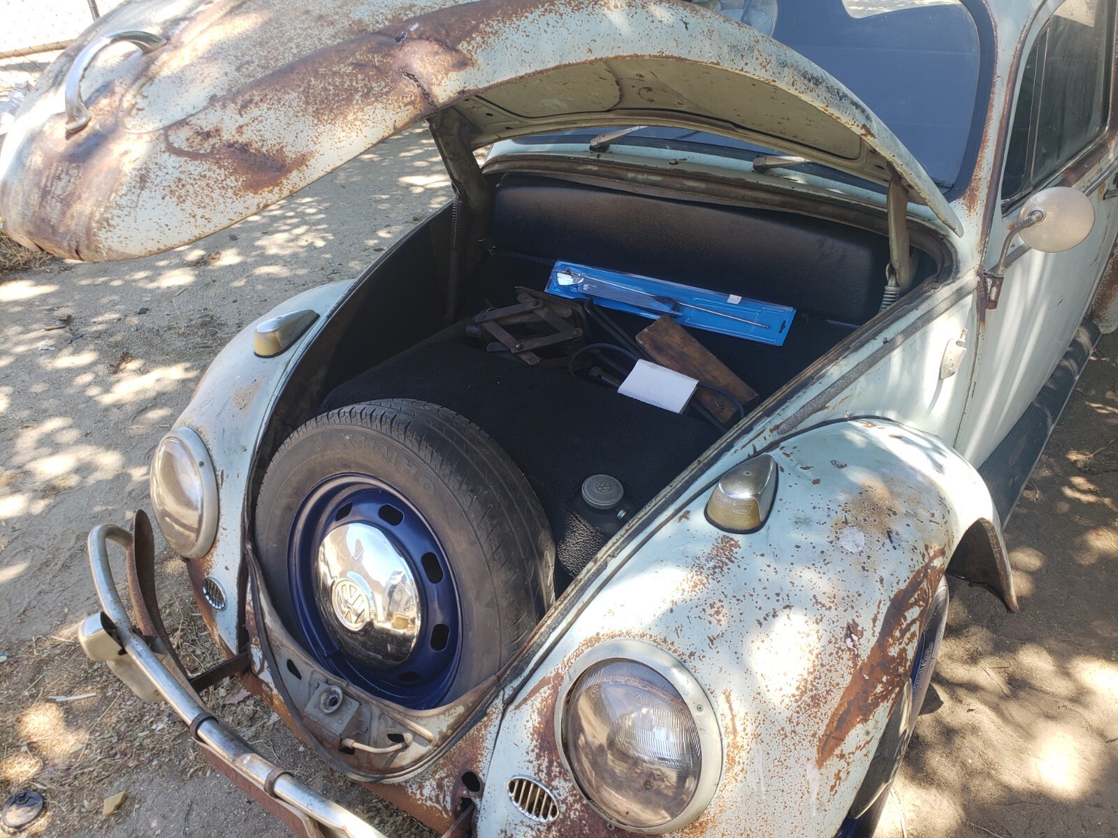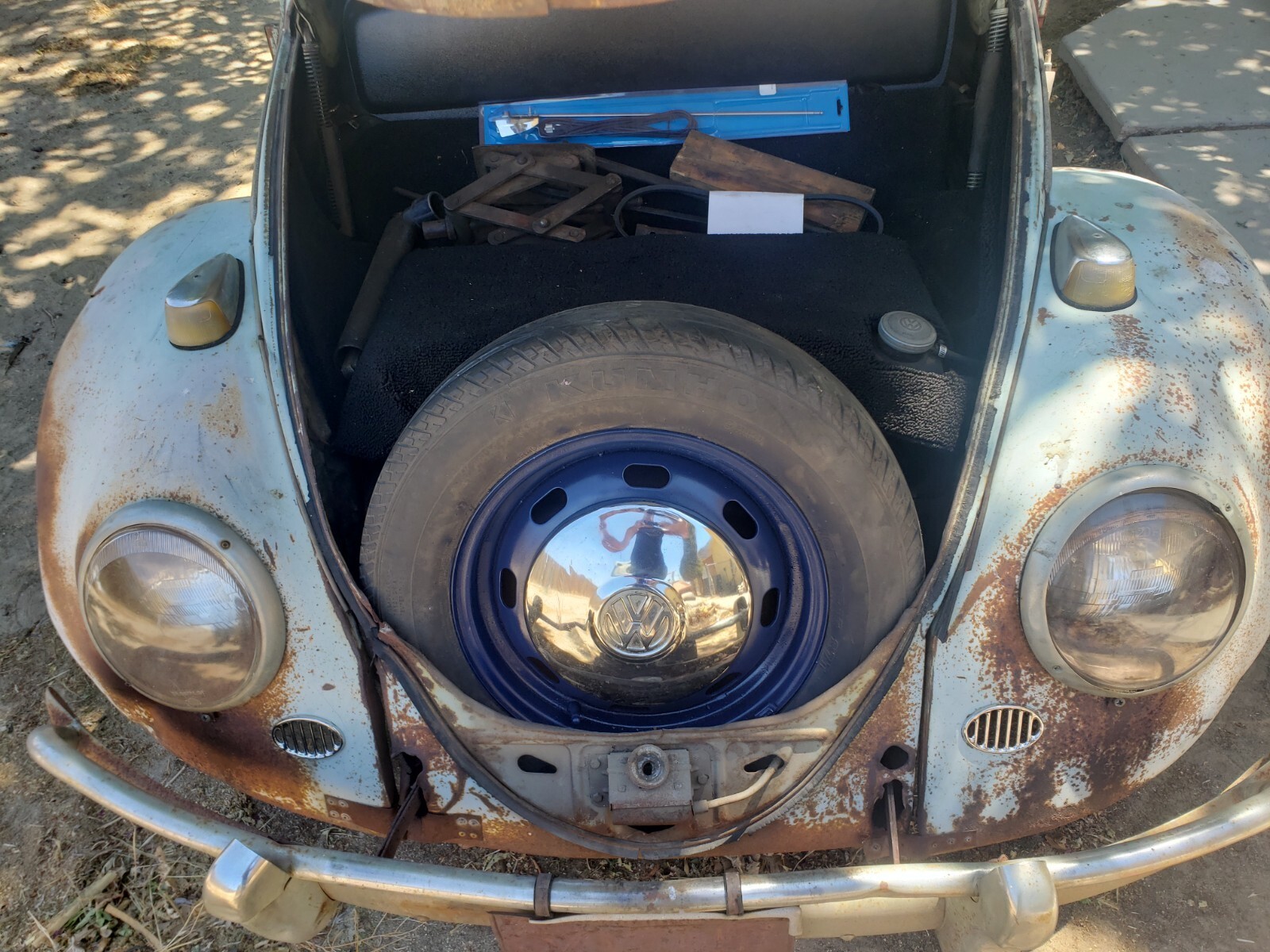 Regarding the exterior, the hood (trunk) area also has new carpeting, and a new electrical wiring cover, which really cleans up that area. The original jack is under the hood, along with a lug-nut breaker bar and prybar for hubcaps. The engine and engine compartment look clean (as stated before, I haven't done anything to the engine yet, except for the oil and fuel). The car comes with five (5) original wheels and hubcaps (which, I'm told are hard to come by), and all tires seem to be holding air. The car has some dings, dents, and scratches, but nothing too extensive. The worst being the front right corner, where it looks like it hit something. I do not see any damage to the chassis, just cosmetic. The hood does not close completely though with the spare tire in it, So I currently have it bungeed in place. Looks like a couple well placed welds, a few minor hammer blows, and a rope-tug on the front corner, and this thing will be close to new again ;-). It should be a super fun and somewhat easy restore, and once completed, the car will be worth twice as much. Or just drive it as is and enjoy the patina.