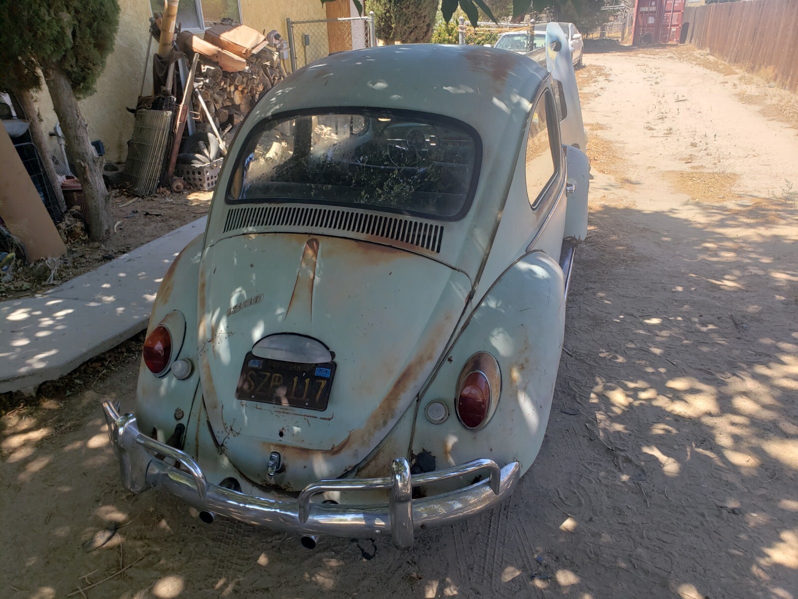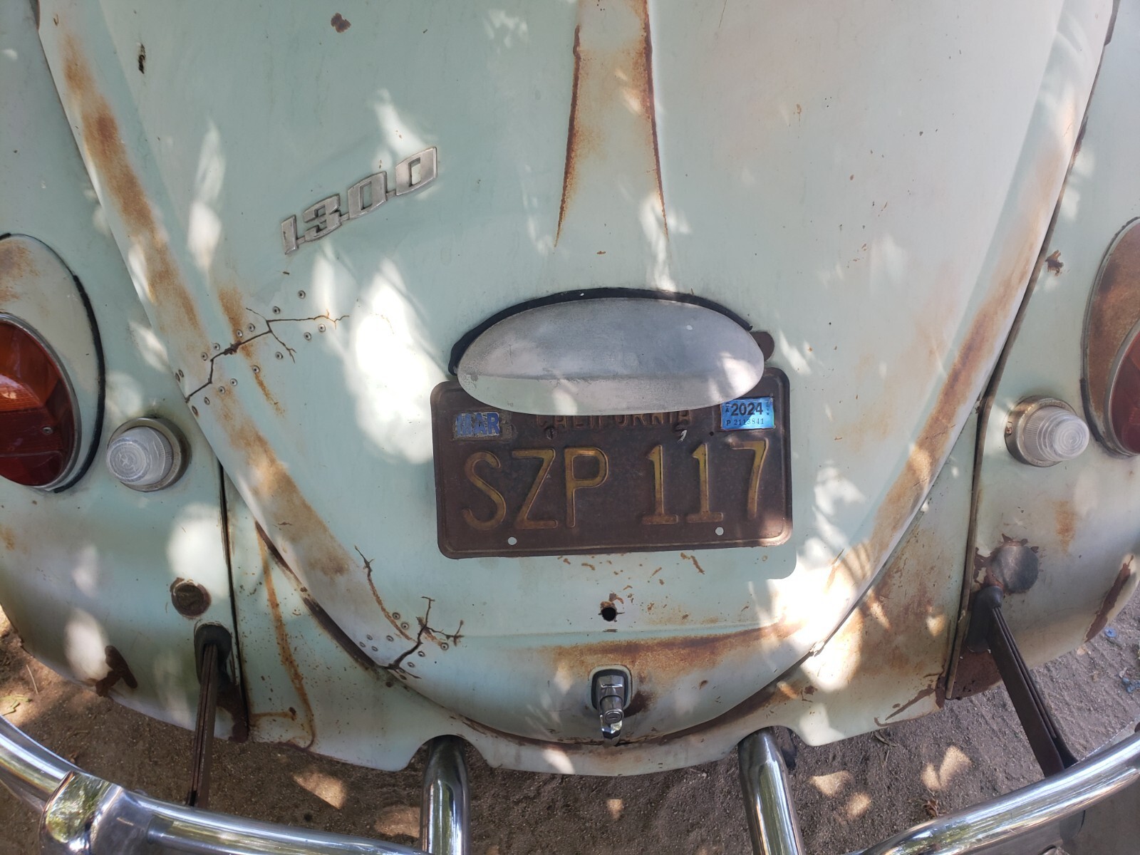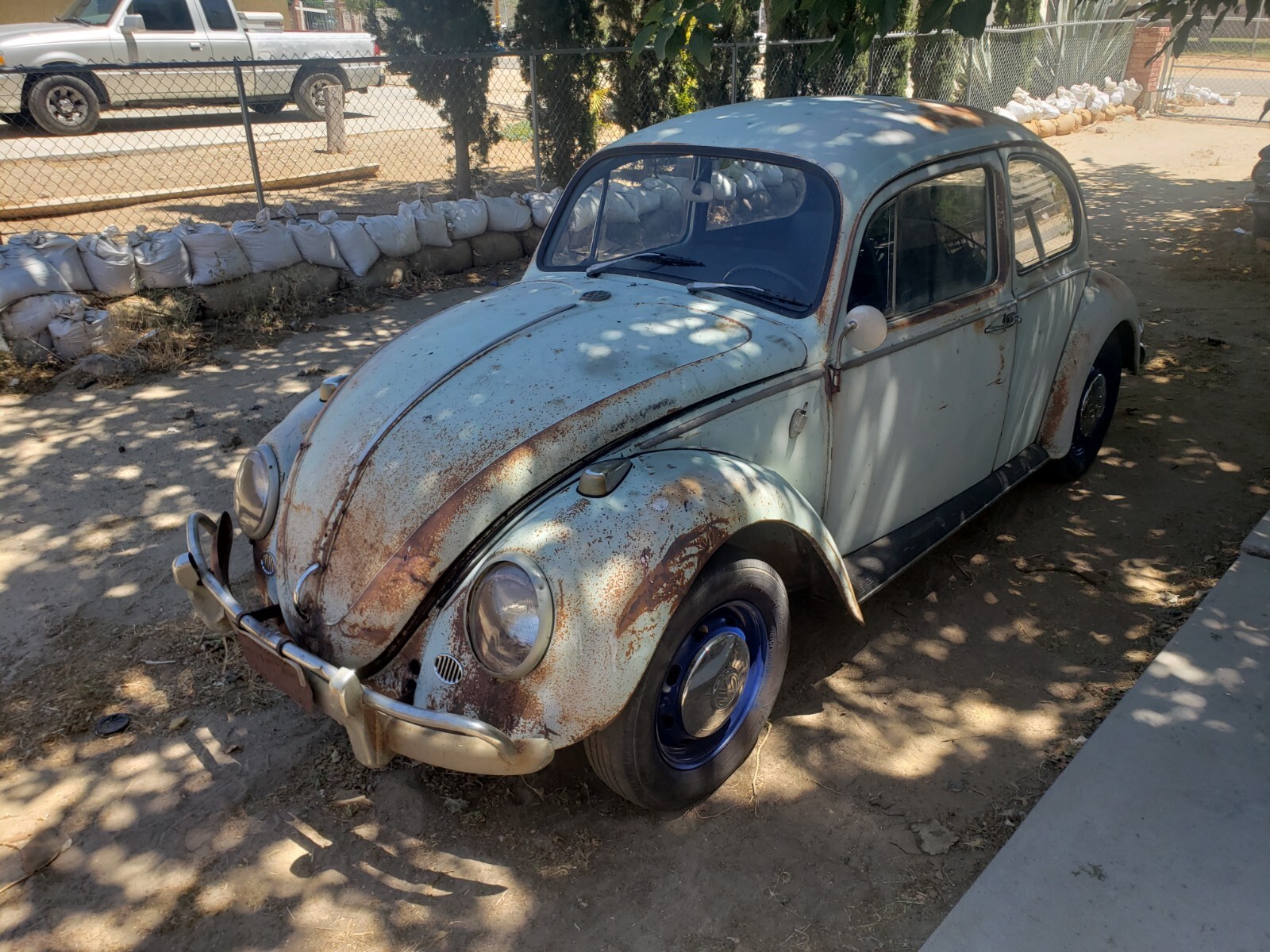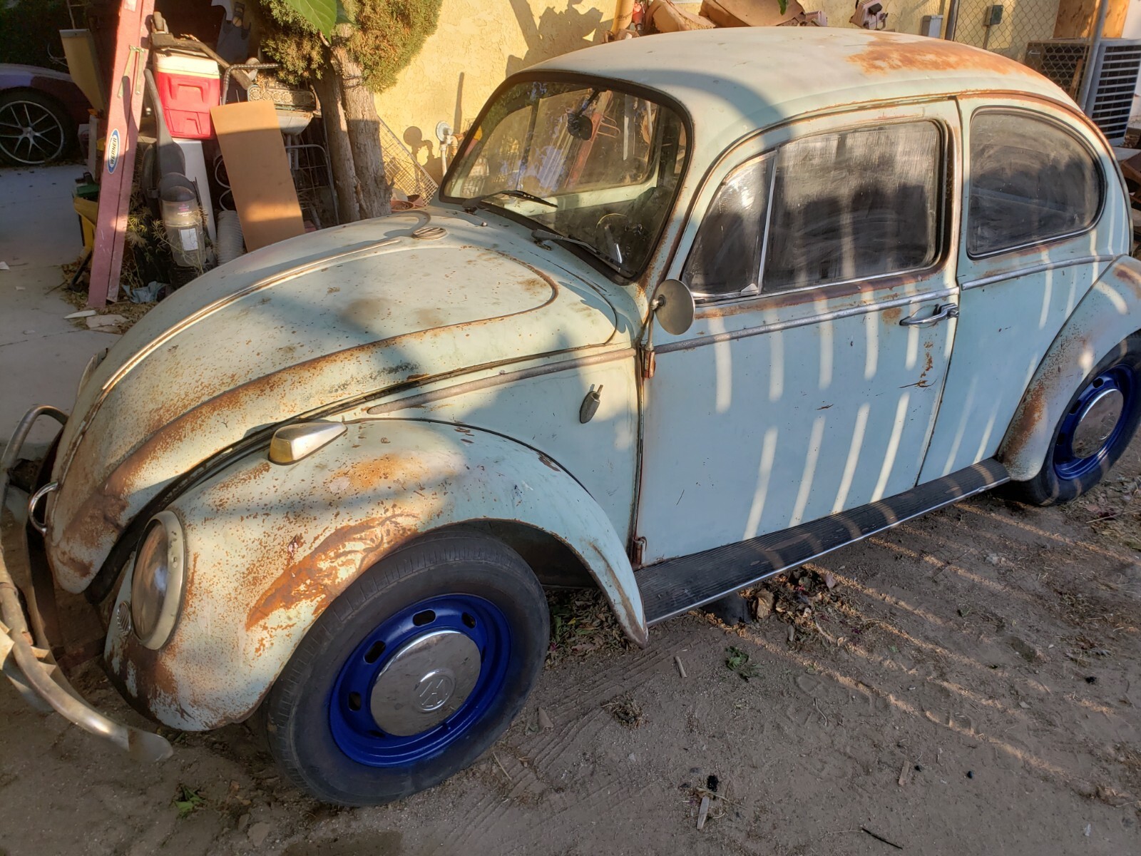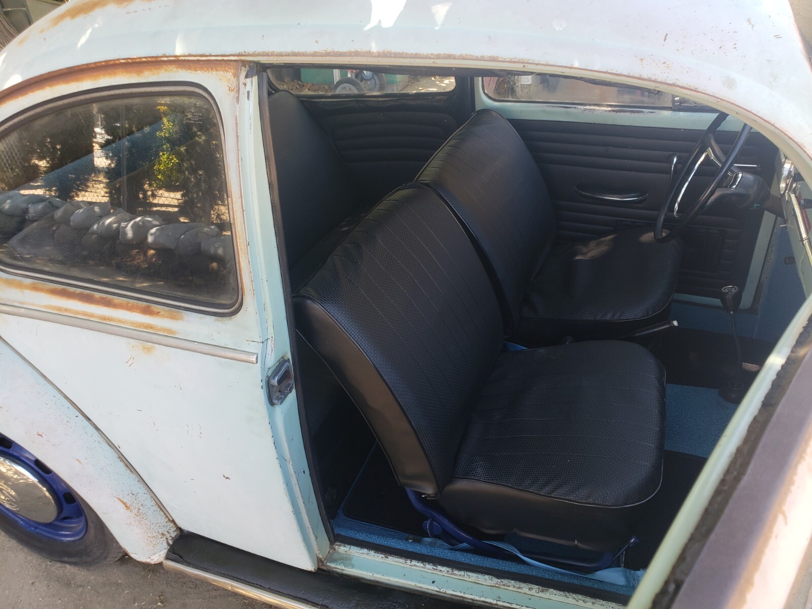 Regarding the exterior, the hood (trunk) area also has new carpeting, and a new electrical wiring cover, which really cleans up that area. The original jack is under the hood, along with a lug-nut breaker bar and prybar for hubcaps. The engine and engine compartment look clean (as stated before, I haven't done anything to the engine yet, except for the oil and fuel). The car comes with five (5) original wheels and hubcaps (which, I'm told are hard to come by), and all tires seem to be holding air. The car has some dings, dents, and scratches, but nothing too extensive. The worst being the front right corner, where it looks like it hit something. I do not see any damage to the chassis, just cosmetic. The hood does not close completely though with the spare tire in it, So I currently have it bungeed in place. Looks like a couple well placed welds, a few minor hammer blows, and a rope-tug on the front corner, and this thing will be close to new again ;-). It should be a super fun and somewhat easy restore, and once completed, the car will be worth twice as much. Or just drive it as is and enjoy the patina.