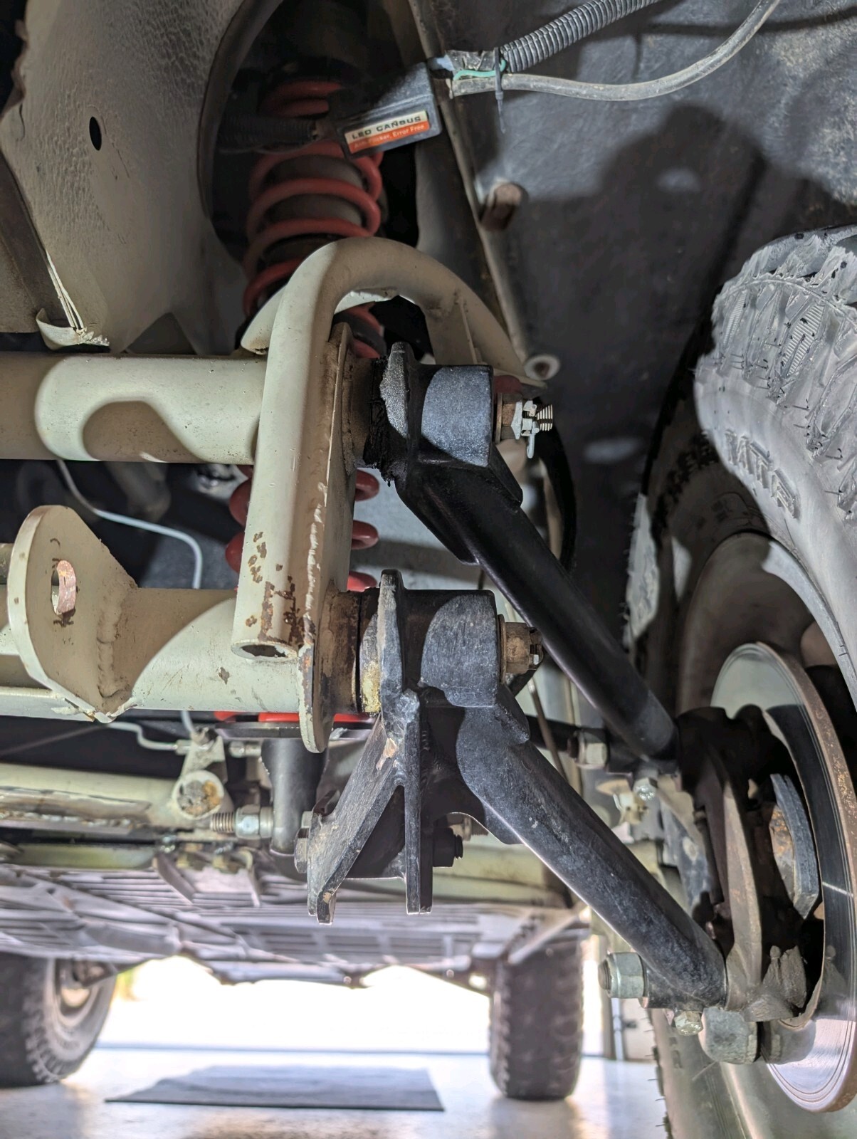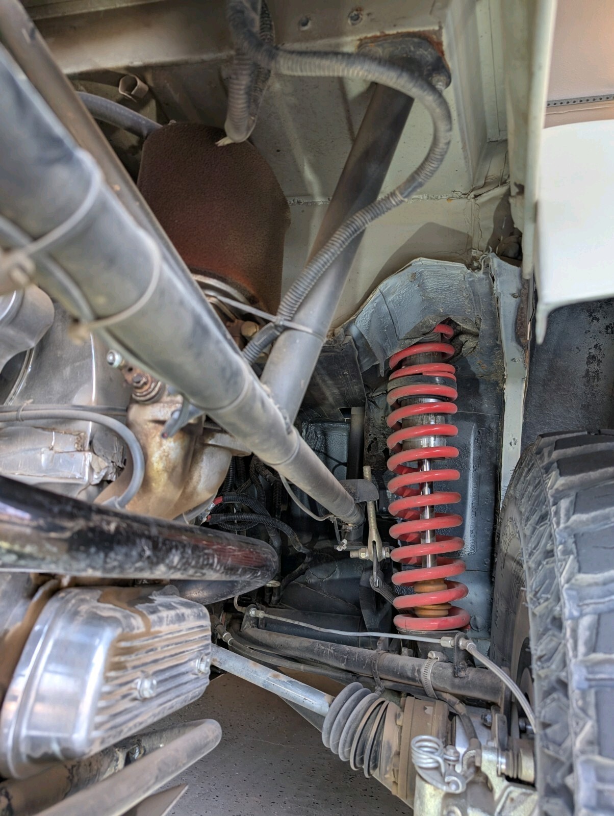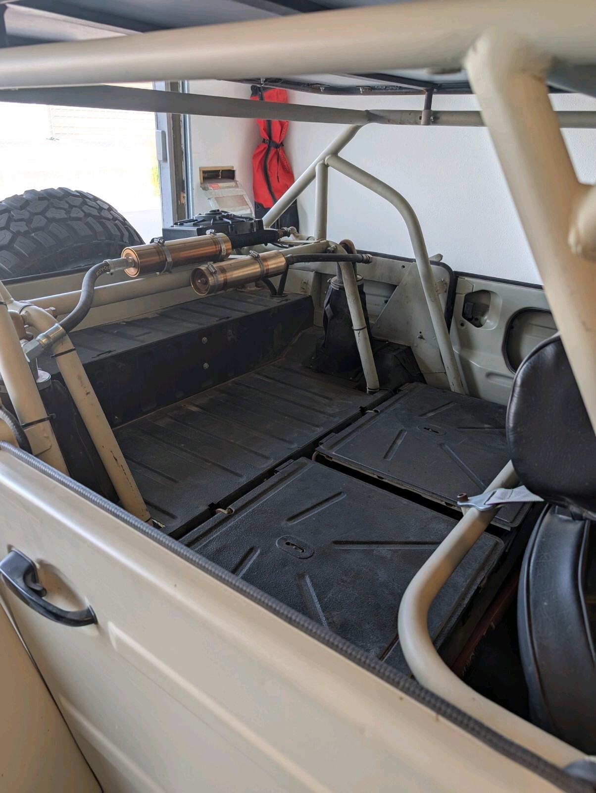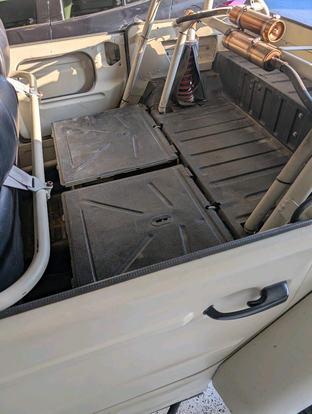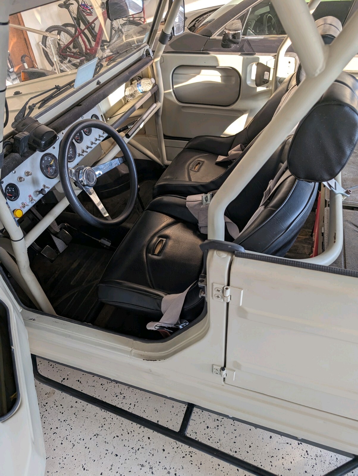 4" taller and wider fiberglass fenders, full roll cage, coilovers with reservoirson all corners,off roadseats with harnesses, 091 buss trans, solid mounts, cromoly 3x3 rear trailing arms, Thing stub axles, EMPI axles and CV joints, EMPI wide 5 disc brakes, cromoly 6" wider front beam with 4" longer trailing arms, EMPI spindles with additional bracing, electric power steering, rack and pinion with 1" tie rods with hiem ends.