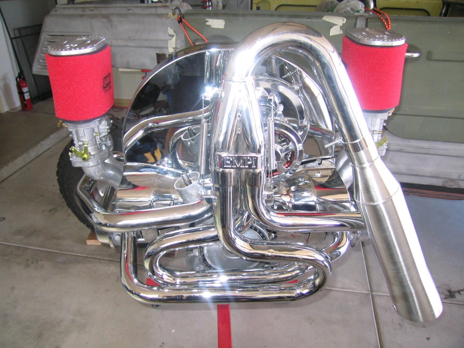 Dual CB 44mm MXHP Webers w/ off road 6" foam filters, port matched manifolds, hex linkage, 009 distributor, high output coil, external oil filter, external oil cooler w/ electric fan, 75 amp chrome alternator, high output coil, external oil filter, external oil cooler w/ electric fan, 75 amp chrome alternator, chrome sheet metal, oil temp & pressure sensors, EMPI off road exhaust w/ stainless muffler & spark arrestor, & welded fan. Hear it run, video available with photos. I didn't have a speedo for first test runs but I think there is less than 5000 miles on it.