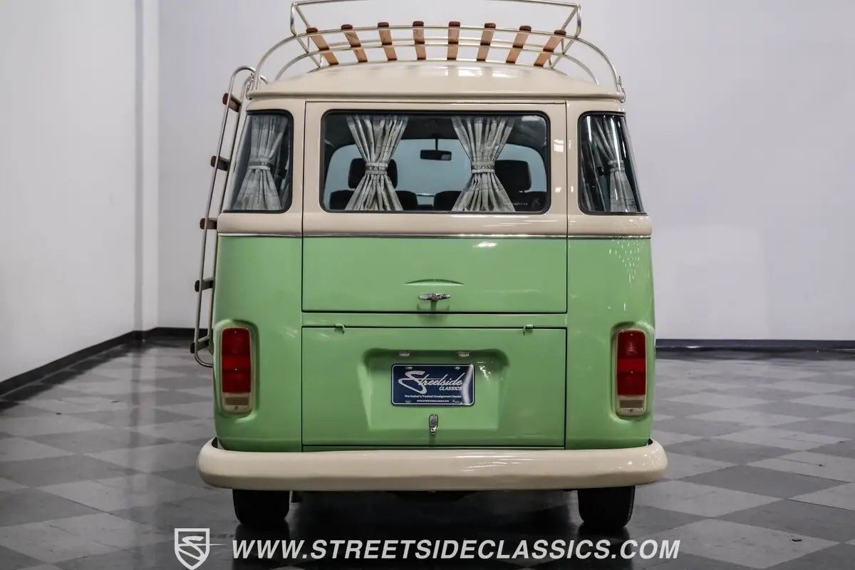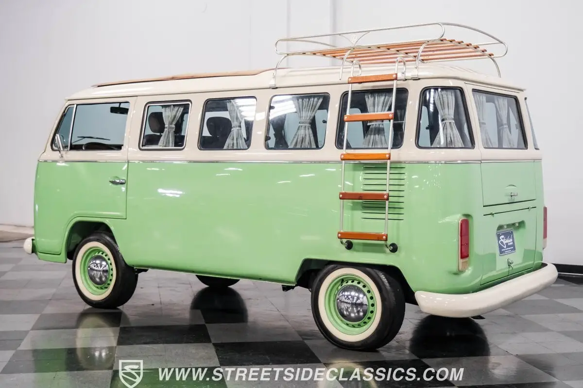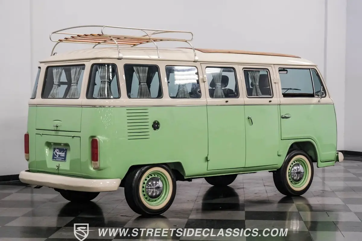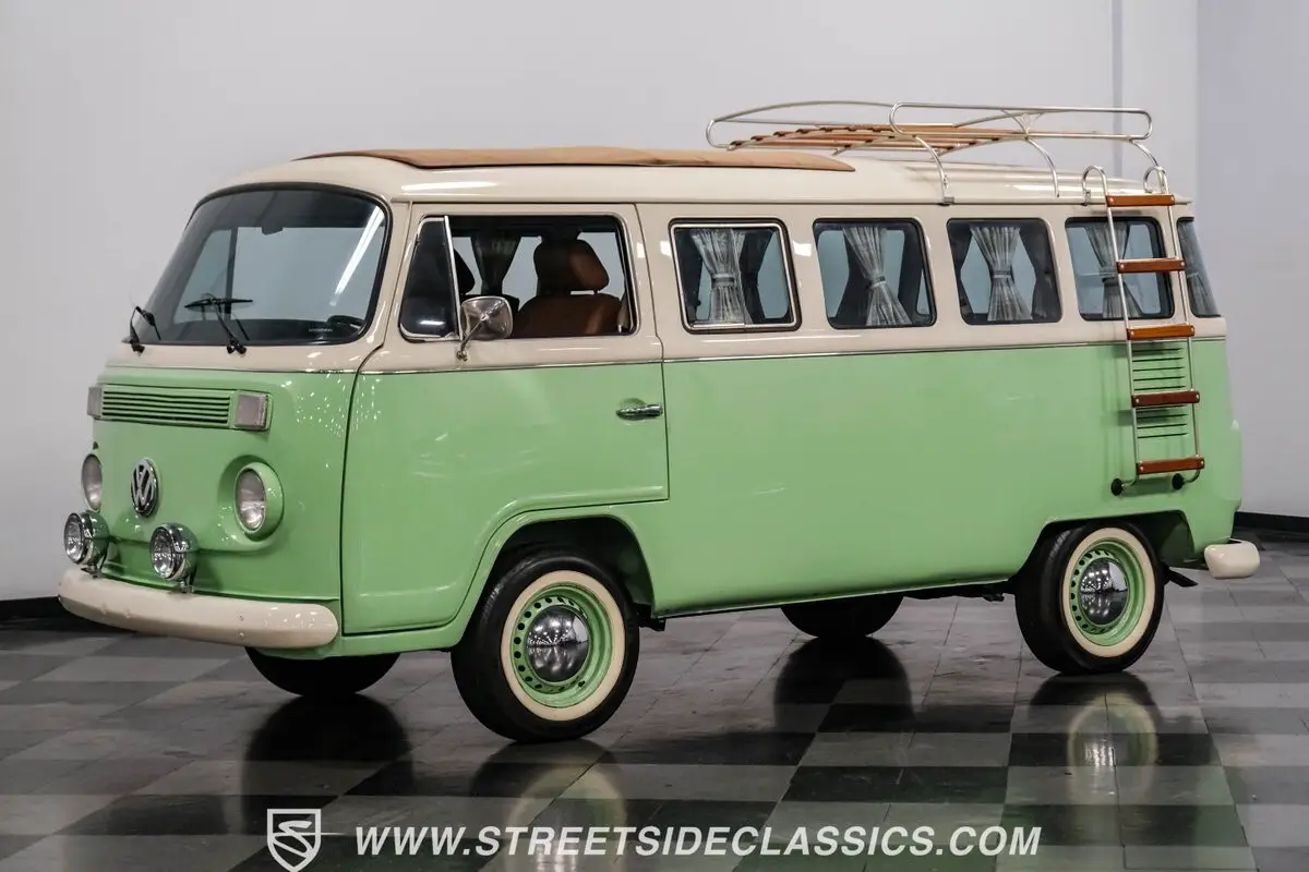 With a look that blends generations, this 1994 Volkswagen Type 2 13 Window Deluxe Bus wears Light Green and Cream paint with that unmistakable South American-market combo-late-model front sheet metal paired with early-style panoramic glass. The roof rack and matching ladder accent the wraparound rear window and rounded bodywork. Rolling on color-keyed 14" steel wheels wrapped in 185/80R14 tires with whitewall trim, this vehicle captures that split-window silhouette with a unique twist. Subtle trim, painted bumpers, and chrome trim round out the retro vibe with just the right attitude.