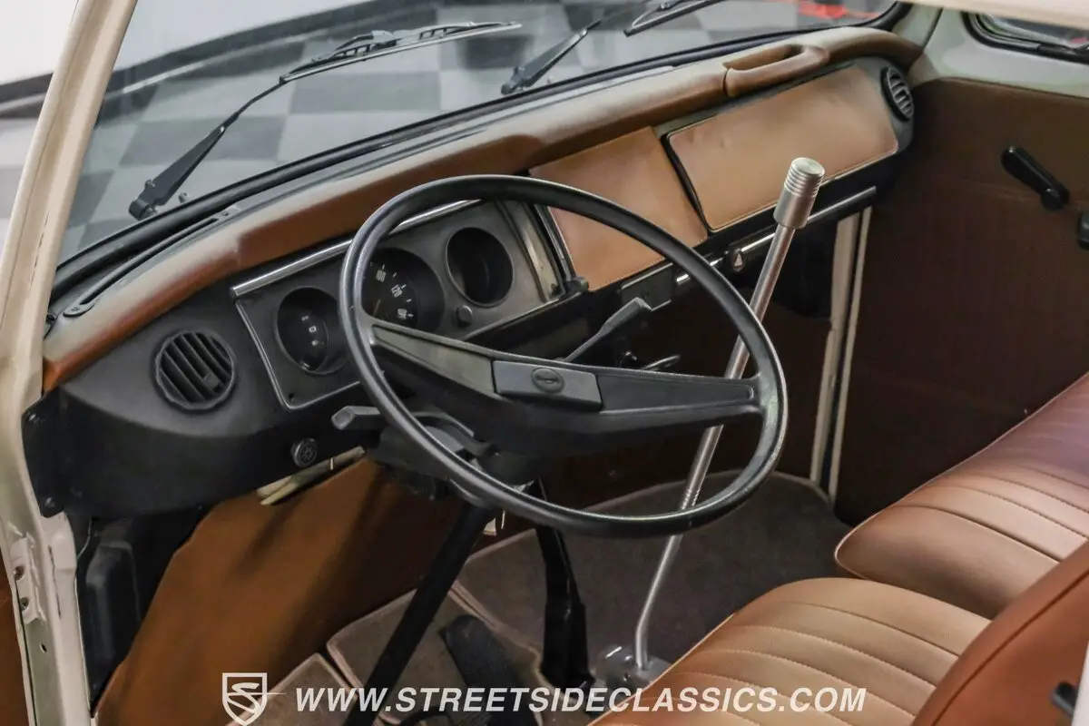Brown vinyl covers all three bench rows in this well-trimmed interior, built to seat up to nine across split-bench configurations. Matching door panels, a dash pad, and fresh carpet tie it all together while accent drapes ride just inside the side glass. The spare tire cover adds a finished look at the rear. An aftermarket tall floor shifter punctuates the utilitarian cabin with a bit of attitude, and the original-style layout retains its functionality without overcomplication. There's no radio onboard, just the mechanical rhythm of a machine doing what it was built to do.