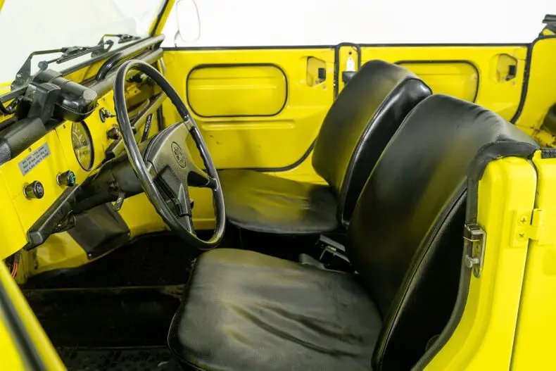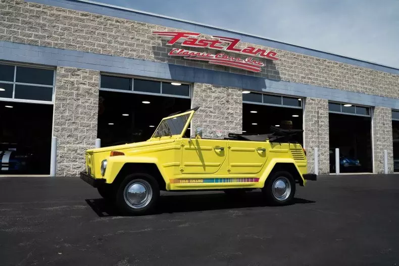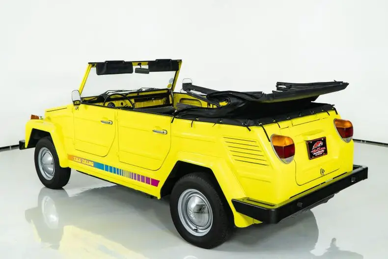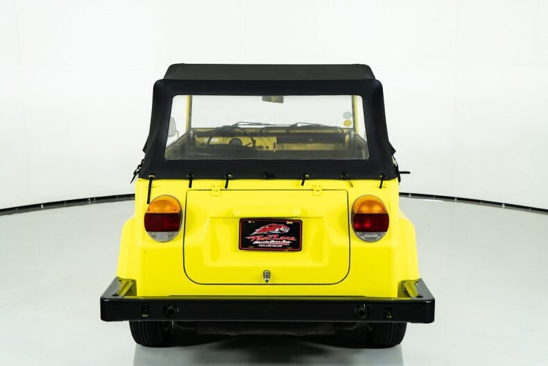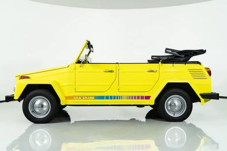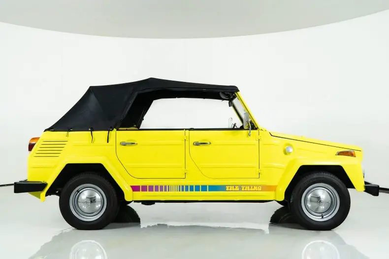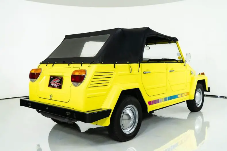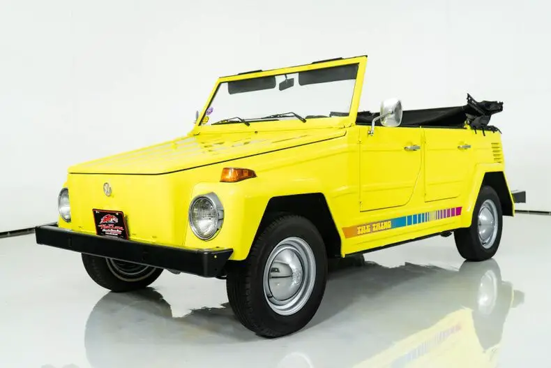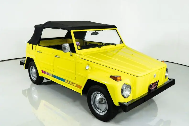 This 1973 Volkswagen Type 181 "Thing" for sale has a 1.6 Liter 4 Cylinder 8 Valve Boxer Engine, Single Barrel Carburetor, 4 Speed Manual Transmission, Yellow Exterior, with Vintage Inspired Graphics, Black Vinyl Seats, Bucket Front Seats, Fold Down Windshield, Front and Rear Seat Belts, VDO Gauges, Chrome Baby Moon Hubcaps, Showing 38,985 Miles, Unique Styling-There's Nothing Else Like it On The Road!