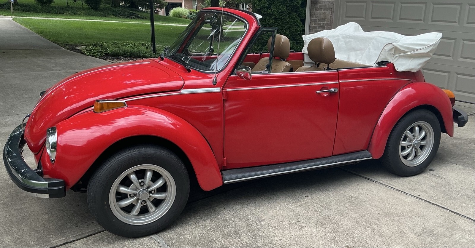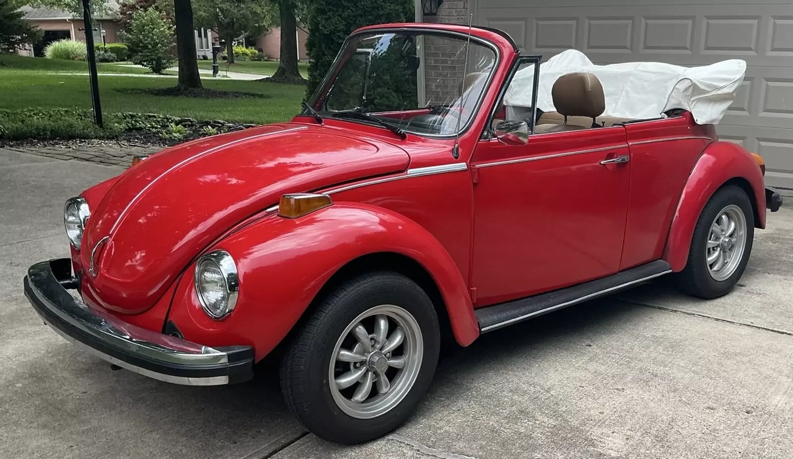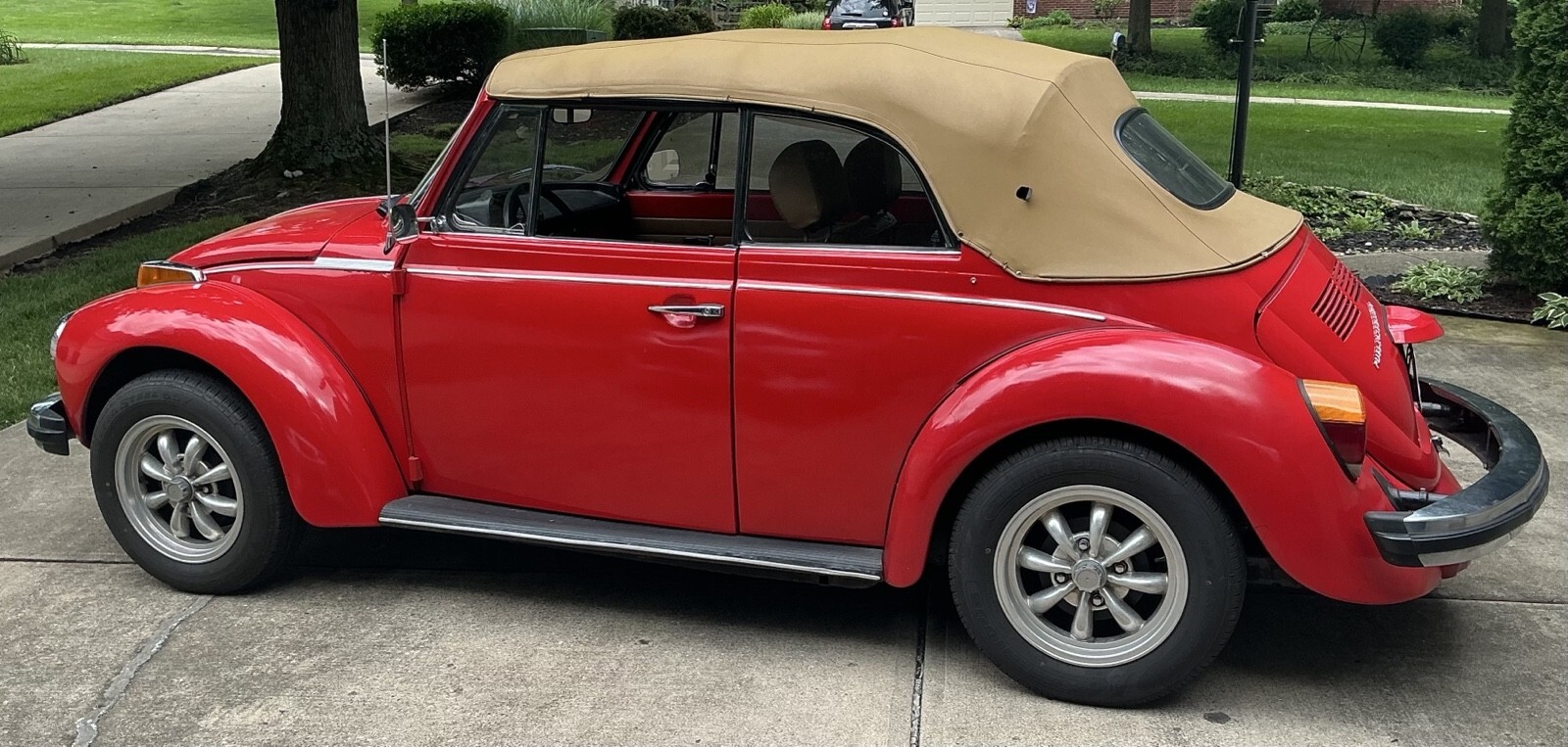 VW Super Beetle in red with tan interior. The car body, paint and floors were restored around 10 years ago, and the interior recently with new seat covers, carpet, door panels, etc. The car was originally yellow but the color was changed to red. The tan top has a small tear but I am including a new uninstalled white top which can replace the tan top. The car has been well maintained and had recent new clutch, pressure plate and several new gaskets while the engine was out. Also installed were new heads as the original heads and valves needed upgraded and new fuel pump, injectors, pertronix ignition. Also the front end suspension and steering have had new seals and bushings installed and then aligned. The interior has installed tach, voltage, temperature, oil pressure gauges and am/fm radio. The heat system has been repaired and useable as this feature is not always working in several older Beetles I have observed so you can drive it year round. Very fun to drive and easily keeps up with traffic 65 mph and under on back 2 lane roads where I have driven it the most. I am also including a new rear drivers fender as a deer ran into the side and current fender is repaired by average at best. Probably other upgrades that are slipping my mind. Item is sold “as is”. Will assist for transport and car is located only 1 mile off I75 in Northern Ky.