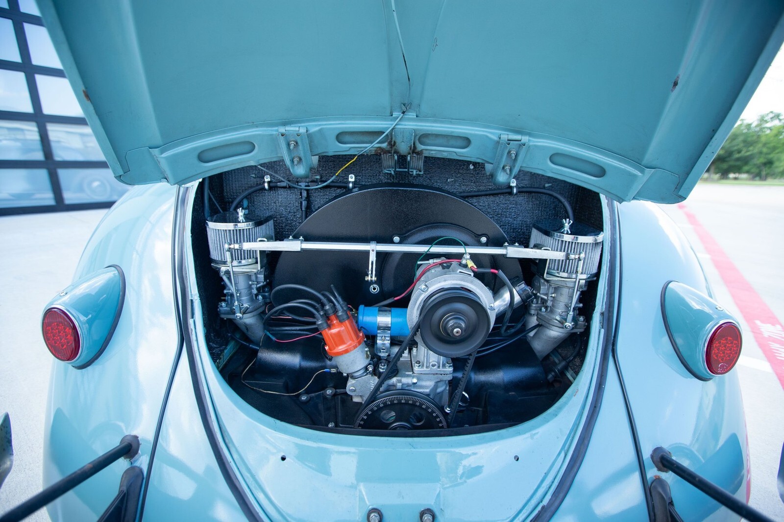 A freshly built 2276cc motor powers this Beetle, featuring a 94mm bore, 82mm stroke, 9.5:1 compression, EMPI HPMX dual carburetors, AutoLinea oil cooler, stainless lines, low oil sump, EMPI dual exhaust, and a 12v electric oil cooler fan. The drivetrain includes a Pro Swing 4-speed manual transmission, Pro-Street suspension kit, new shocks, and four-wheel disc brakes. A 12v electrical conversion with a new coil and LED headlights completes the mechanical upgrades.