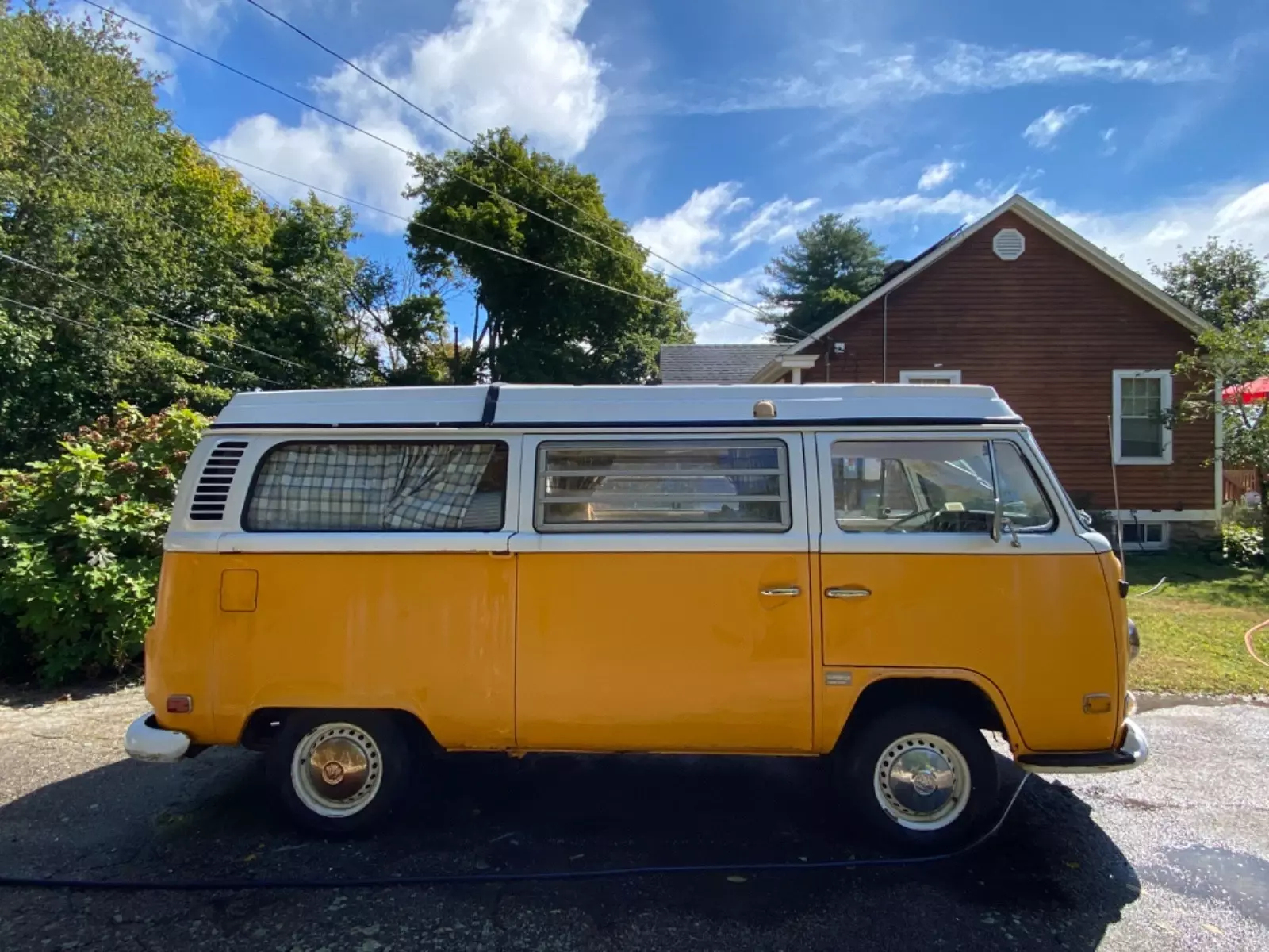 This is a classic 1972 VW Westfalia Type 2 camper van in the iconic orange and white two-tone with the full original Westfalia pop-top. It has the complete, authentic Westy camper interior, straight body lines, and the unmistakable charm these early buses are known for. Everywhere you drive, people wave — this van makes people happy.