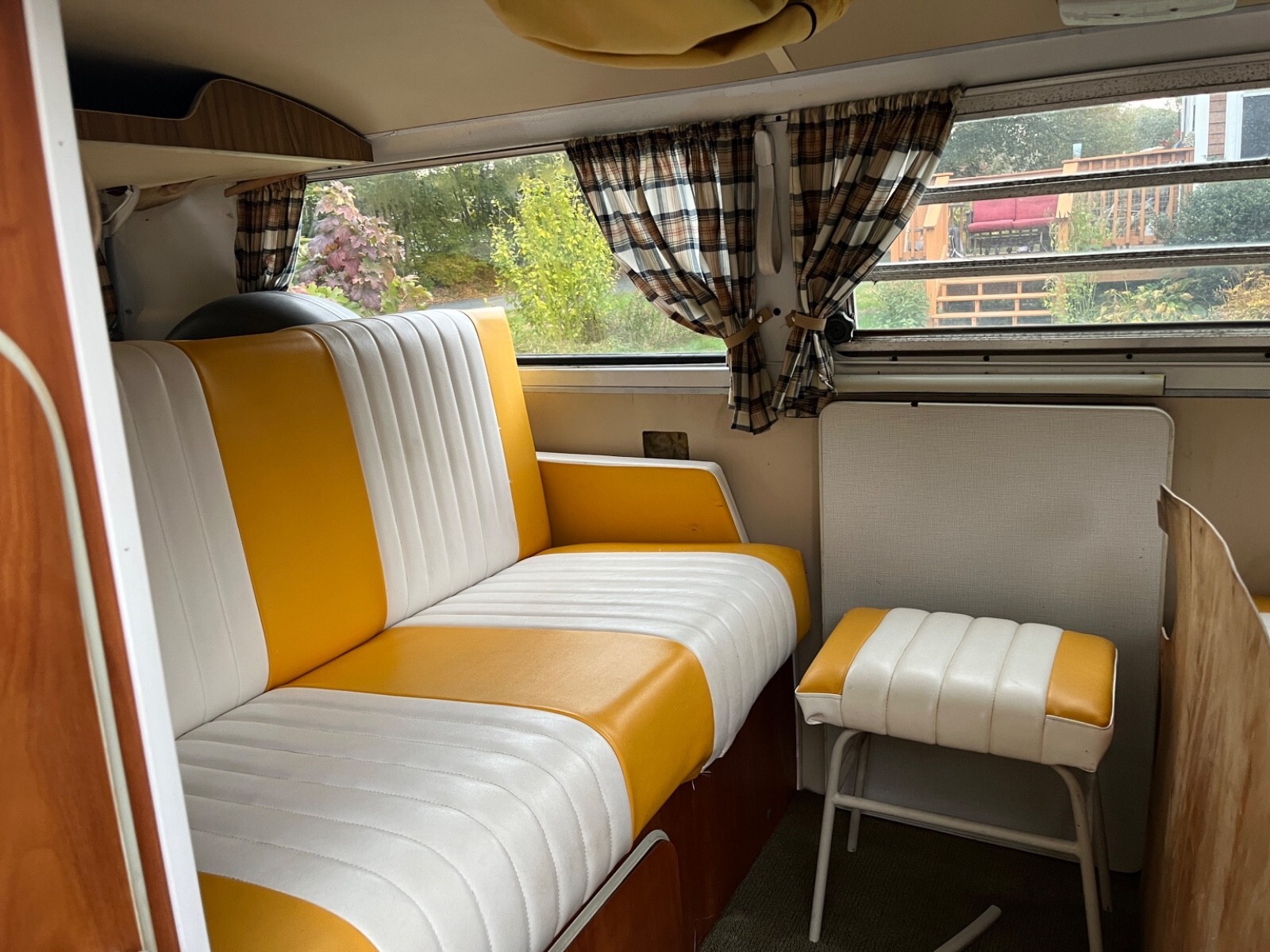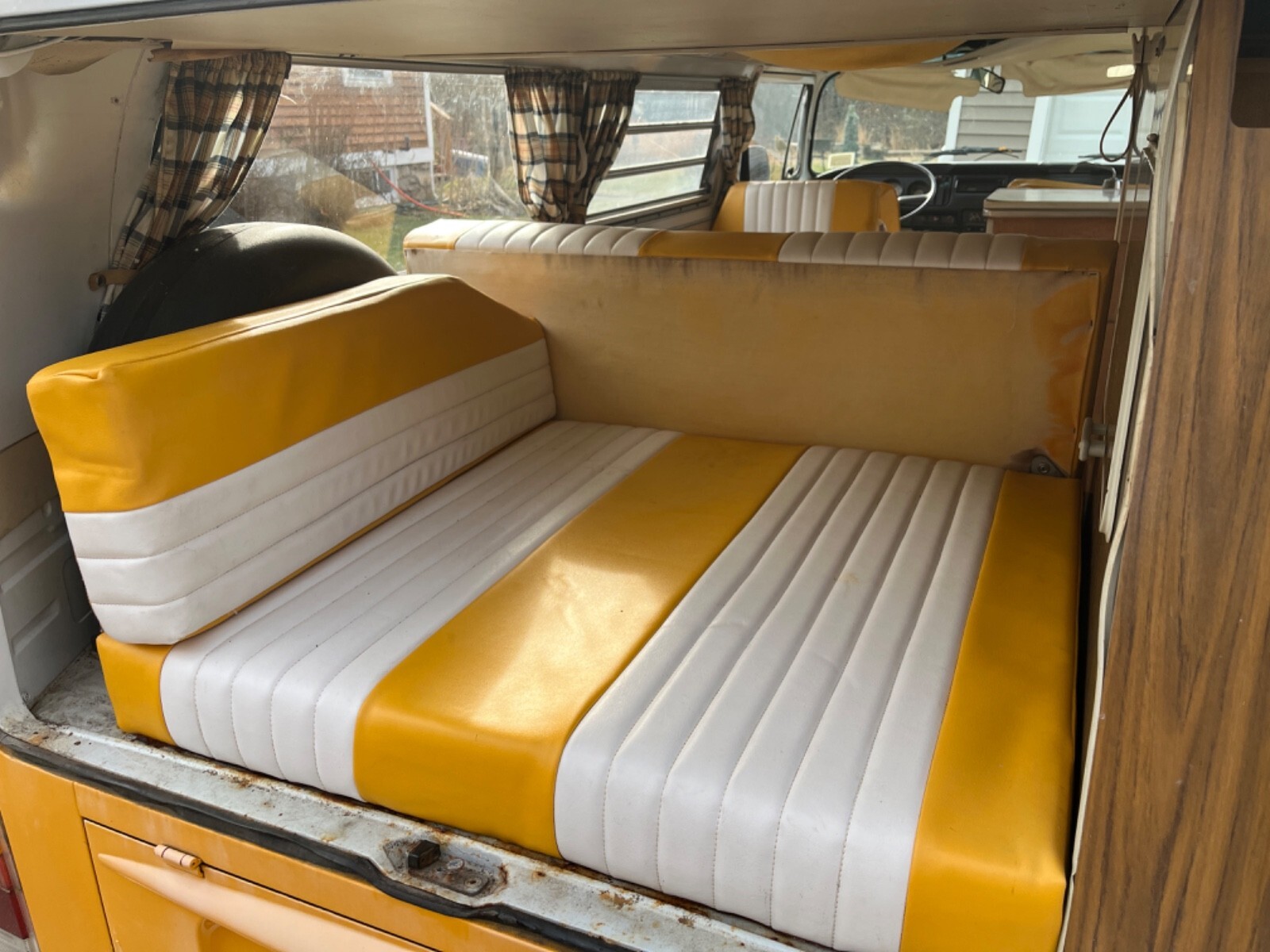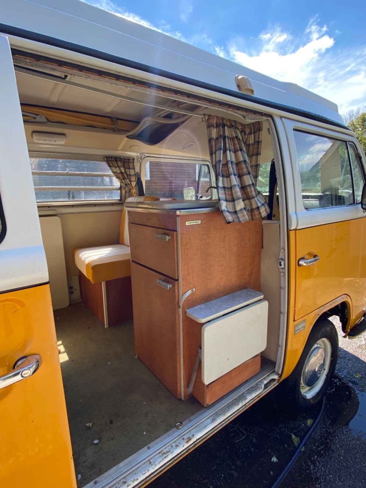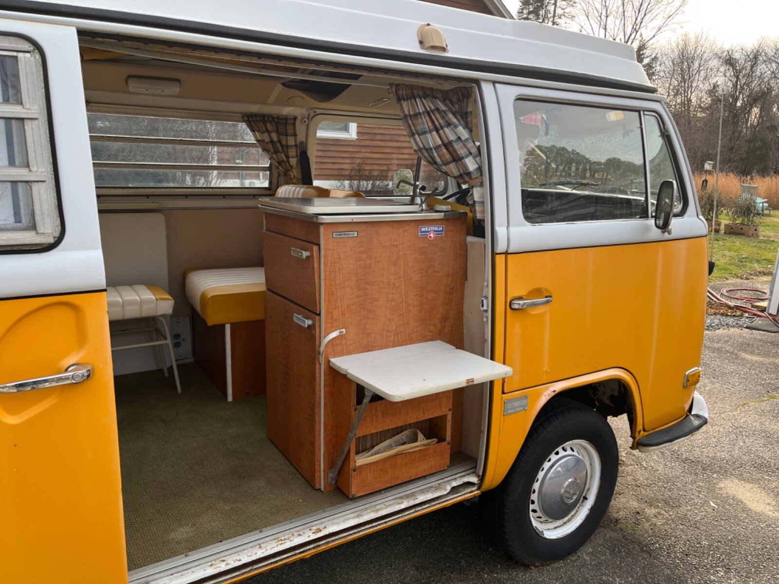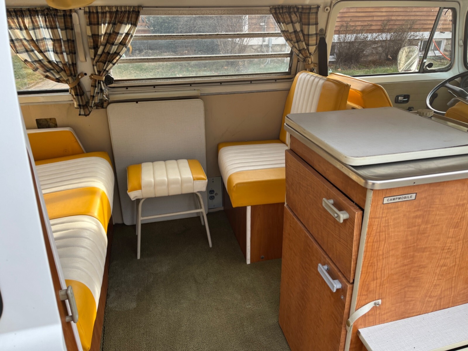 Interior Condition • All original Westfalia layout from 1972 (cabinets, fold-down table, fridge cabinet, bench, pop-top) • Seats have upgraded period-correct vinyl upholstery in yellow and white • Interior panels, curtains, floors all have classic vintage Westy character • Pop-top cot canvas needs replacement • Ceiling liner just needs to be re-affixed (material is intact, simply came loose from age) • Camper cabinets all present and original • Small weathered liner on the bottom of the rear cushion (alcove trunk/bed area) • 2012 renovation included upgraded speakers and a removable CD player / AM–FM radio • All interior components present, making it an excellent base for restoration or customization