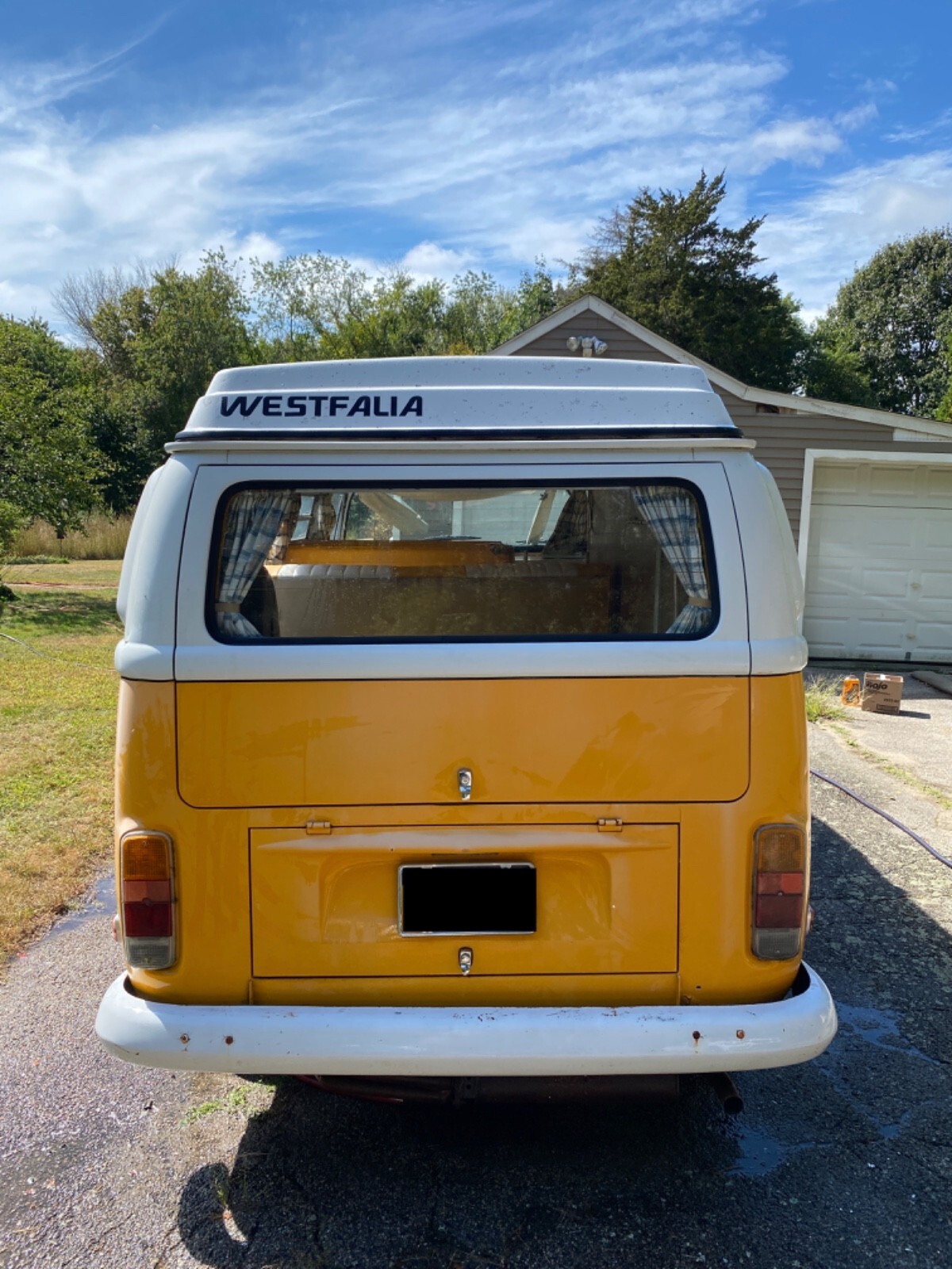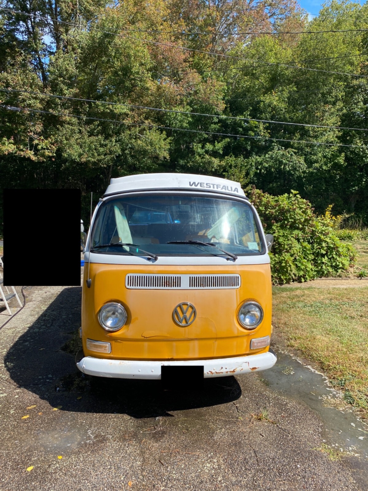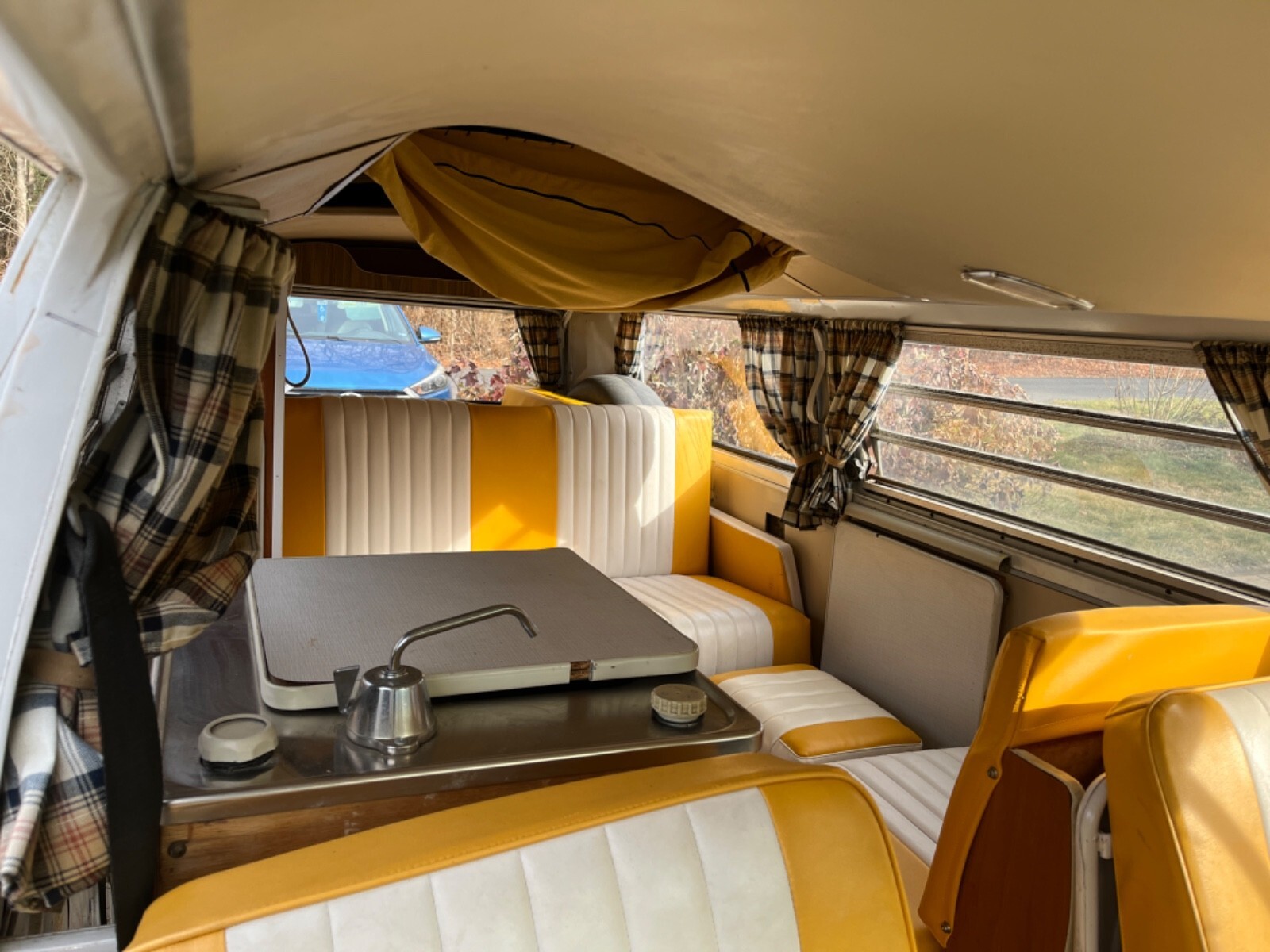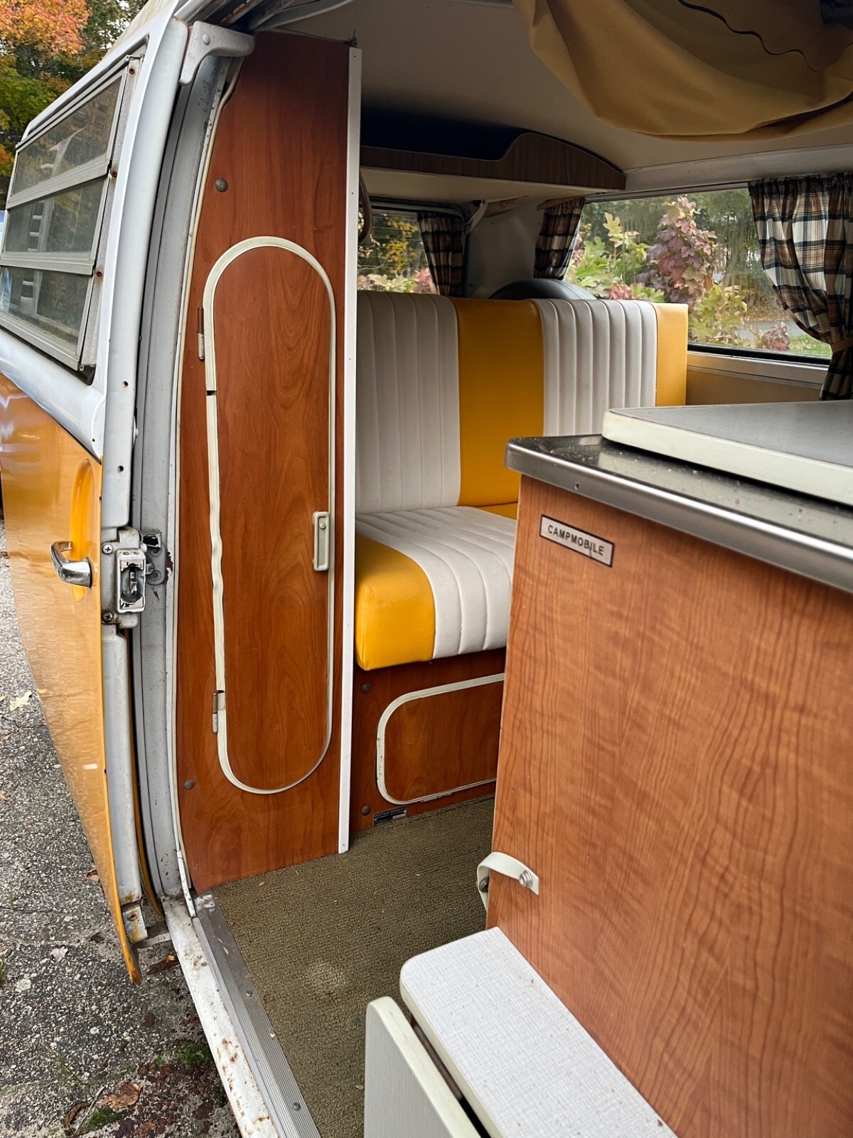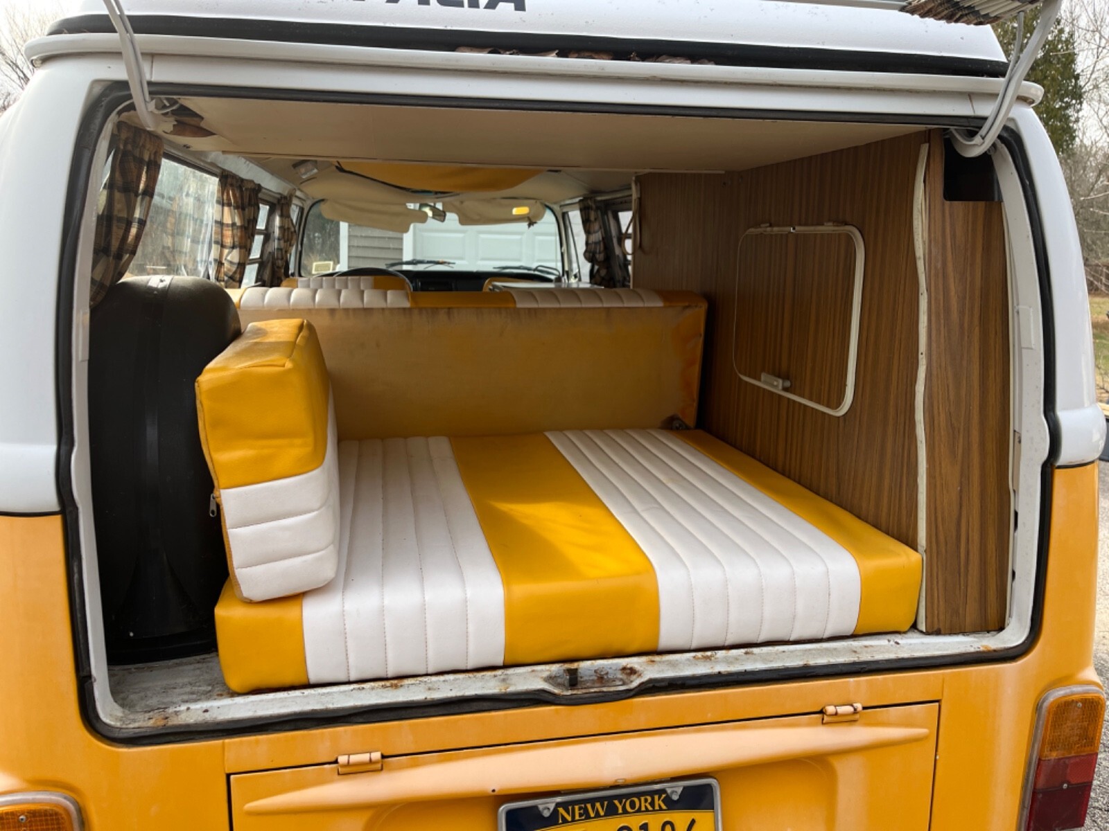 Interior Condition • All original Westfalia layout from 1972 (cabinets, fold-down table, fridge cabinet, bench, pop-top) • Seats have upgraded period-correct vinyl upholstery in yellow and white • Interior panels, curtains, floors all have classic vintage Westy character • Pop-top cot canvas needs replacement • Ceiling liner just needs to be re-affixed (material is intact, simply came loose from age) • Camper cabinets all present and original • Small weathered liner on the bottom of the rear cushion (alcove trunk/bed area) • 2012 renovation included upgraded speakers and a removable CD player / AM–FM radio • All interior components present, making it an excellent base for restoration or customization