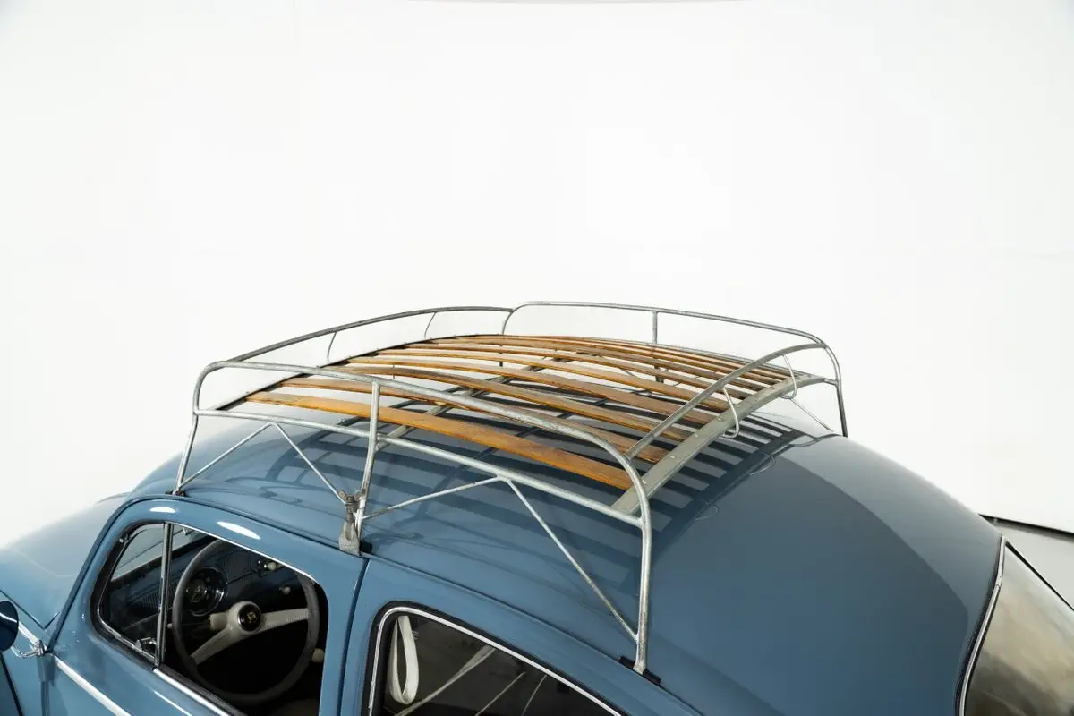 The Pale Blue exterior is complemented by front and rear over rider bumpers, giving it a quintessential vintage appeal. Additional touches like the ivory vinyl bucket seat interior, period-correct roof rack, and 15" steel wheels with chrome hubcaps and VW mud flaps enhance its classic charm.