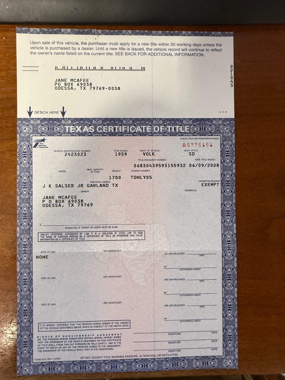 1959 Volkswagen Barbie Bug. Completely restored. Sat for a long time. I did over $9,000 worth of work at a local shop that specializes in VWs and older VWs. The car is in tip top running condition. Extremely good restoration job. Most stuff is new or like new condition including the battery. Not sure on the miles. It is from 1959 so true miles are unknown.VIN: 2423023