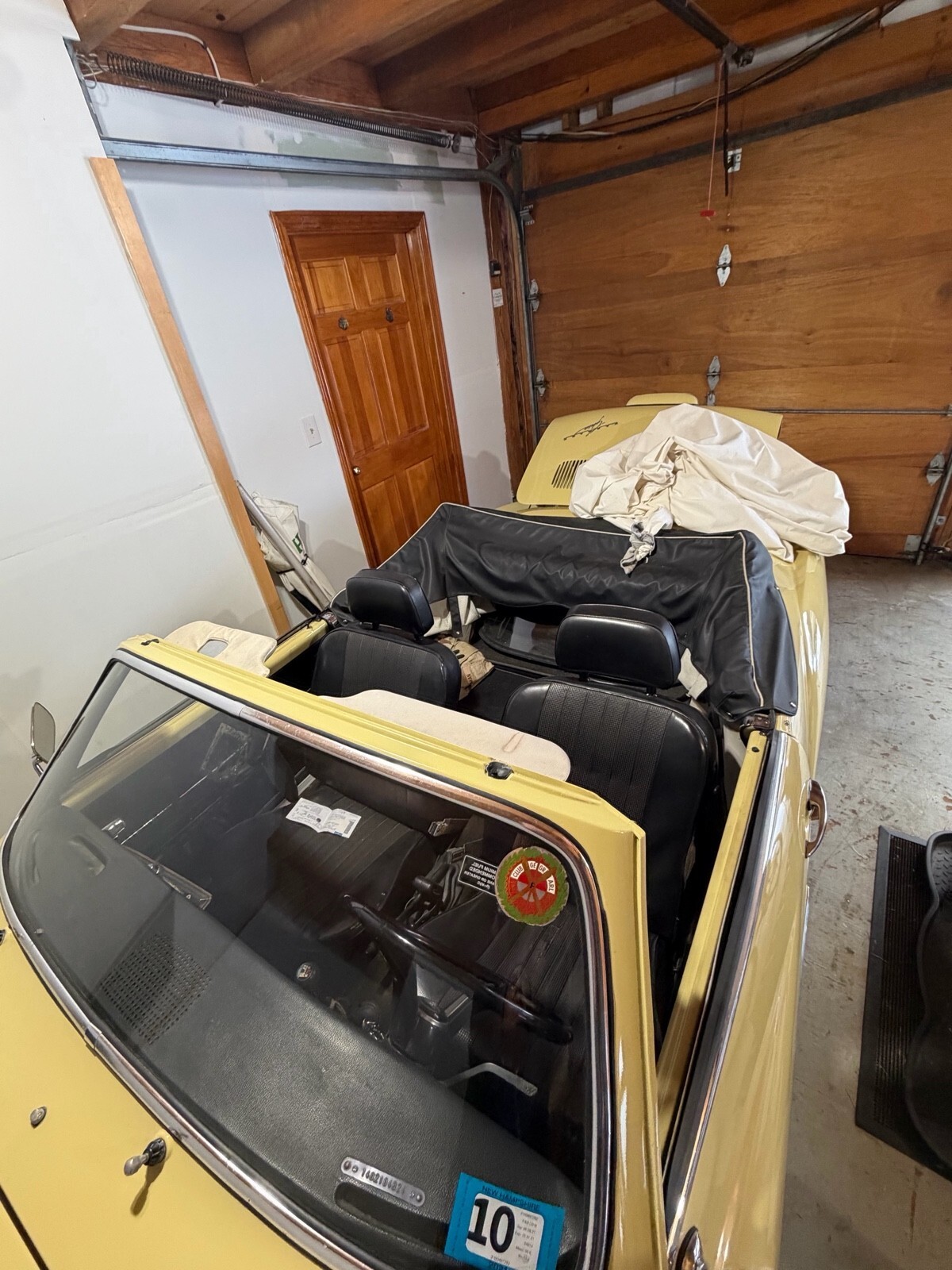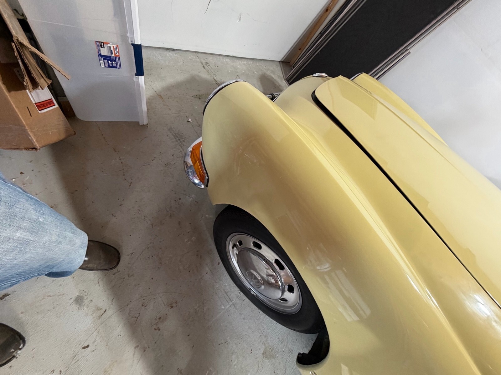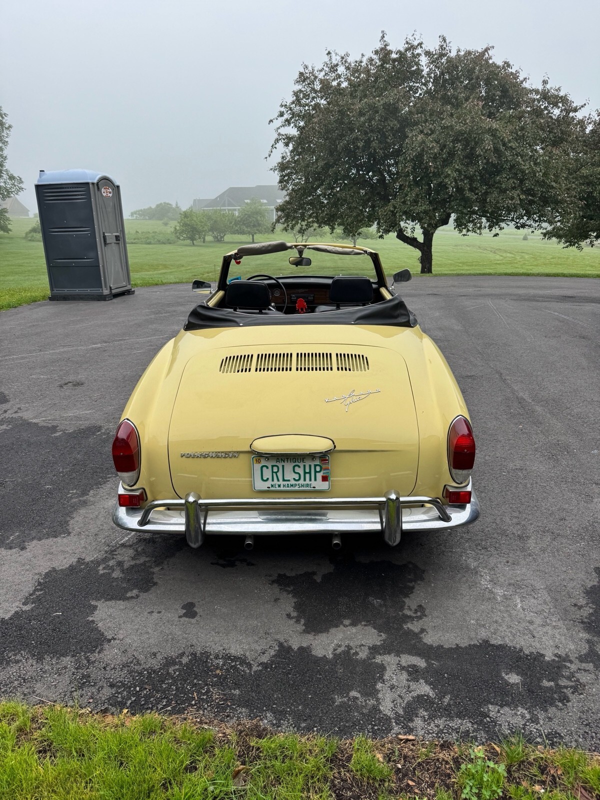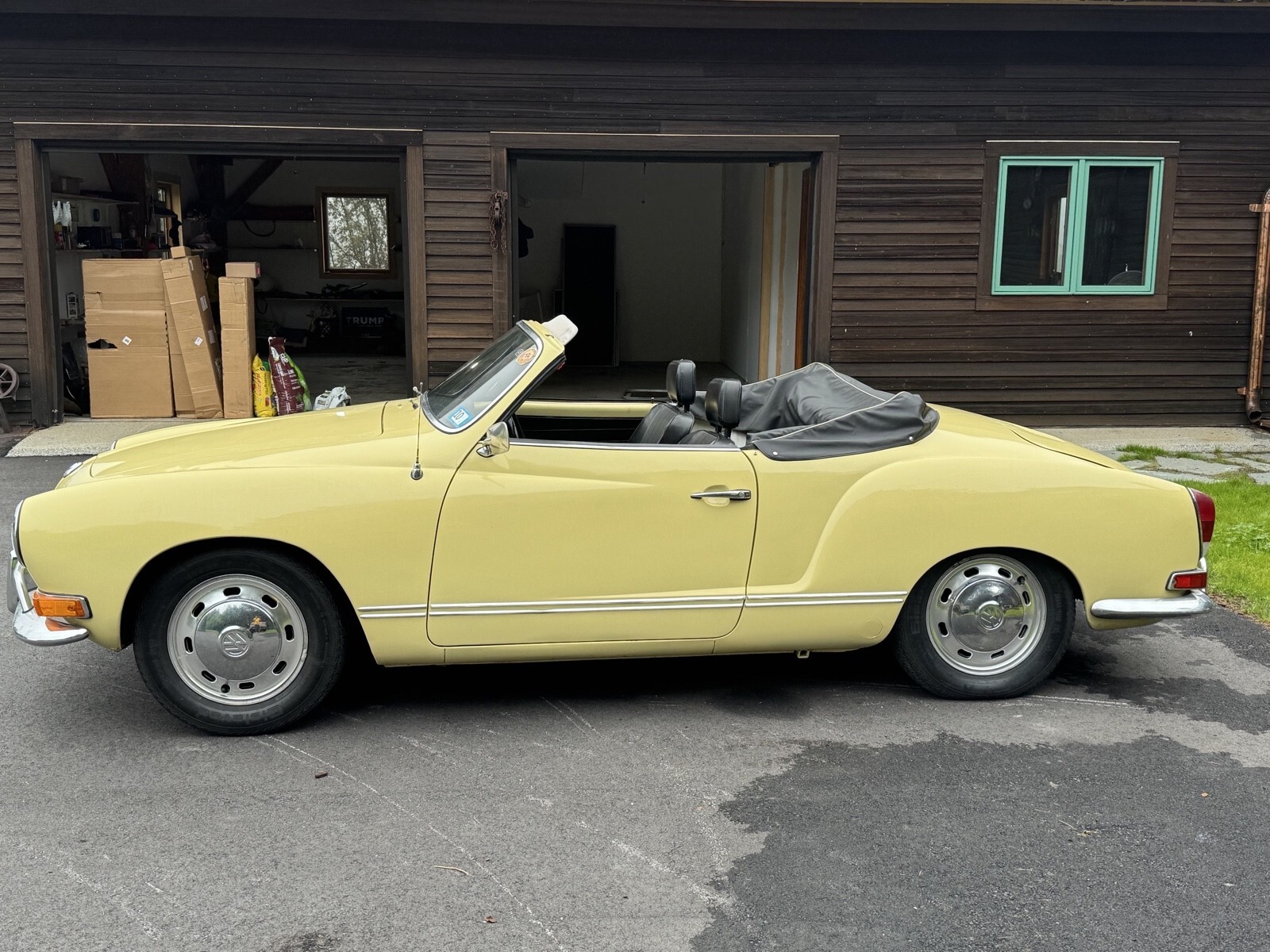 A 1970 Volkswagen Karmann Ghia in hippie yellow. Had it garaged over 20 years and the vehicle is very drivable and not hardly driven. Maybe I’ve driven it 250 miles in 20 years… 99% rust free, a gem, 95% original. Repainted original color. Ragtop super. Interior nice. Replaced radio and installed 2 speakers. Mileage unsure but original engine. All numbers match. Super duper man! One solid machine ready for the road! Nicest on the East Coast I bet! As close as a barn find! A few minor things-Driver side window doesn’t go up but I think I have all the parts. Gas gauge, mileage gauge, fuel gauge broken.