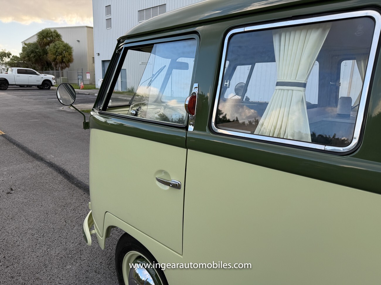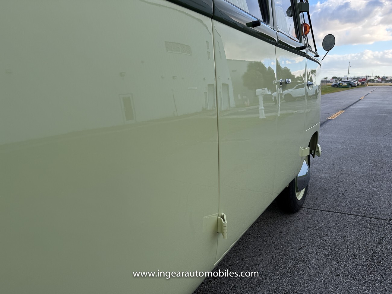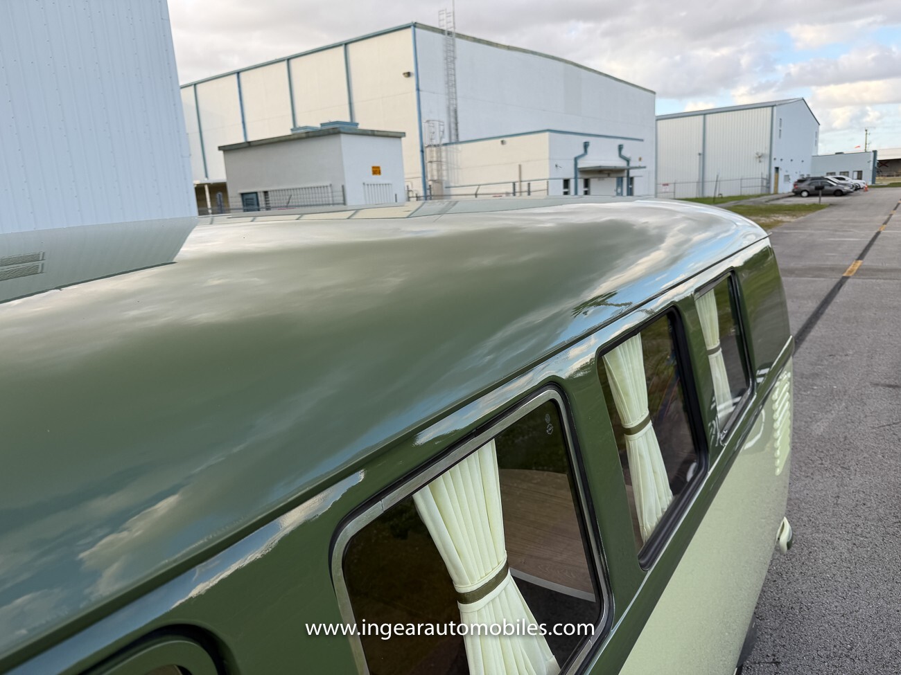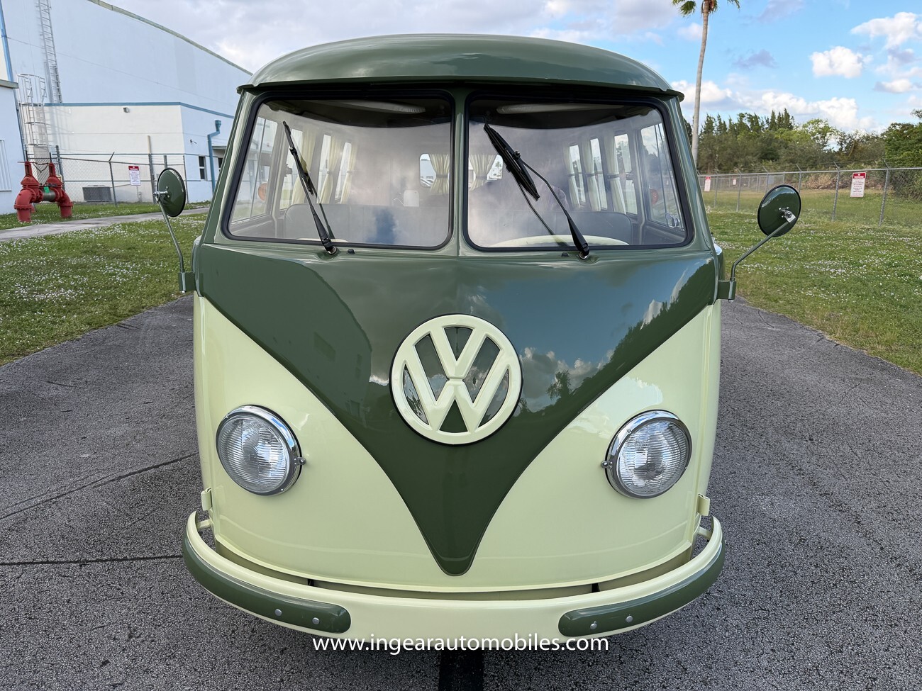 Has woodgrain trim interior. Full green Tone interior! Great collector's car.The under Body was also done in off white. Restored by the previous owner. During that process it received all new mounts, new door seals, windows, all new chrome pieces, new weather stripping, all new lights, bumpers, emblems. The bus has a two tone Green/Off-white paint job clear finish all around, and sits on factory matching wheels. Come see the Bus in person. Check out my pictures so you can see all the detail that went into this VW Bus. The engine is 1500 with a 4-speed transmission. Full 12 volt upgrade! A lot of detail has been spent on the engine compartment. All new lines and gas tank. Engine bay was also repainted all around. This Bus will definitely get lots of attention at the shows & question at the cars and coffee meets.