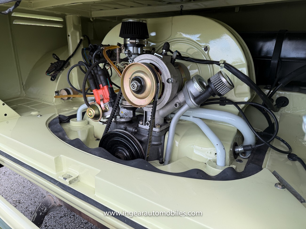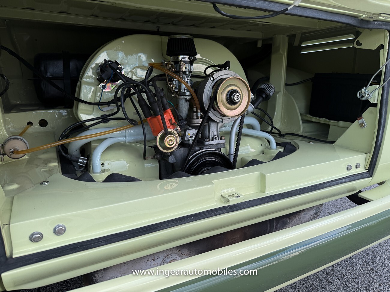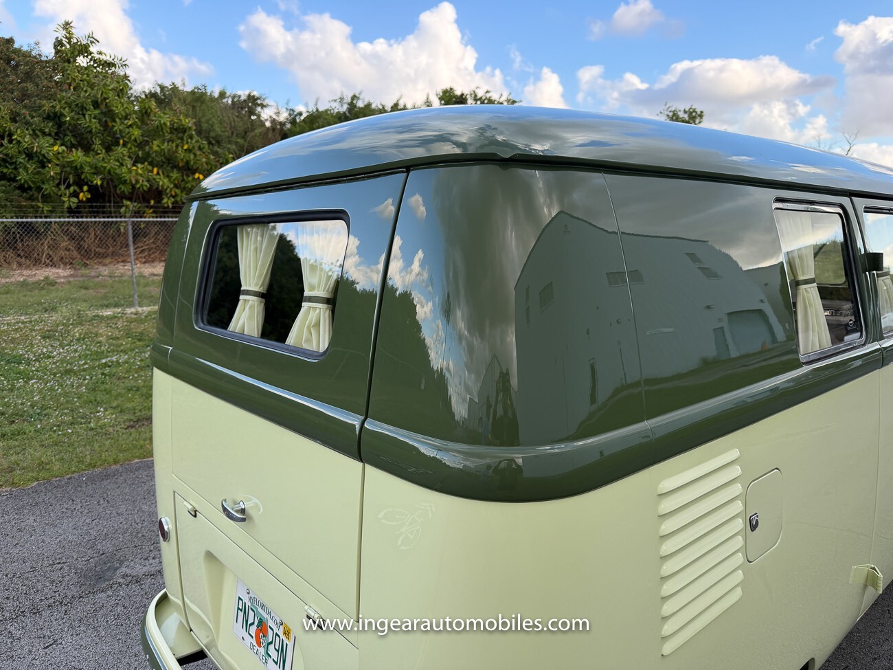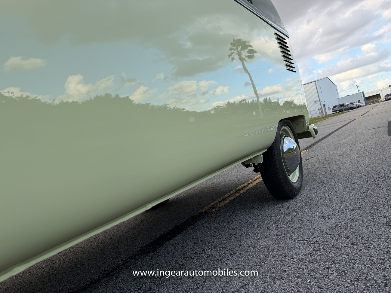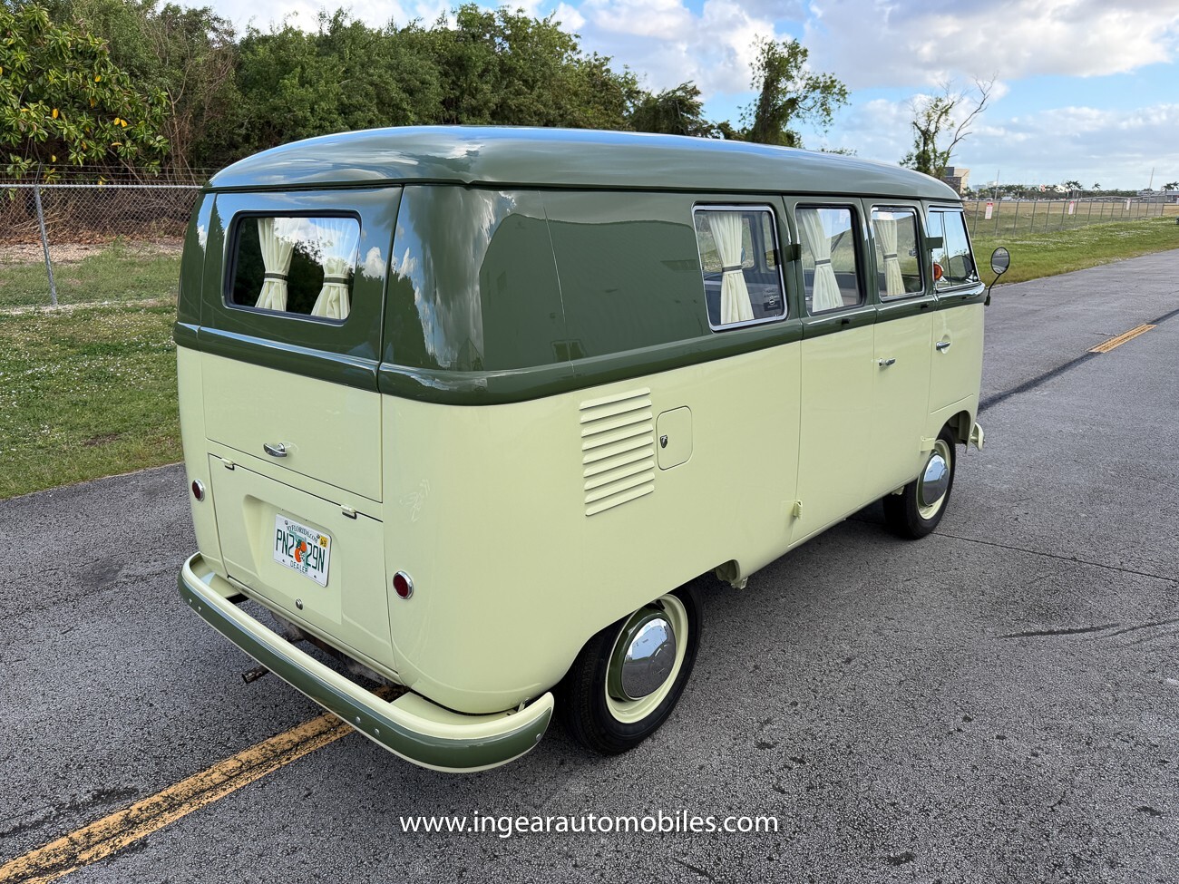 Has woodgrain trim interior. Full green Tone interior! Great collector's car.The under Body was also done in off white. Restored by the previous owner. During that process it received all new mounts, new door seals, windows, all new chrome pieces, new weather stripping, all new lights, bumpers, emblems. The bus has a two tone Green/Off-white paint job clear finish all around, and sits on factory matching wheels. Come see the Bus in person. Check out my pictures so you can see all the detail that went into this VW Bus. The engine is 1500 with a 4-speed transmission. Full 12 volt upgrade! A lot of detail has been spent on the engine compartment. All new lines and gas tank. Engine bay was also repainted all around. This Bus will definitely get lots of attention at the shows & question at the cars and coffee meets.