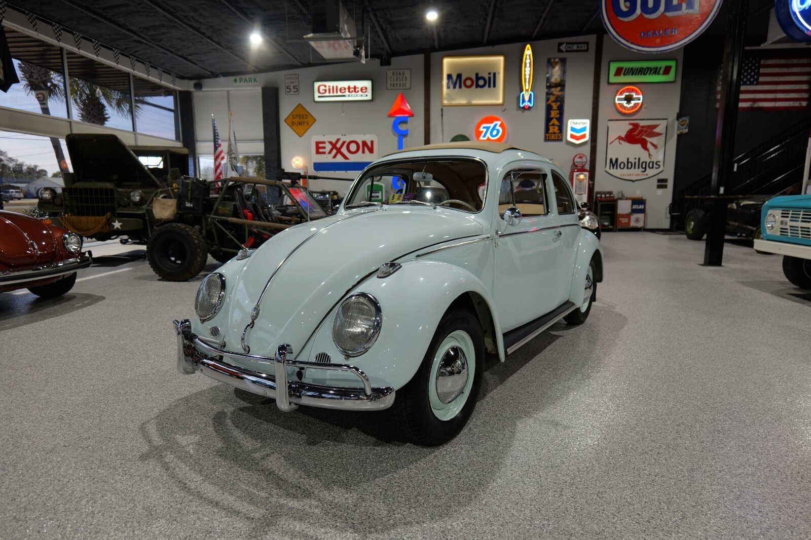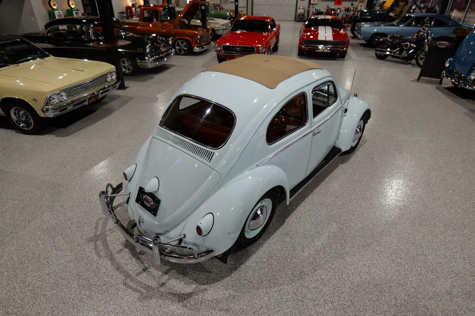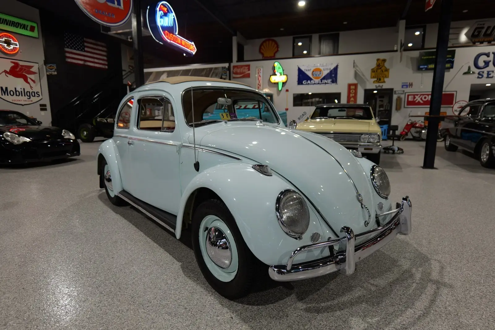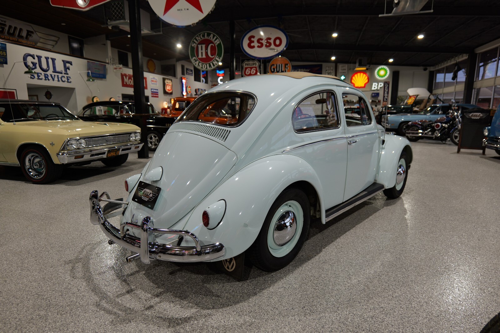 The 1958 Volkswagen Beetle - Classic is a vintage sedan for sale by dealer, with a tan vinyl interior and baby blue exterior color. This manual transmission vehicle has a mileage of 15,270 and is in clean condition. This Ragtop VW Beetle features the iconic Volkswagen design, is a sought-after collector's item for car enthusiasts who appreciate its retro charm and classic status in the world of vintage vehicles.