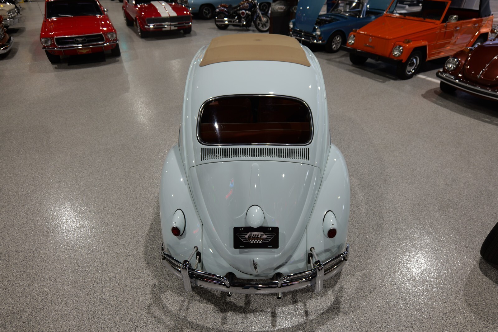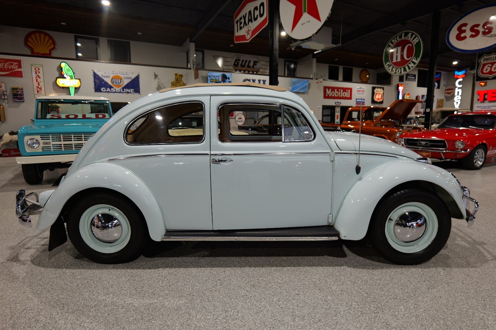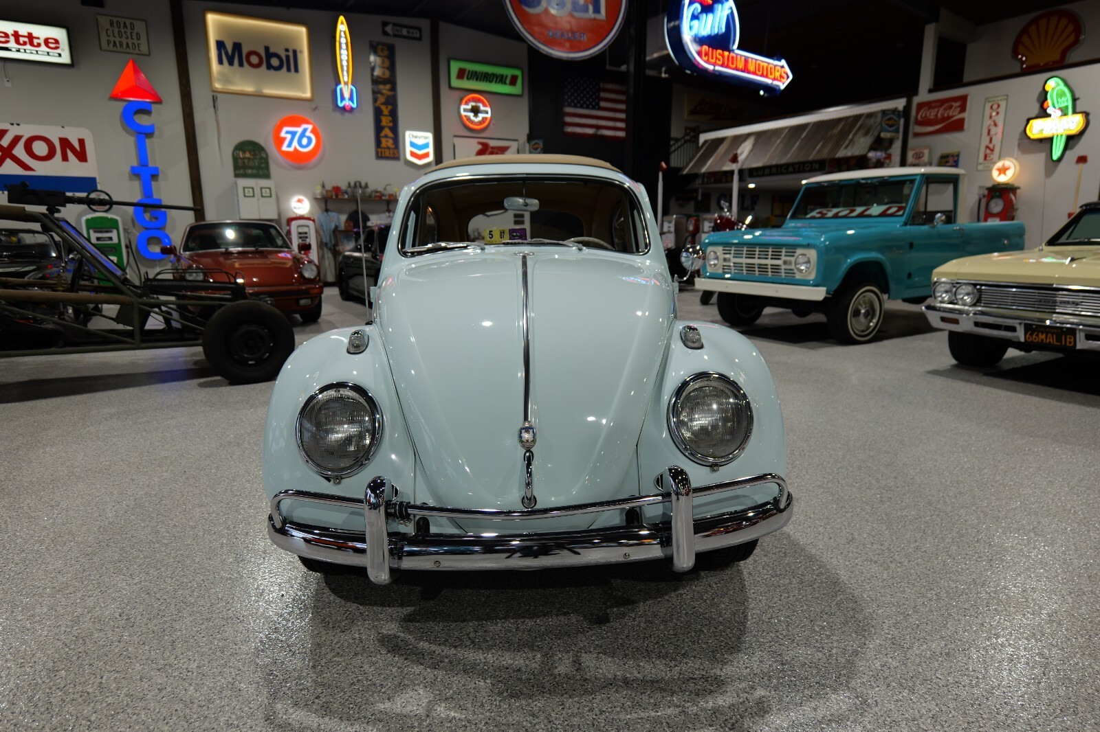 The 1958 Volkswagen Beetle - Classic is a vintage sedan for sale by dealer, with a tan vinyl interior and baby blue exterior color. This manual transmission vehicle has a mileage of 15,270 and is in clean condition. This Ragtop VW Beetle features the iconic Volkswagen design, is a sought-after collector's item for car enthusiasts who appreciate its retro charm and classic status in the world of vintage vehicles.