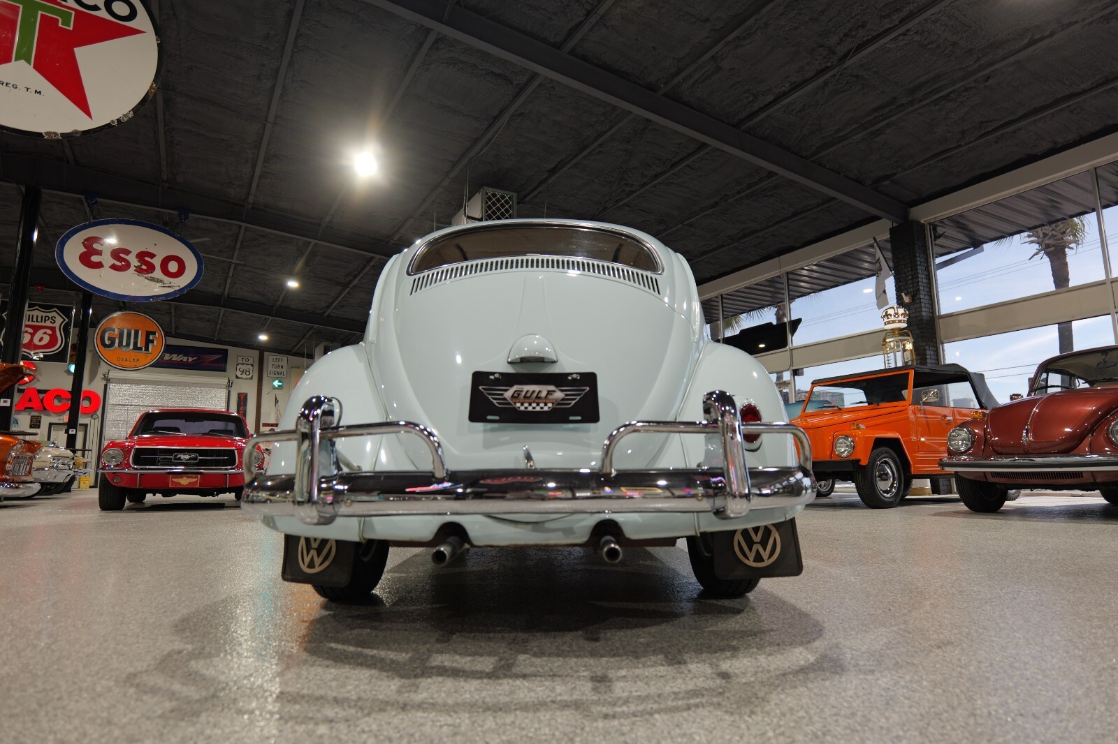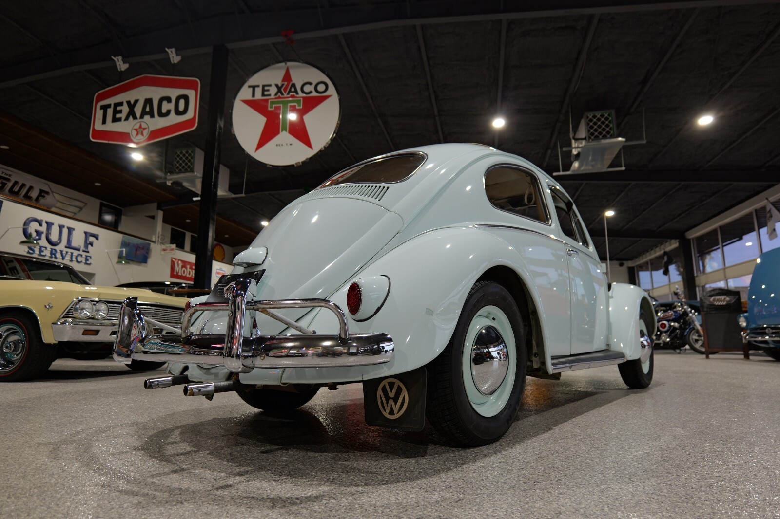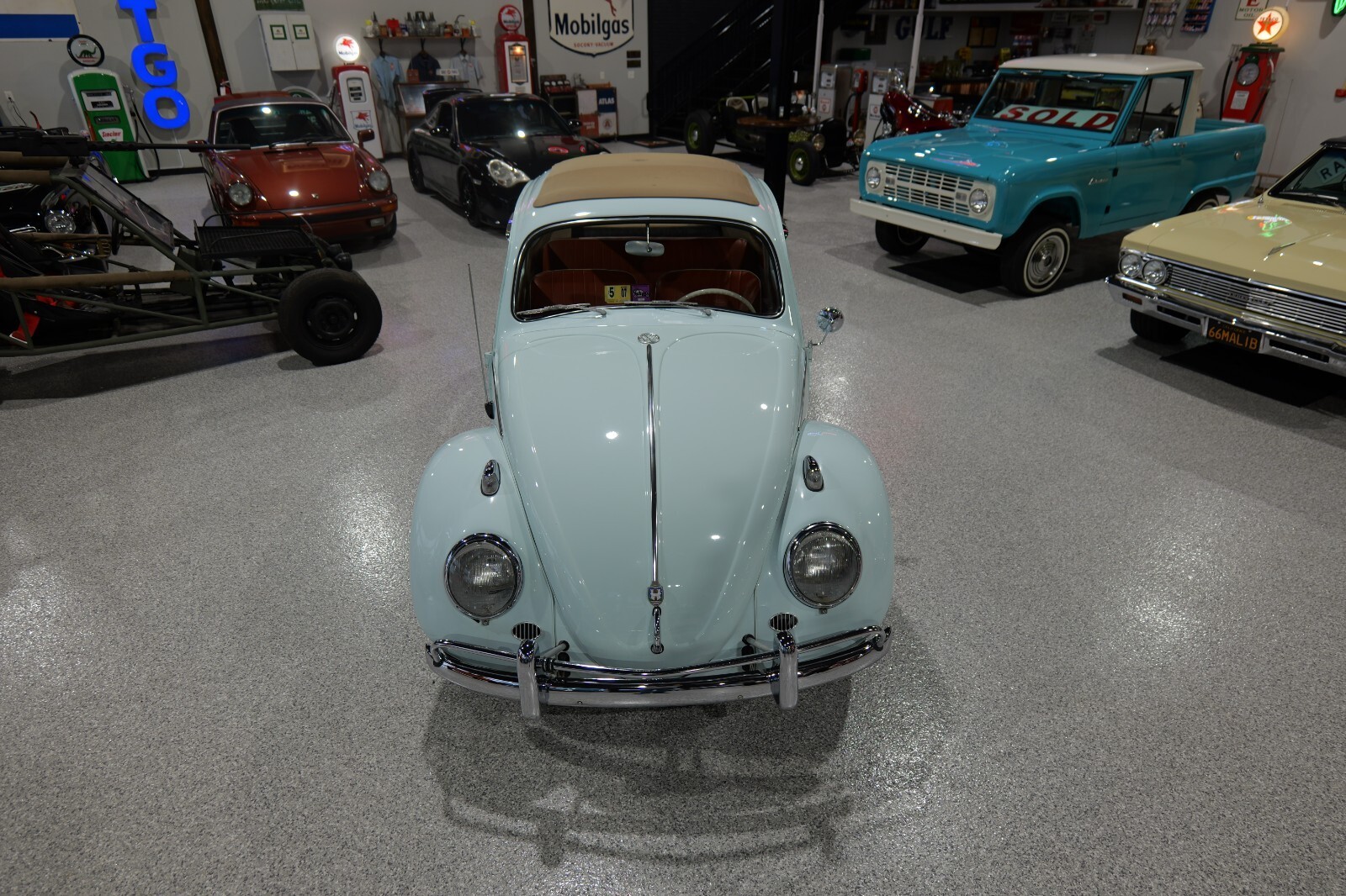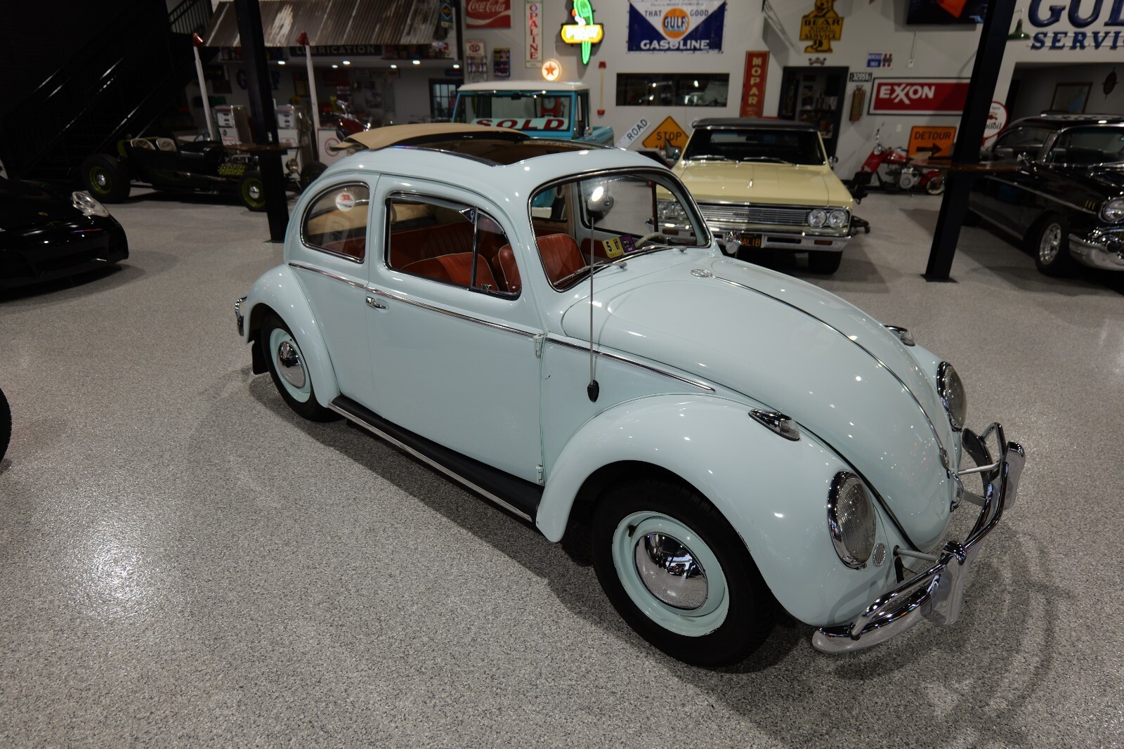 The 1958 Volkswagen Beetle - Classic is a vintage sedan for sale by dealer, with a tan vinyl interior and baby blue exterior color. This manual transmission vehicle has a mileage of 15,270 and is in clean condition. This Ragtop VW Beetle features the iconic Volkswagen design, is a sought-after collector's item for car enthusiasts who appreciate its retro charm and classic status in the world of vintage vehicles.
