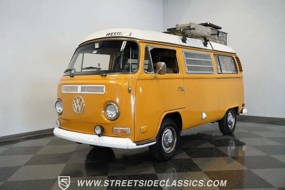 Adventure-ready and built for the open road, the 1972 Volkswagen Westfalia Camper comes in Mustard Yellow with a distinctive boxy profile. A large, functional roof rack sits atop this German classic, complete with solar panels for off-grid capability. The exterior features 14-inch steel wheels with beauty rings and center caps, along with 185R14 Hancook tires that give this van its authentic road-going stance. Three doors provide easy access to both cabin and storage areas.