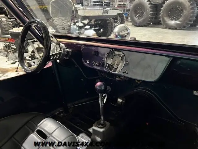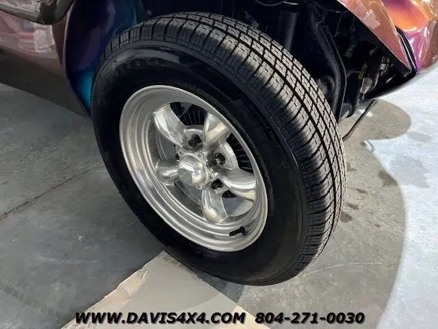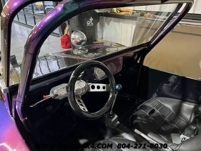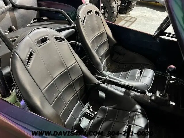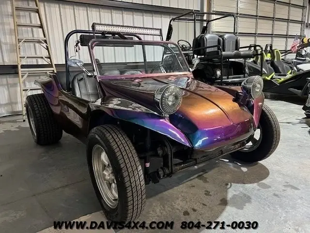 1966 VW Meyers Manx Style Dunebuggy Custom Build. We have had several units from this particular builder. This was one of his personal rides has the Purple/Green Chameleon Paint superwide staggered offset American reason Wheels and Eric correct fat dune buggy style tires does have a toe hook up the receiver for towing this unit behind an automobile LED light bar Boss sound bar bucket seats manual transmission, quad exhaust tips even the engine shoutings have been painted to match Body color and the valve covers LED lights and several more cool upgrades. This is a really neat kit car. Great looking era correct classic Hot Rod.