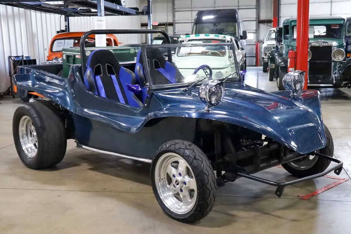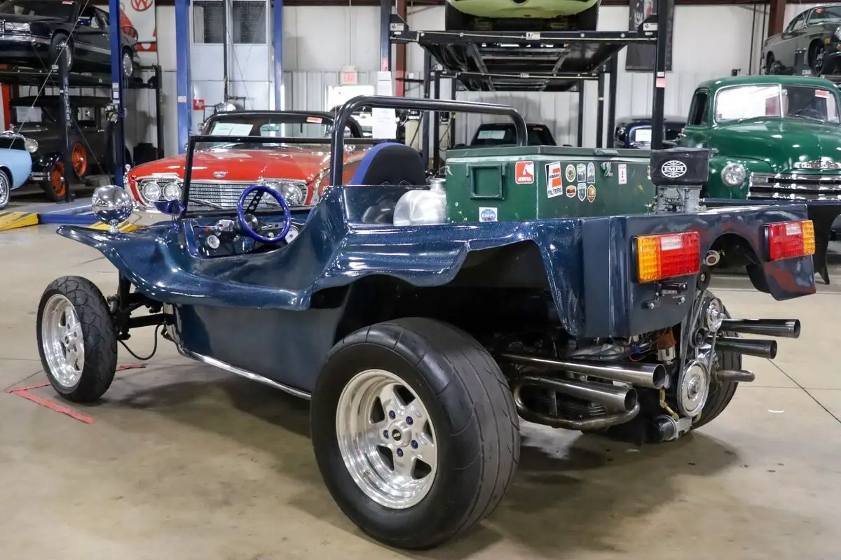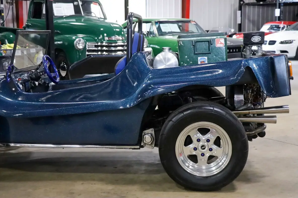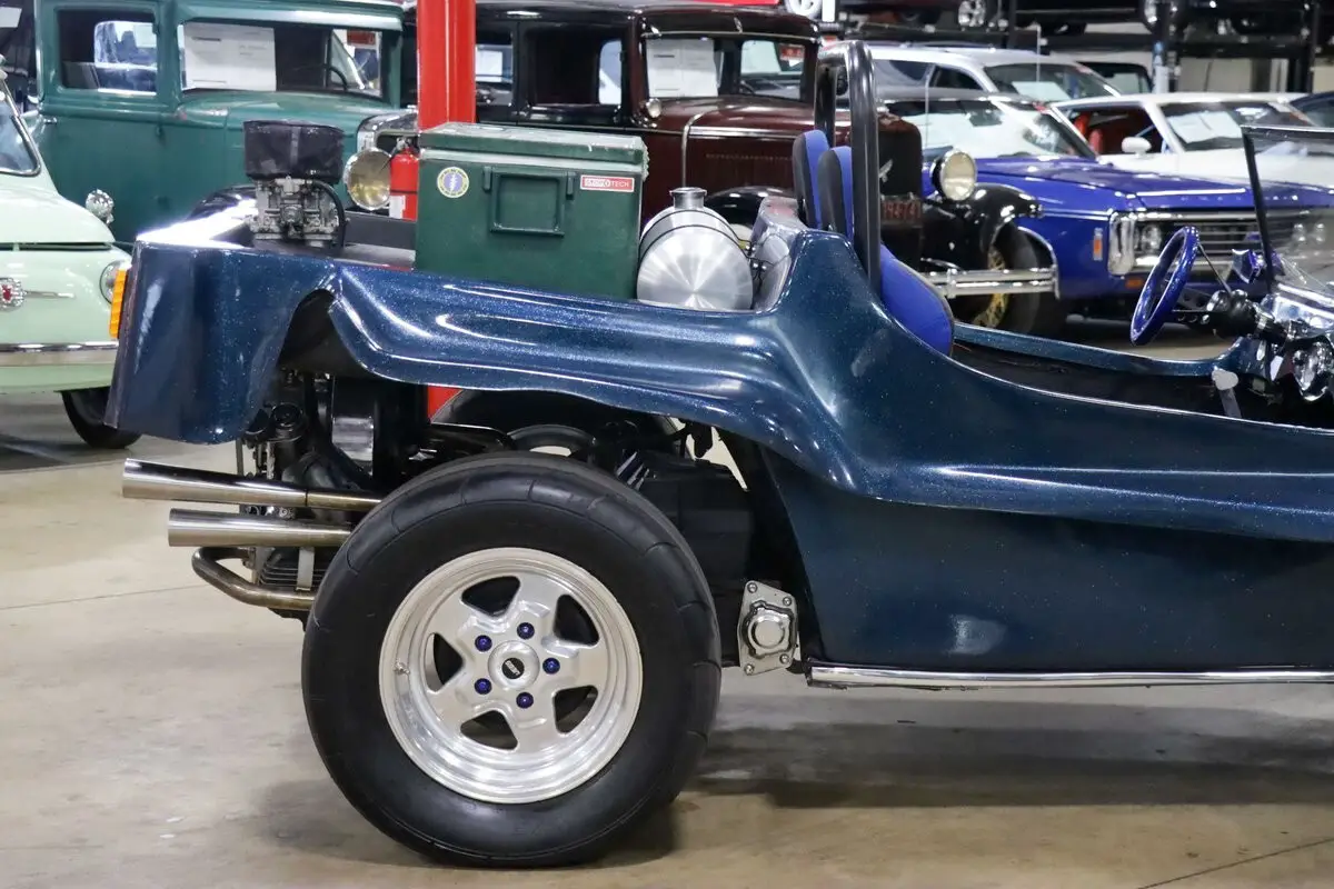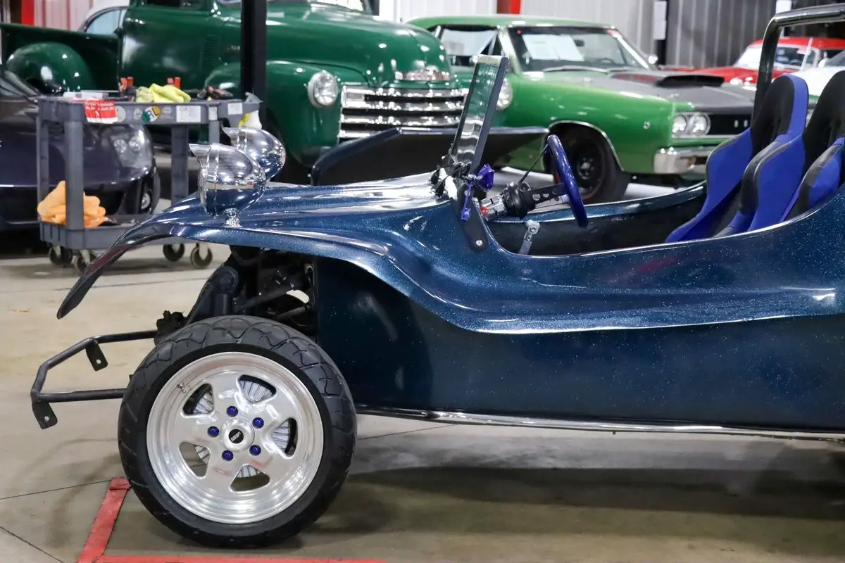 This buggy boasts a Custom Starfield Blue Candy Metal Flake paint job that sparkles in the sunlight and mimics the beauty of a starry sky when the night falls. Designed with fun in mind, this buggy is equipped with a removable fiberglass hardtop and a fold-down windshield, allowing for open-air driving experiences. The body sits on a classic 1966 VW Beetle chassis, which has been updated with new crossmembers, floor pans, and an array of modern upgrades. The rear features a surprise: a small truck bed with the carburetor standing proudly above it, along with a chrome blower motor and quad stainless steel headers. It's outfitted with 15-inch polished 5-spoke mag wheels, Mickey Thompson tires in the rear, and Shenko rubber up front.
