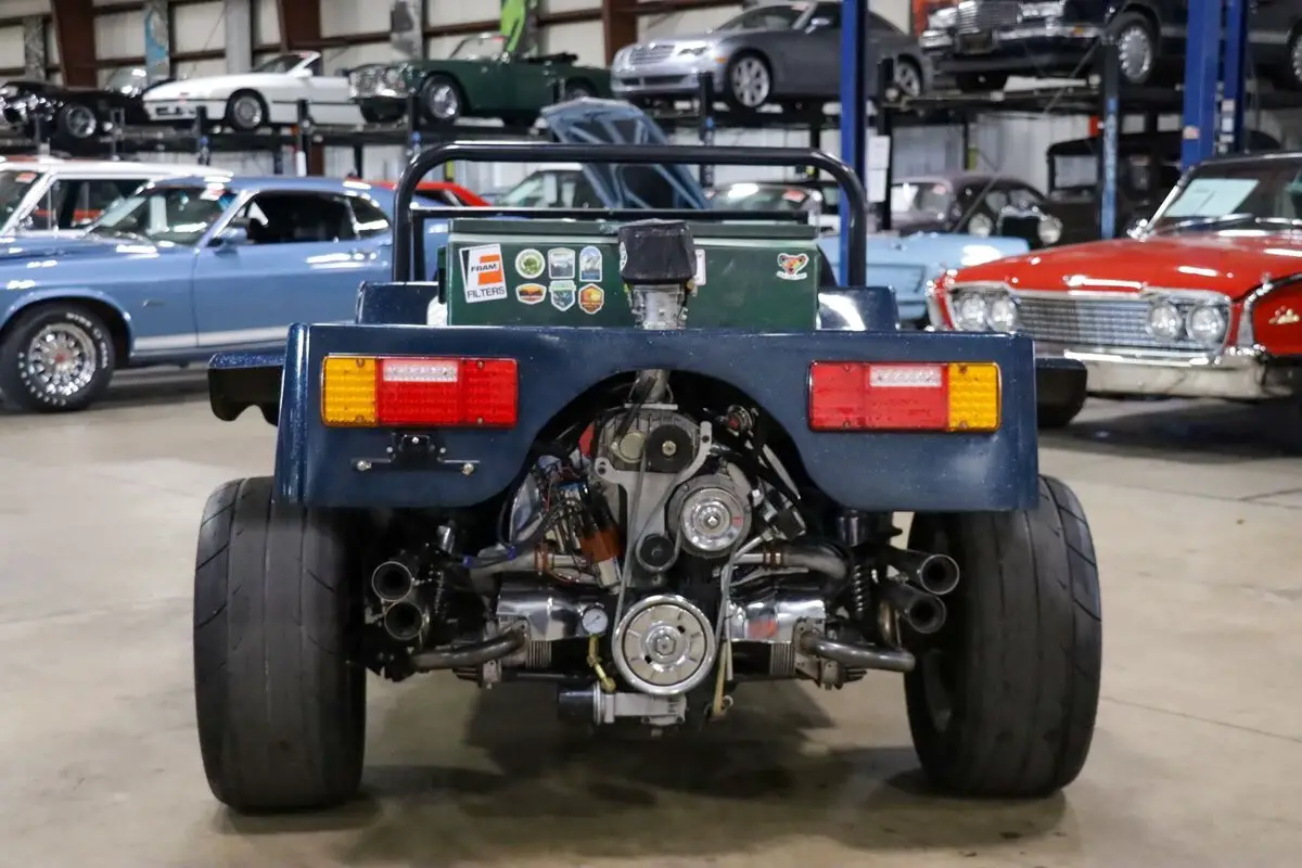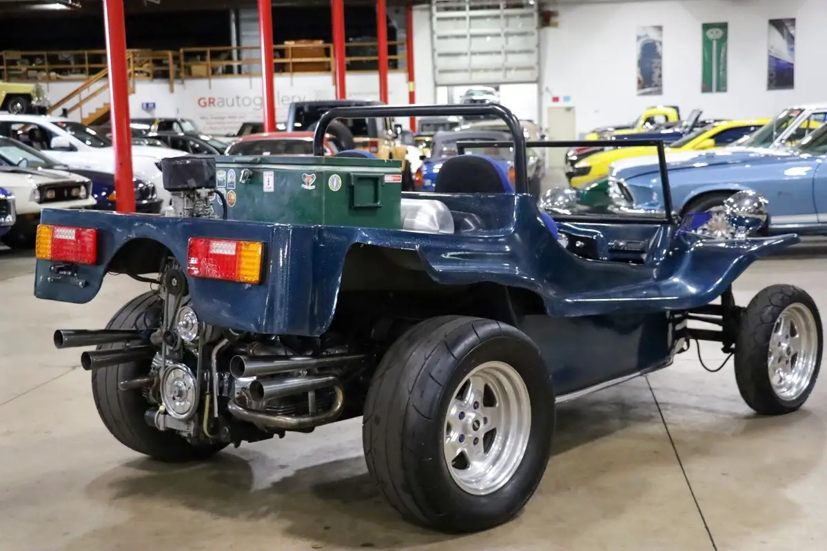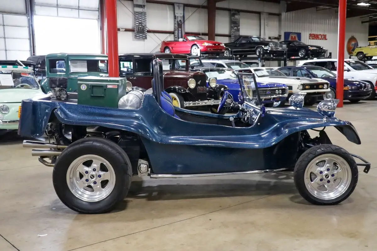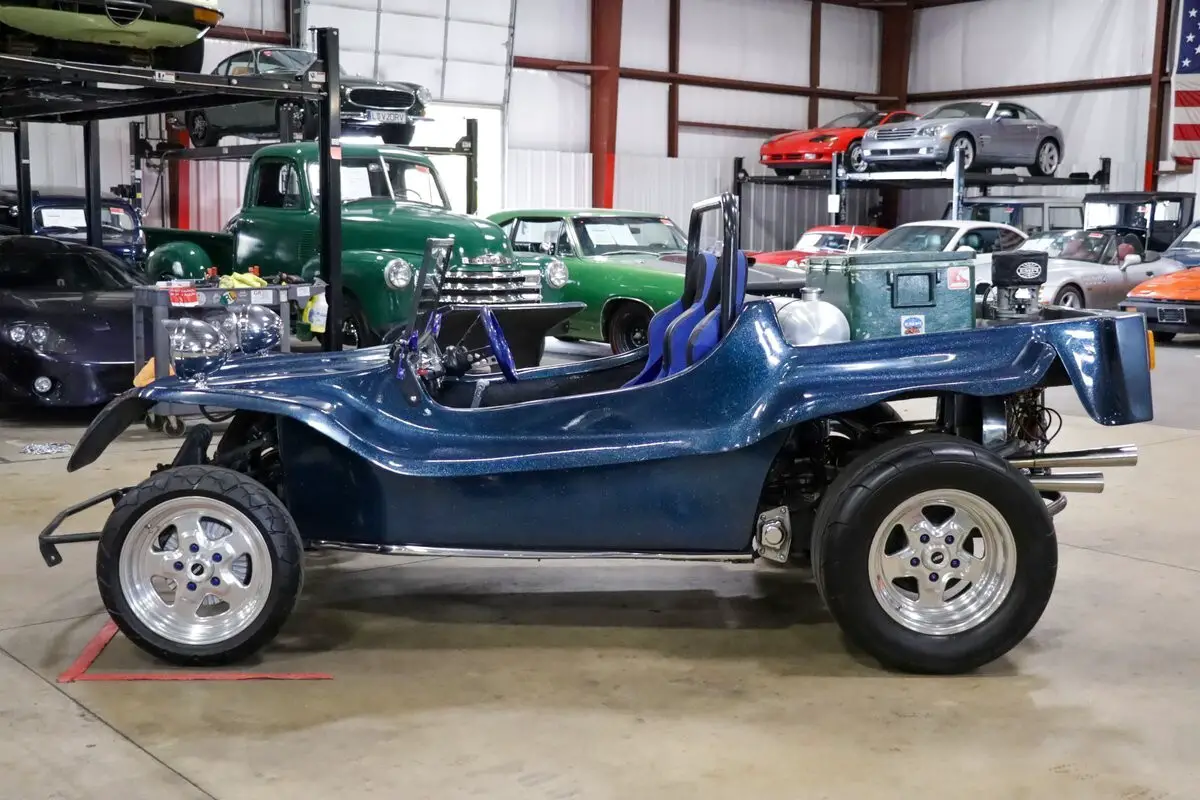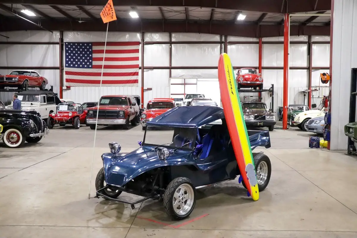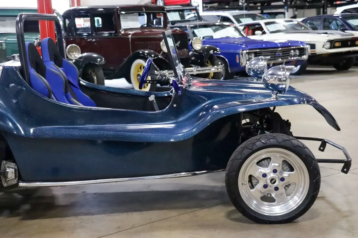This buggy boasts a Custom Starfield Blue Candy Metal Flake paint job that sparkles in the sunlight and mimics the beauty of a starry sky when the night falls. Designed with fun in mind, this buggy is equipped with a removable fiberglass hardtop and a fold-down windshield, allowing for open-air driving experiences. The body sits on a classic 1966 VW Beetle chassis, which has been updated with new crossmembers, floor pans, and an array of modern upgrades. The rear features a surprise: a small truck bed with the carburetor standing proudly above it, along with a chrome blower motor and quad stainless steel headers. It's outfitted with 15-inch polished 5-spoke mag wheels, Mickey Thompson tires in the rear, and Shenko rubber up front.