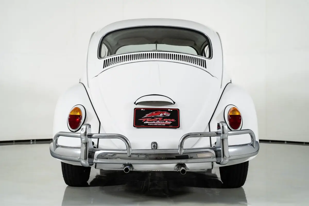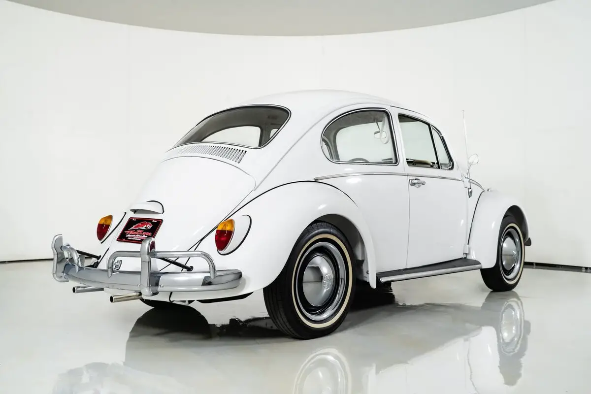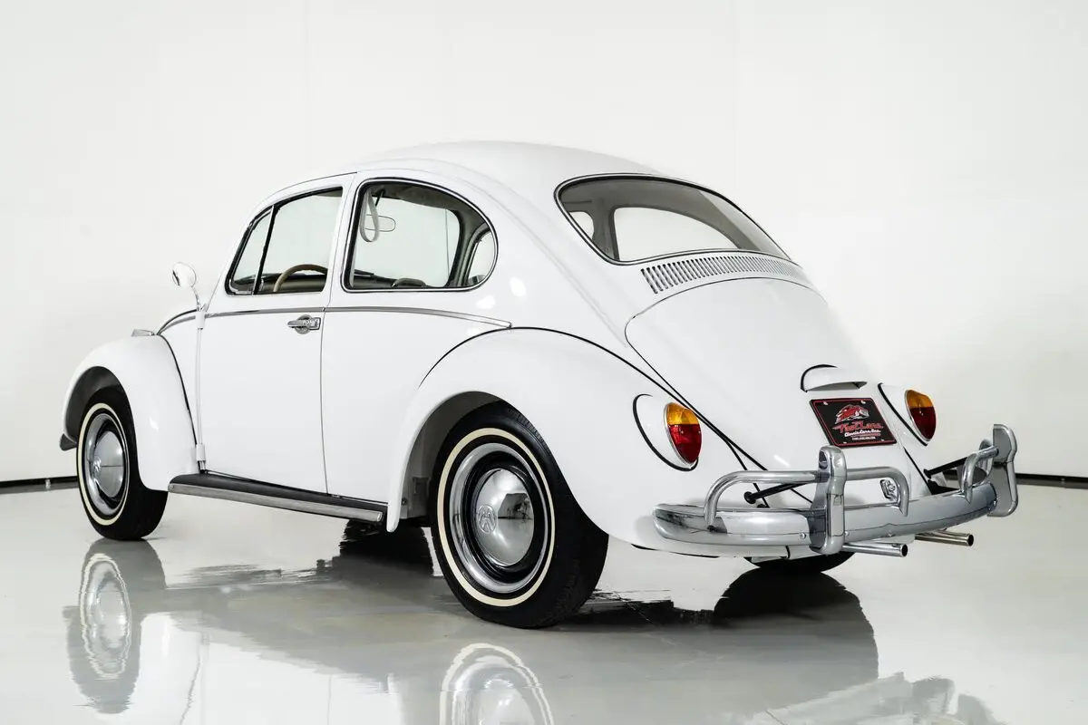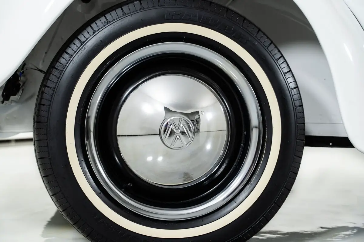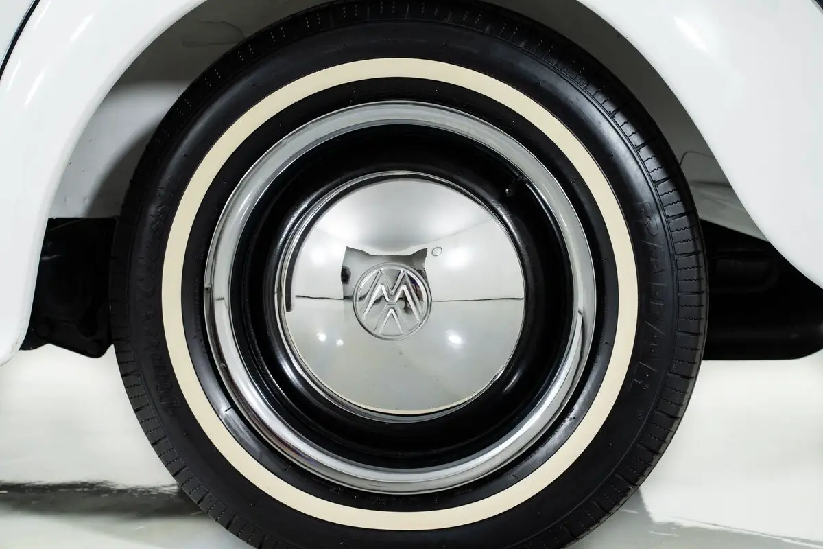 Finished in Bright White, this classic VW Beetle rides on 15-inch steel wheels with VW hubcaps and radial tires, keeping the period-correct look intact. The tan vinyl interior features bucket seats,