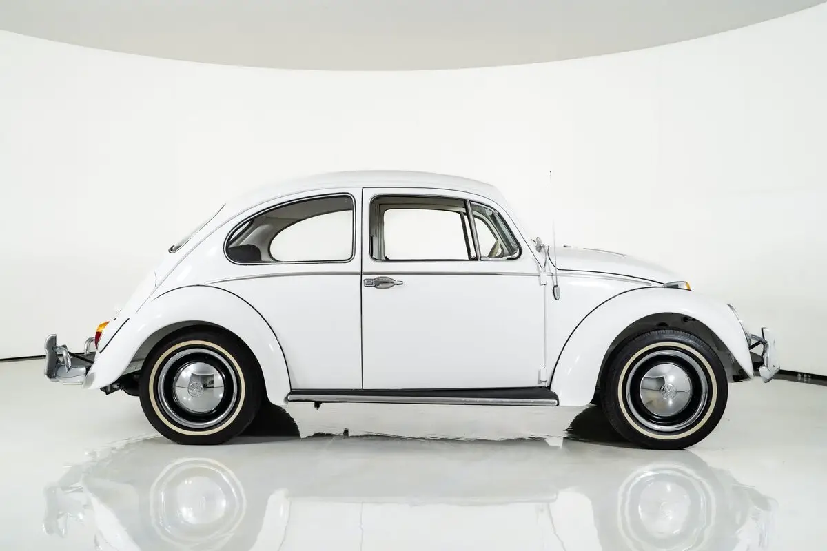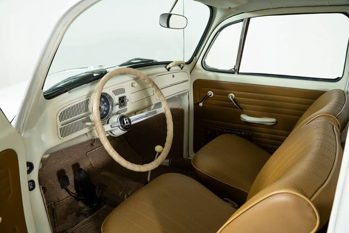 Finished in Bright White, this classic VW Beetle rides on 15-inch steel wheels with VW hubcaps and radial tires, keeping the period-correct look intact. The tan vinyl interior features bucket seats, a floor shifter, and straightforward charm, making it instantly familiar to anyone who has ever spent time in a VW Bug.
