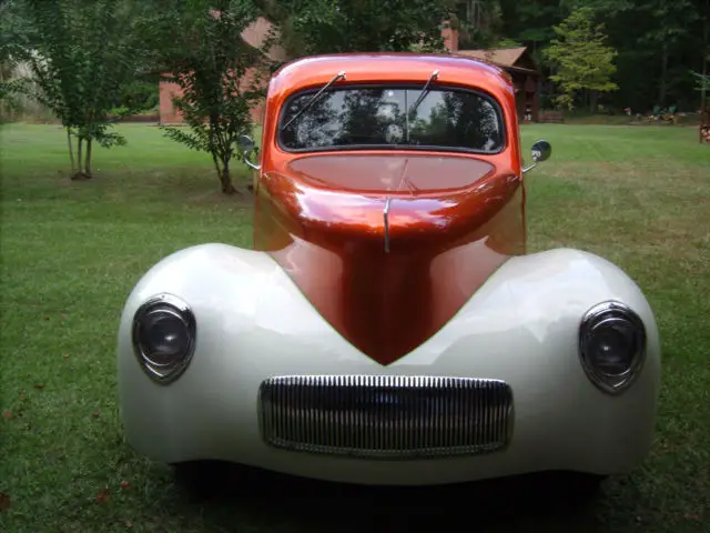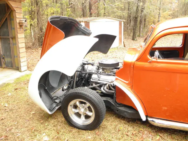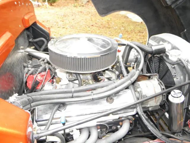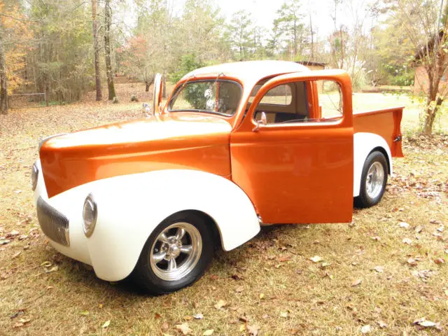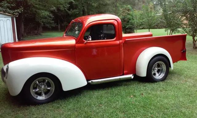 This truck has a fiberglass body by AC Rods on a Chevy S-10 frame. The bed is steel. It has a tilt front end for easy access to the engine compartment. The paint is House of Color Candy Tangerine and the white is PPG Cool Vanilla.