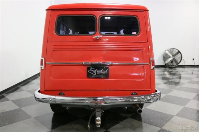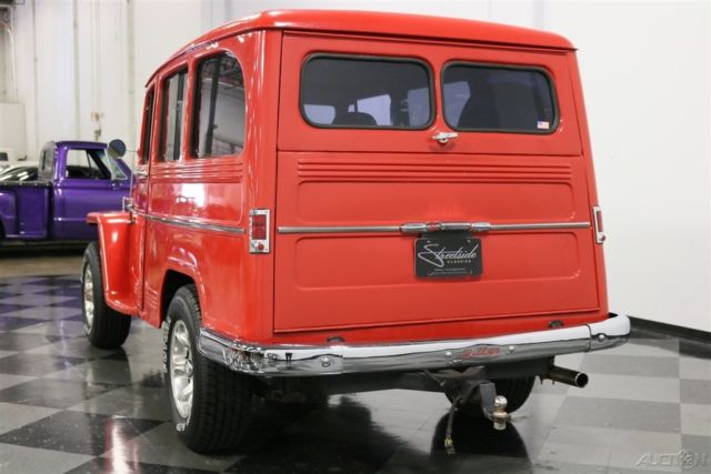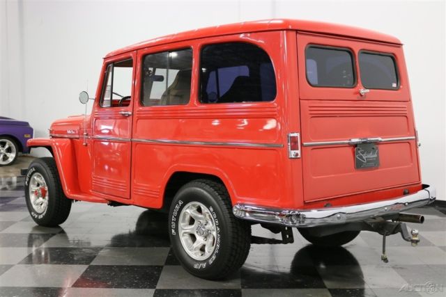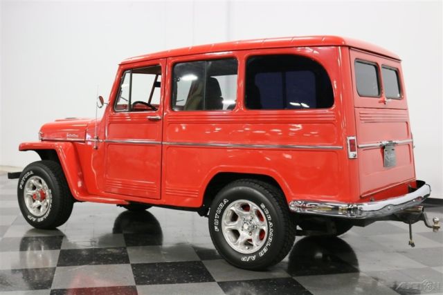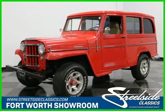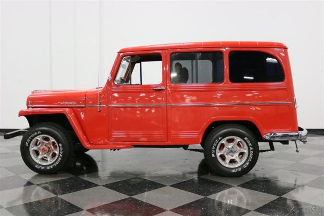 It's hard to say who built the first truly modern SUV, but the short list would have to include vehicles like this 1960 Willys Utility Wagon. Roomy, practical, and with an unmistakably rugged shape, this was the manliest of station wagons long before such things even mattered. Yes, the Willys guys were the ones who built a civilian Jeep and there's plenty of Jeep DNA visible in this wagon. The boxy profile is still instantly recognizable today in the form of Explorers and Tahoes, but it looks so much more appealing with 1960s style. It's also fairly rare to find one of these that hasn't been used up or rusted to the condition of a lace doily, making this a wonderful opportunity to own a good one. With bright red paint, it isn't subtle, but it does have a fun-loving nature and an honest willingness to do a day's worth of work. The restoration was completed in 2007, but it still shines up brilliantly and looks fantastic in person. Details like the ribbed frames around each body panel, the upright grille, and those separate fenders that are still part of the Jeep look today all ensure that this classic will never be obsolete. Open a door with the rustic wooden inner panels and you'll find a pair of tan buckets up front that were borrowed from a late-model of some sort. They actually work pretty well in the Willys' vintage interior and are a lot more comfortable than the original vinyl chairs, especially with the tweed inserts. However, the rest of the interior is pretty stock, including the painted steel dashboard with center-mounted instruments. Custom wood inserts hold auxiliary gauges in front of the driver, which is a pretty cool way to add instrumentation without just hanging them under the dash. There's also a heater hanging underneath, and the firewall has been heavily insulated, making it comfortable inside. There is no back seat, but rather a commodious cargo bay painted to match the bodywork with lovely wooden slats on the load floor that totally work with the truck's rustic attitude. And yes, it is a 4x4, with a 2-speed transfer case actuated by the lever next to the 3-speed shifter. Kaiser's "Super Hurricane" 226 cubic inch inline six provides eager performance and an exhaust note that will be familiar to anyone who has driven a Jeep. In fact, the entire driving experience is pretty much just like a CJ7: basic but tons of fun. The engine bay was obviously built for reliability, not necessarily show, and upgrades include a modern alternator, conical air filter on the 1-barrel carburetor, and an updated ignition system. Clutch take-up is smooth, although the transmission throws are long, more like an antique car than a modern SUV, but that's all part of the appeal. The suspension is live axles fore and aft, but it is more than willing to climb over really rough stuff without complaint, and will happily cruise at modern highway speeds thanks to factory overdrive. Flashy aluminum wheels with 245/75/16 Michelin light truck radials give it an updated look without spoiling the vintage feel. Driving an icon is always an experience, but this one is practical and fun as well as legendary. Call today!
