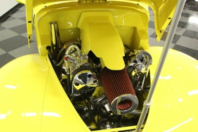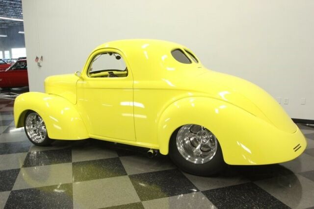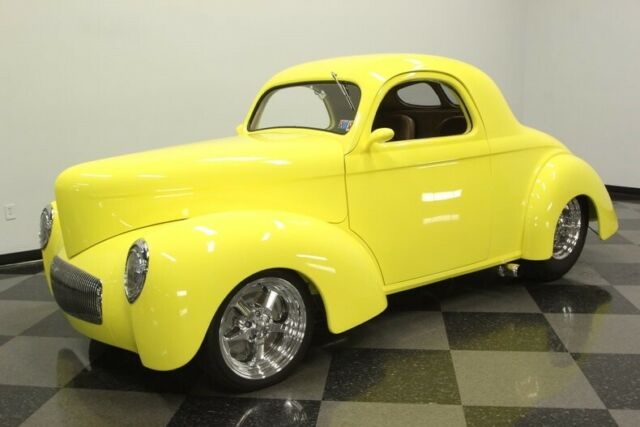 The 1941 Willys Coupe is an icon in the street rod scene. So when you can show up in a big bad classic with a big bad 502 big block V8 pushing over 500 horsepower that should be enough, right? Well no. When you pay for premium, you get it, too. This is a carefully crafted vehicle to make sure that every inch reaffirms you're looking at one of the slickest builds we've seen in our showroom. And it's even... built for comfort, too. The Lemon Ice paint that's grabbing all of your attention is courtesy of a true investment in a professional hand and plenty of modern clearcoat. The result is a devilishly delicious finish that looks like you dipped your coupe in candy before coming to the car show. Of course, it helps that this custom build started with a premium Dennis Taylor body on one of their extra durable chassis. But for this screaming yellow coupe, the details are what really count. The door handles are shaved and there's no superfluous chrome. That keeps your focus on the iconic electric shaver grille and teardrop headlights. It's butter-smooth in the rear where the sloping design instantly reminds you why the Willys coupe is an icon. In fact, this one really goes the extra mile for its smooth appearance. That's why you have color-matched sport mirrors, flush-mounted taillights (w/third brake light,) and a license plate hidden away on a vacuum-operated hinge. Some cars try to hide their aggressive stance, but on this one, those swoopy fenders can barely contain it. The deep Budnik Tiller 5 wheels are forged units that are there to give strength to where the massive 13-inch wide rear rubber meets the road. The remote door openers give way to a full custom and comfortable setup. The two-tone brown leatherette is a thoughtful design that will have people talking. You even have the Willys Overland logo embossed behind the seats and in the finished trunk. While the outside was built for speed and slickness, you can tell the investment inside was all about comfort. Well-bolstered bucket seats, power windows, power steering, cup holders, AM/FM/CD stereo with aux input, and cold-blowing R134a air conditioning mean this is a great place to spend some time. So while there's only about 3,600 miles on this fresh build, you know you'll happily add miles to the odometer with style and ease. Of course, the Lecarra steering wheel on the Flaming River tilt column, B&M ratchet shifter, and a dash dominated by crisp VDO gauges also tell your senses this one is ready for performance. We suggest grabbing some sunglasses before inspecting the engine bay. Because anything that isn't finished in a smooth and bright yellow has been polished to a mirror-like shine. It's the kind of heavy investment that can win awards on its looks alone. But while the appearance is meant to draw people in, the full build is designed to blow their doors off. You're looking at a 502 cubic-inch crate motor. It has the best in go-fast goodies like a Holley 850 CFM four-barrel carburetor, Spectre performance air intake, and Sanderson ceramic-coated headers. Plus, it has all the right supporting components, like a Zoops bracket kit, MSD ignition, and a Steve Long custom radiator with dual Spal electric fans. This full package is rated at a whopping 500+ horsepower, and so you need the right components to get that power to the ground. That means a strong TH400 three-speed automatic transmission with a 2500 RPM stall. It feeds a strong Ford 9-inch rear with 31-spline Moser axle and limited slip differential. As you look at the undercarriage photos, you're going to see a full color-matched presentation that will have you putting a mirror under this fresh build wherever you park it. But don't forget to spot terrific components like the Heidts independent front end, strong four-link rear, adjustable coilovers, and the unbeatable stopping power of a performance four-wheel disc brake package. Complete with maintenance records and service manuals, this is an amazing unbeatable street machine in every way - from its stellar appearance to the big power V8. You know how special this high-quality build is, so better get your hands on this one before it's gone. Call today!!!