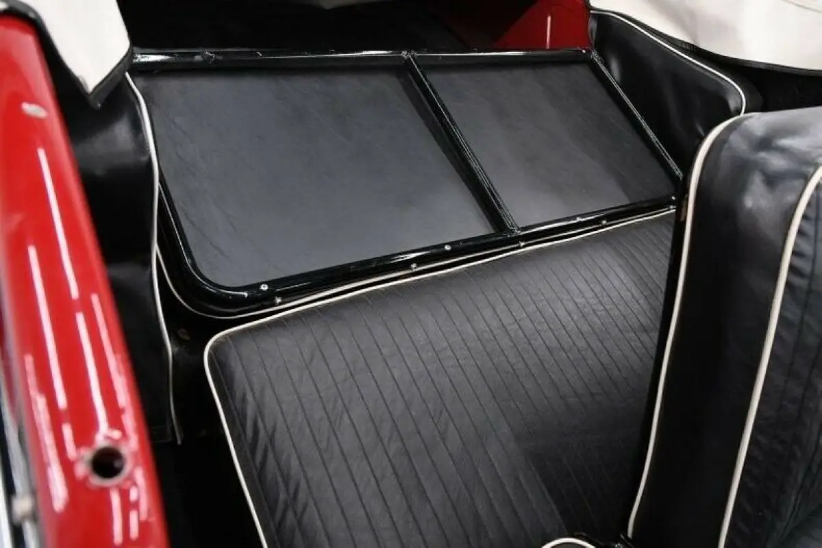 EXTERIOR: It presents itself very well. The body is solid, no signs of rust. The two tome paint is glossy. Up front it has bright chrome bumper and bumper guard. The grill trim headlight bezels, hood latches, door handles are all good. The aluminum step plates look like a fun way of climbing into the back seat. In back it has a spare tire with a cover. The rear bumper is bright. To dress them up each Jeepster came with white walls, hubcaps and trim rings. The white convertible top is in nice shape. It has a complete set of side curtains too.