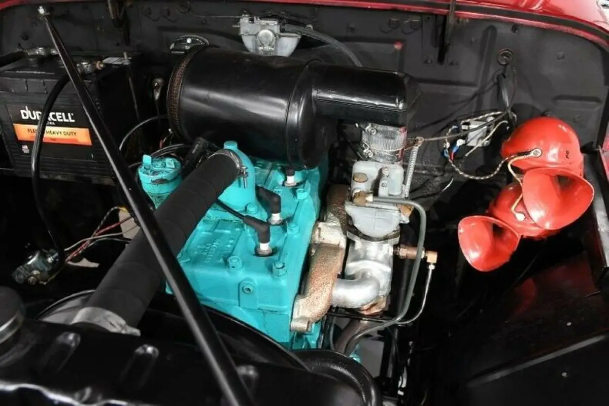 ENGINE COMPARTMENT: Very clean and tidy. Original 4 cylinder Jeep motor runs smooth. The manifolds have been ceramic coated. All the components like the carburetor, fuel pump, generator, starter and distributor look fresh. The wiring was replaced with correct cloth wrapped wires, relays and regulator look new.