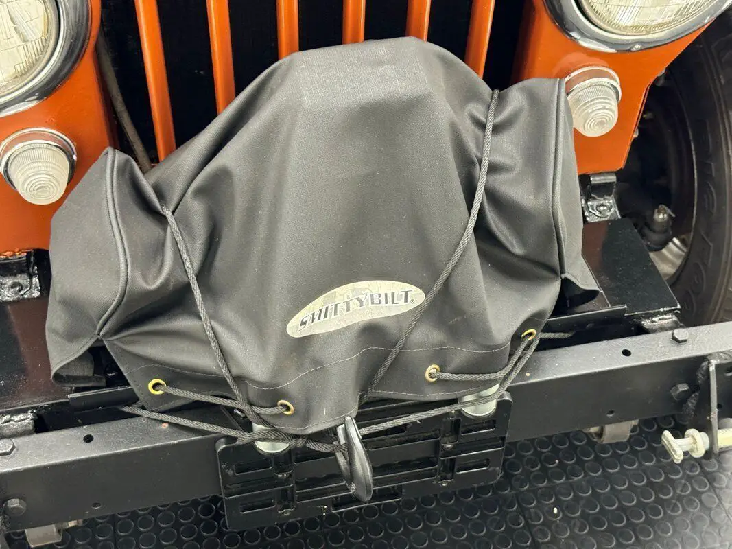 Not one, not two, but three coats of Burnt Orange Metallic paint coat this little CJ and is topped by another three coats of "sealant". We've seen this color on modern GTO's, on resto-mods, and even Volvo S60's, but this is a first! And black is a fine accent choice found on the bumpers, the embossed Willy's on the hood, the hood hardware and the Jerry can mounted on the back. 15-inch Chrome Nugget wheels carry 235/75R15 tires which are wider than what the car was likely born with and gives it the appearance of goat-like surefootedness. The classic face includes polished headlight rings over bullet shaped marker lights. In between the light and mounted on the utilitarian bumper is a SmittyBilt winch under cover, while a tow hitch is mounted out back. The windshield is hinged and can be set down on the padded blocks on the hood for true open air motoring. The paint and accompanying hardware are in great shape and the only imperfections we find is some flaky rust on a bottom edge, and some uneven filler just above the step up.