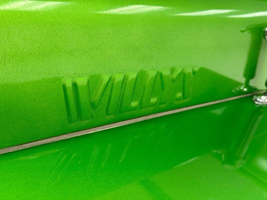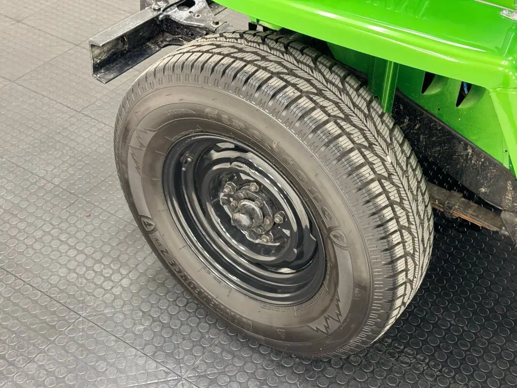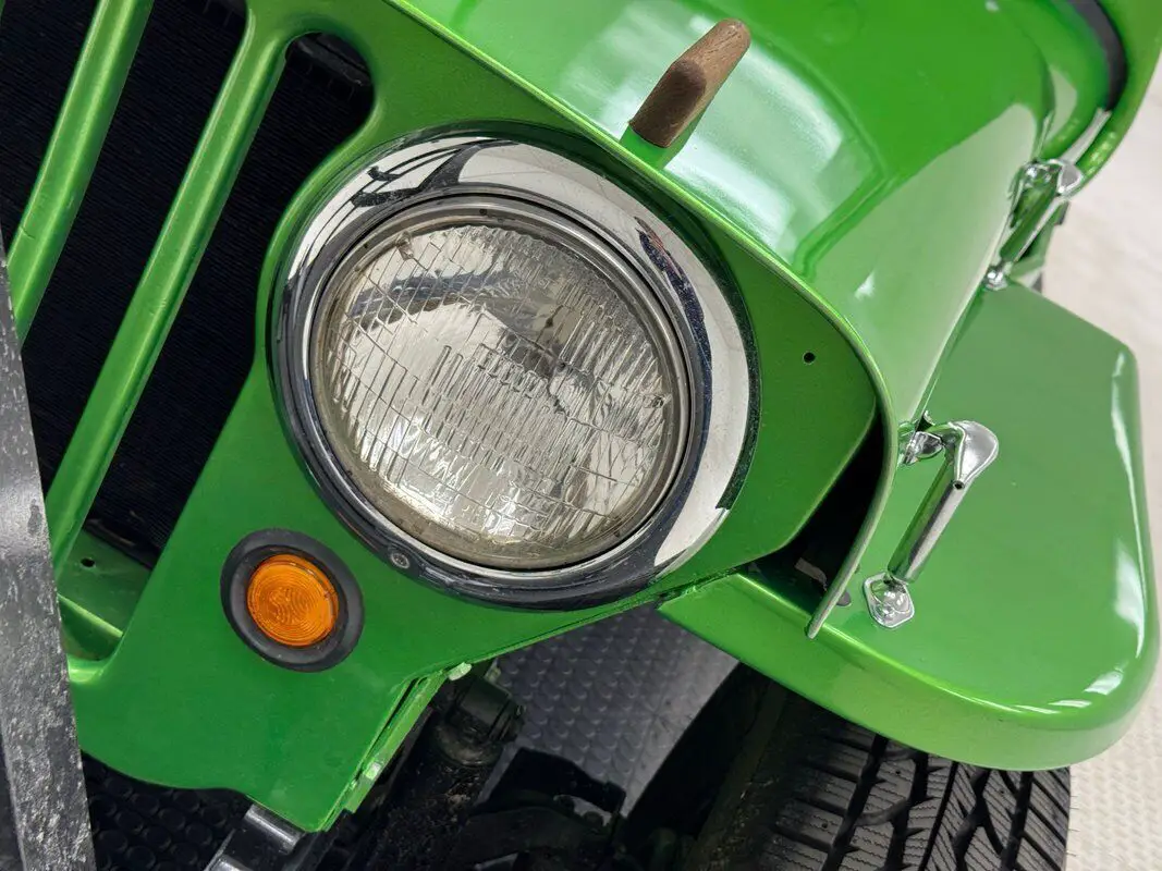 In a color yet imagined in 1948, this bright shade of green only recently started hitting the show circuit and looks great on our CJ. The scale of the car is really brought into view with the use of black wheels, 15-inch here wrapped in 225/75R15's and contrasting sharply to the Alien Green body, a study in square edges right down to the flat front fenders. Black also takes in the back bumper and front hitch which can be hooked to your camper for those outdoor expeditions. The vertical windshield is on hinges and can be tilted, or kept in place as the entire assembly is lowered onto the hood for the ultimate open air ride! A paint run, a multi part scratch, and some rock chips are the only exterior imperfections we note.