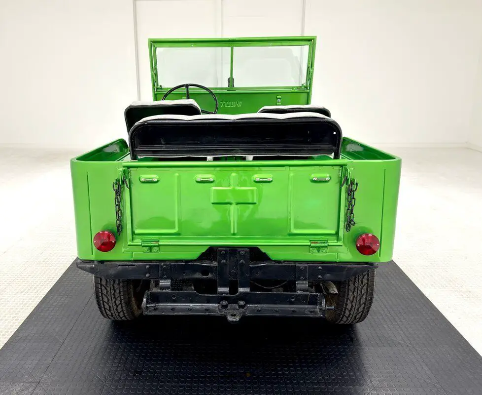 In the shiny green bay is a driver quality 134ci L-head Go Devil four cylinder rated at 60 hp, fueled by a 1-barrel carburetor and backed by a Borg Warner T90 3-speed manual transmission and a Dana 18 transfer case that splits power between 5.38 gears front and rear. Drum brakes are on board, also on front and back.