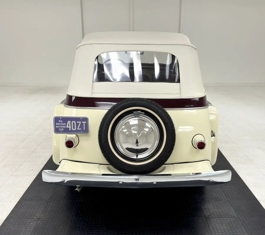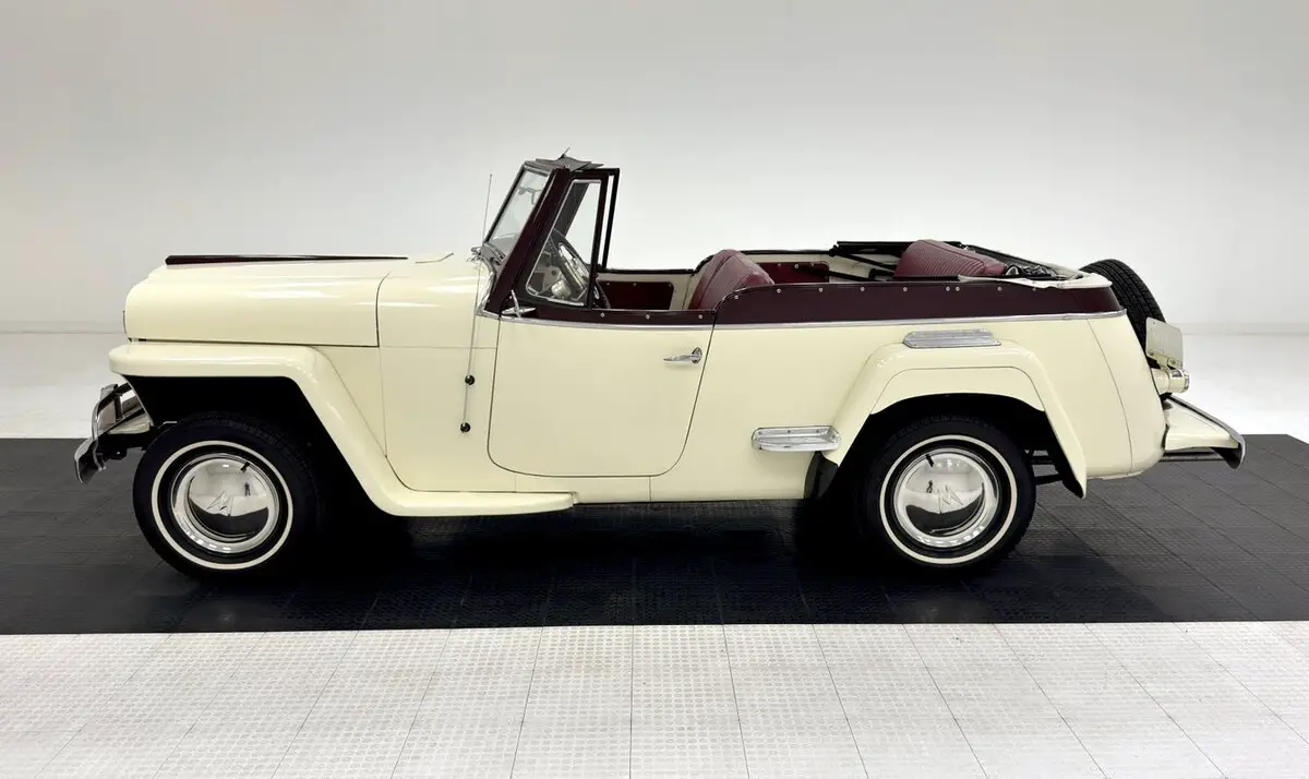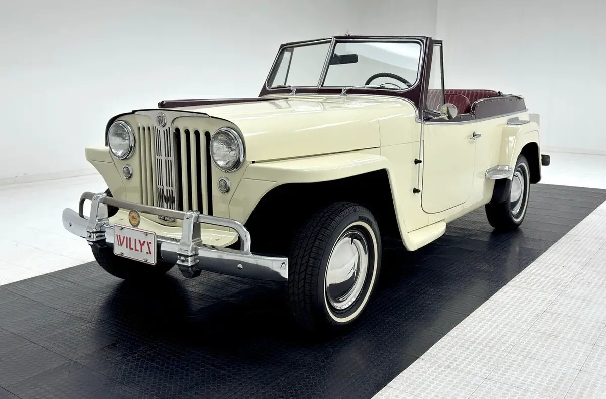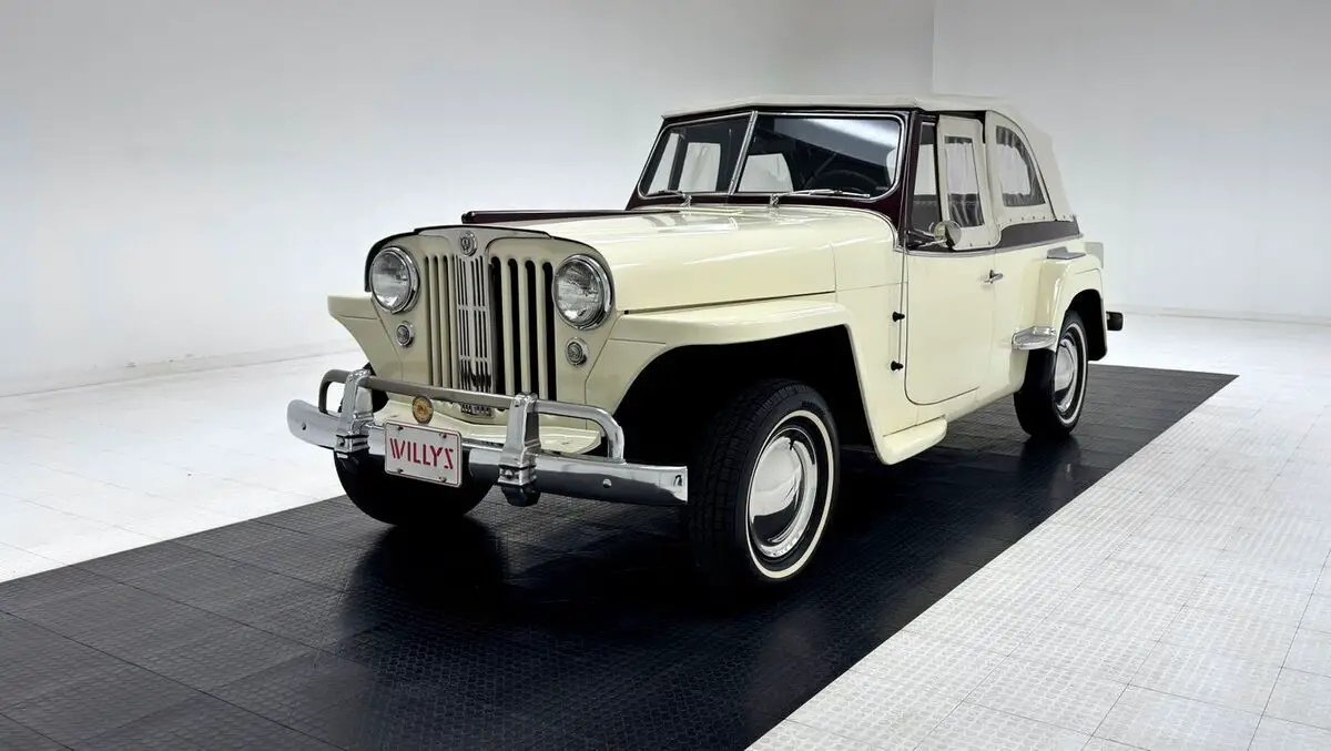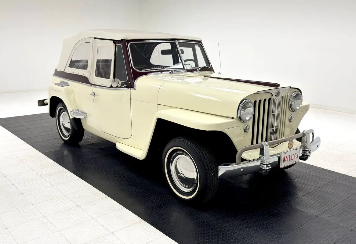 1949 Willys Jeepster For consignment, a 1949 Willys Jeepster showing 451 miles but true miles are unknown. This is a Brooks Stevens design and other notable automobiles designed by Stevens include the 1962 Studebaker Gran Turismo Hawk, the Excaliburs of the 70's, and is credited with designing the Oscar Meyer Wienermobile, one version of which was built on a Willys Jeep chassis. Exterior Eggshell White is just as you would image, as if a drop of yolk entered the mix giving it a subtle undertone of yellow and it works well on this model. The familiar Jeep grille is accented with a center ornamental chrome piece distinguishing it from its offroad cousins. The height of the Jeepster does that as well, much more car like than a 4x4, and the eggshell is complemented by Merlot paint, first on a straight edged, raised hood ornamentation and then on the frame of the windshield spilling back over the shoulder line and around the back in a ribbon of burgundy. With the top down, that shoulder line extends straight back putting all riders at essentially the same height over the body. The fenders have edges that round the otherwise angular bends in the fenders and 15-inch wheels with moon style W stamped chrome covers live under the fenders. There's another one mounted to the back between two tail lights at the end of protruding assemblies. A white canvas top with good plastic windows creates a weatherproof interior for occupants. A few bubbles in the paint, cracking, touched up chips, and uneven filler are some of the imperfections we note on an overall straight and clean exterior. Interior Maroon door cards are neatly screwed into the eggshell door and suggest the utilitarian roots of the brand and that material handsomely transfers to the column stitched split bench seat which is uniquely split 70/30, allowing backseat occupants to enter on the passenger side. And when they do, they'll find a rear bench that is in as equally good condition as the front. The eggshell based steering wheel is both wrapped in a black vinyl cover and cracked on the spokes, almost like an eggshell! The dash contains an added old school fan and a central gauge cluster with black faced, square dials on an aluminum panel that seems like a fading remnant of the art deco period. Black carpet with some age covers the floor to complete this amazing simple cockpit. Drivetrain A driver quality Lightning 148ci inline 6 is under the hood rated at 72 horsepower and receiving fuel via a 1-barrel carburetor. The transmission is a 3 speed manual with overdrive and power is sent to a Dana 23 axle with 4.88 gears. Drum brakes are supplied front and back. Undercarriage Relatively clean and dry underneath with plenty of some typical surface rust, mostly on the substantial frame rails. Clean knuckles and a clean gas tank are noted while a single exhaust enters a stock style muffler before exiting out the back just under the chrome bumper. Suspension consists of a transverse leaf spring in front and leaf springs in the back. Drive-Ability We don't want to liken it to a toy, this is after all a seriously classic car. But it's as much fun as a ride at Disney and almost as bare bones! The six cylinder comes to life and while not overwrought with horsepower, rowing through the gears does provide good momentum and the overdrive gear smooths out the ride. We note the horn does not work but all other functions, and there aren't many, work as they should. While Classic Auto Mall represents that these functions were working at the time of our test drive, we cannot guarantee these functions will be working at the time of your purchase. Doylestown, PA puts on the oldest annual Memorial Day parade in the country and each year a Jeepster makes its way down Court Street and has for decades, owned by a well known townie. And it always elicits smiles and cheers from the adoring crowd. That's one memory of a Jeepster. It's time to make some of your own with this personable, interesting, and well built Willys, and this one is worthy of your consideration. Classic Auto Mall is home to more than 1,000 classic and collectible vehicles for sale via consignment in a climate controlled 336,000-square foot showroom (that's more than 8 acres!). The largest single location consignment dealer of classic and collectible vehicles in the country is located in Morgantown, Pennsylvania, just 1-hour west of Philadelphia off Exit 298 of the I-76 Pennsylvania Turnpike. For more information visit or call us at 855-201-7026. Contact us anytime for more information or to come see the vehicle in person. There is no guarantee of mileage. A $299 Dealer Administrative fee is not included in the advertised price. With so many great cars, you know we have a lot to talk about, and we do that each week on the Classic Auto Mall Podcast with host Stewart Howden. Stewart discusses new inventory as well as trends in consignments and car prices, while interviewing celebrities and automotive professionals about amazing cars and their history. Tune in each week to the Classic Auto Mall Podcast wherever you enjoy listening. You can also watch on YouTube!