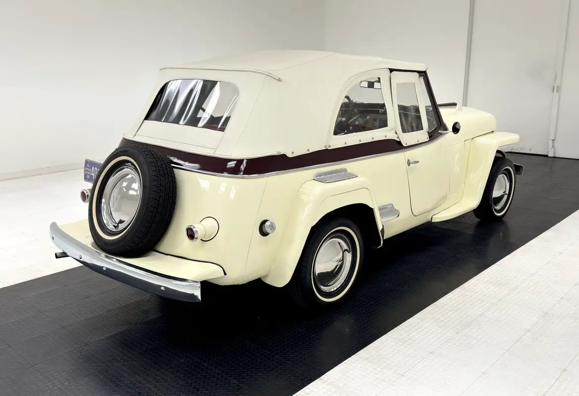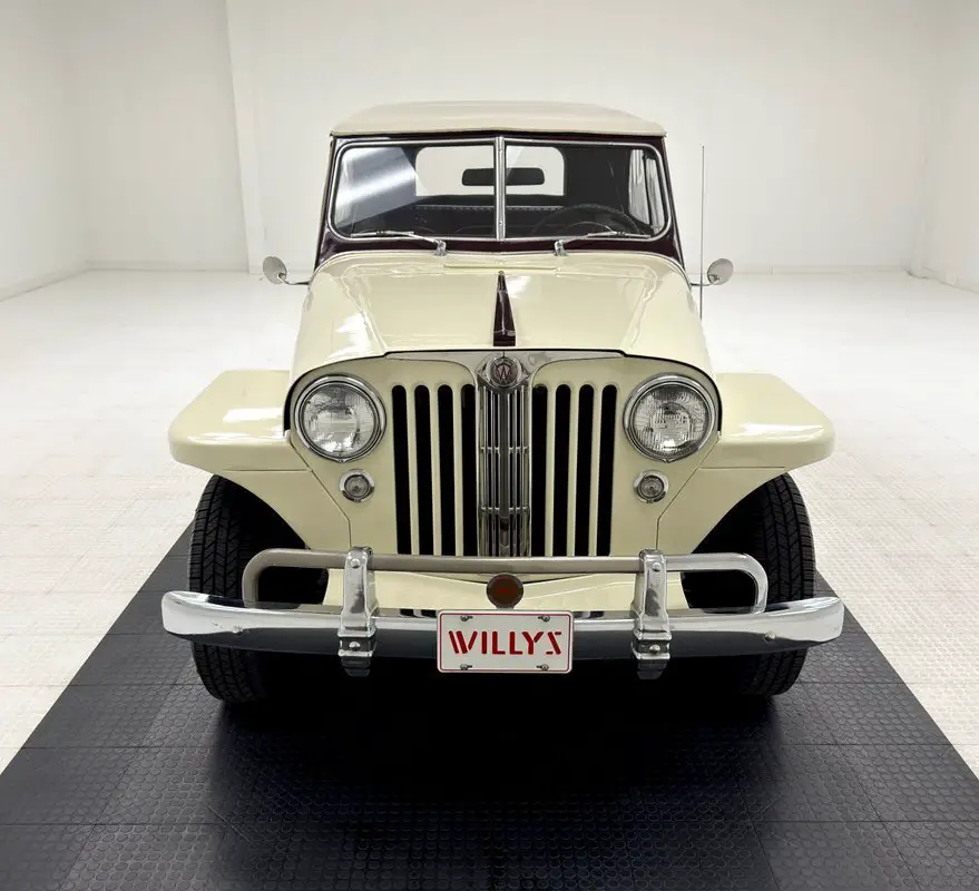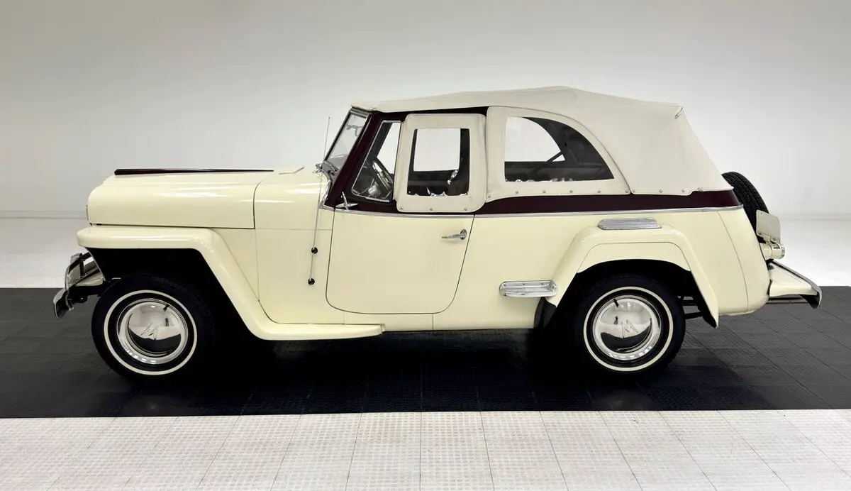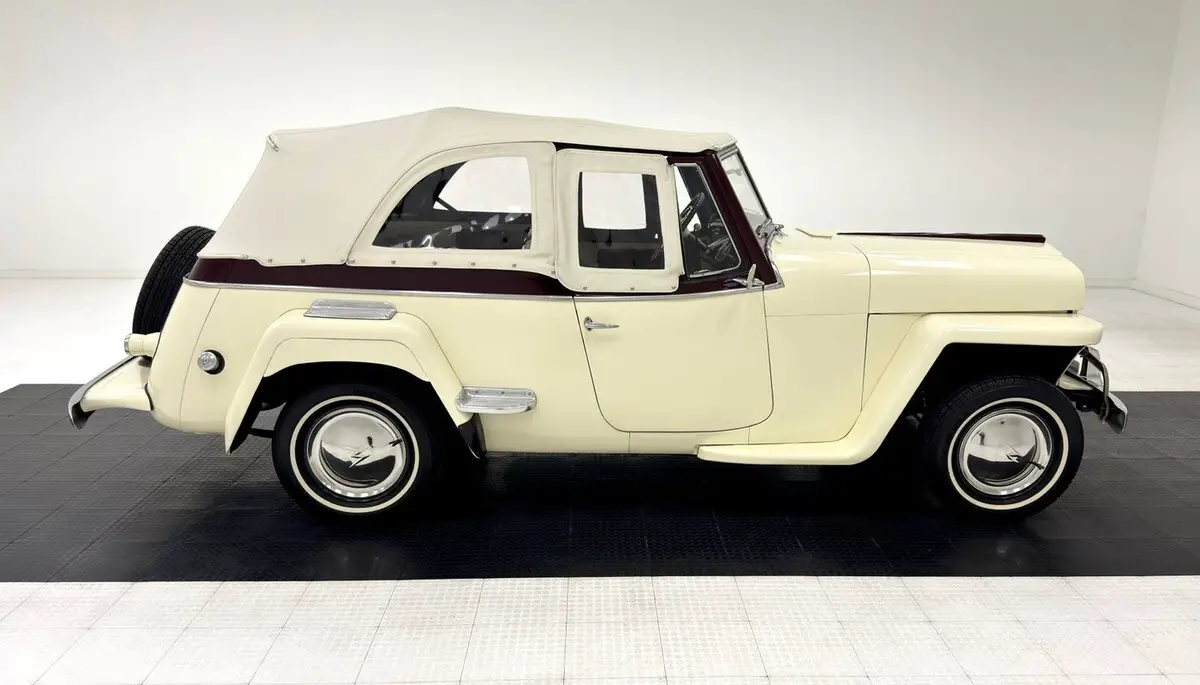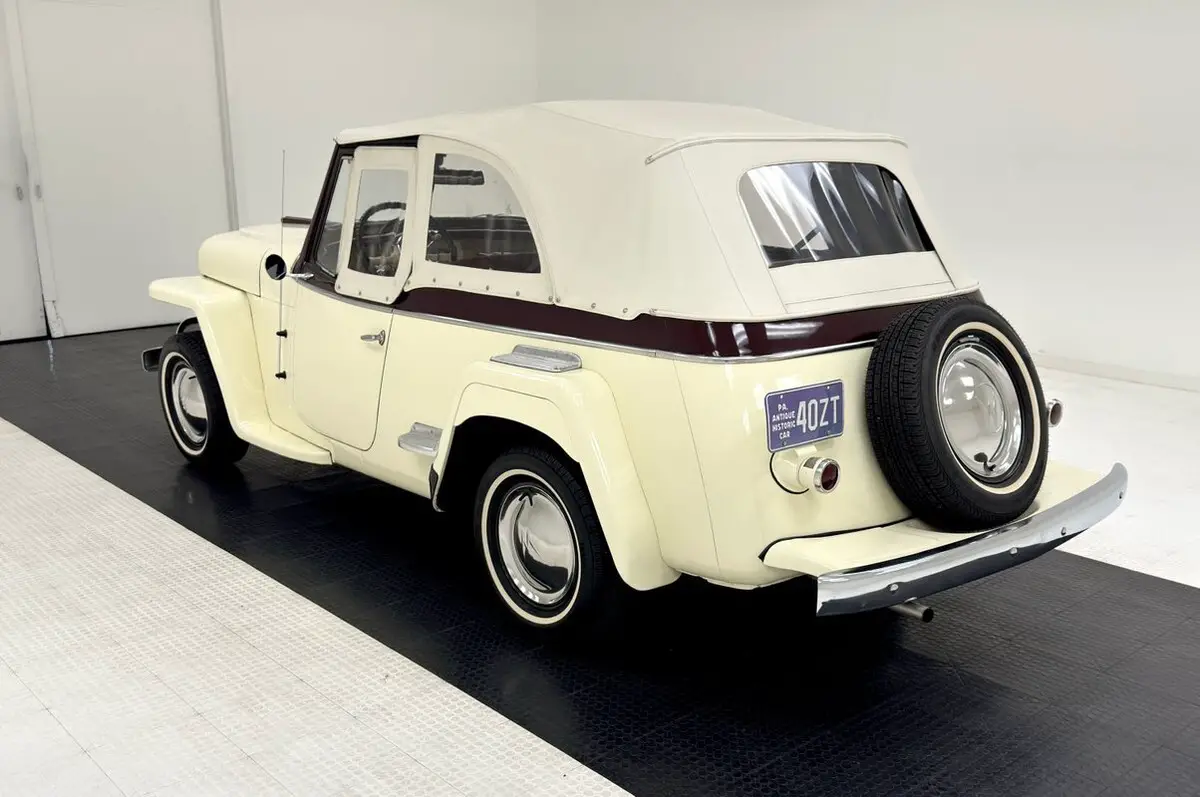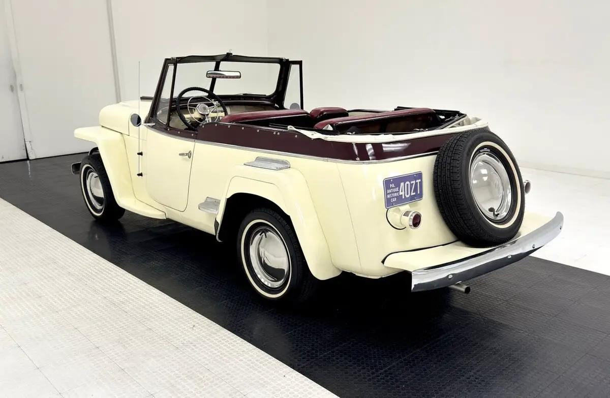 1949 Willys Jeepster For consignment, a 1949 Willys Jeepster showing 451 miles but true miles are unknown. This is a Brooks Stevens design and other notable automobiles designed by Stevens include the 1962 Studebaker Gran Turismo Hawk, the Excaliburs of the 70's, and is credited with designing the Oscar Meyer Wienermobile, one version of which was built on a Willys Jeep chassis. Exterior Eggshell White is just as you would image, as if a drop of yolk entered the mix giving it a subtle undertone of yellow and it works well on this model. The familiar Jeep grille is accented with a center ornamental chrome piece distinguishing it from its offroad cousins. The height of the Jeepster does that as well, much more car like than a 4x4, and the eggshell is complemented by Merlot paint, first on a straight edged, raised hood ornamentation and then on the frame of the windshield spilling back over the shoulder line and around the back in a ribbon of burgundy. With the top down, that shoulder line extends straight back putting all riders at essentially the same height over the body. The fenders have edges that round the otherwise angular bends in the fenders and 15-inch wheels with moon style W stamped chrome covers live under the fenders. There's another one mounted to the back between two tail lights at the end of protruding assemblies. A white canvas top with good plastic windows creates a weatherproof interior for occupants. A few bubbles in the paint, cracking, touched up chips, and uneven filler are some of the imperfections we note on an overall straight and clean exterior. Interior Maroon door cards are neatly screwed into the eggshell door and suggest the utilitarian roots of the brand and that material handsomely transfers to the column stitched split bench seat which is uniquely split 70/30, allowing backseat occupants to enter on the passenger side. And when they do, they'll find a rear bench that is in as equally good condition as the front. The eggshell based steering wheel is both wrapped in a black vinyl cover and cracked on the spokes, almost like an eggshell! The dash contains an added old school fan and a central gauge cluster with black faced, square dials on an aluminum panel that seems like a fading remnant of the art deco period. Black carpet with some age covers the floor to complete this amazing simple cockpit. Drivetrain A driver quality Lightning 148ci inline 6 is under the hood rated at 72 horsepower and receiving fuel via a 1-barrel carburetor. The transmission is a 3 speed manual with overdrive and power is sent to a Dana 23 axle with 4.88 gears. Drum brakes are supplied front and back. Undercarriage Relatively clean and dry underneath with plenty of some typical surface rust, mostly on the substantial frame rails. Clean knuckles and a clean gas tank are noted while a single exhaust enters a stock style muffler before exiting out the back just under the chrome bumper. Suspension consists of a transverse leaf spring in front and leaf springs in the back. Drive-Ability We don't want to liken it to a toy, this is after all a seriously classic car. But it's as much fun as a ride at Disney and almost as bare bones! The six cylinder comes to life and while not overwrought with horsepower, rowing through the gears does provide good momentum and the overdrive gear smooths out the ride. We note the horn does not work but all other functions, and there aren't many, work as they should. While Classic Auto Mall represents that these functions were working at the time of our test drive, we cannot guarantee these functions will be working at the time of your purchase. Doylestown, PA puts on the oldest annual Memorial Day parade in the country and each year a Jeepster makes its way down Court Street and has for decades, owned by a well known townie. And it always elicits smiles and cheers from the adoring crowd. That's one memory of a Jeepster. It's time to make some of your own with this personable, interesting, and well built Willys, and this one is worthy of your consideration. Classic Auto Mall is home to more than 1,000 classic and collectible vehicles for sale via consignment in a climate controlled 336,000-square foot showroom (that's more than 8 acres!). The largest single location consignment dealer of classic and collectible vehicles in the country is located in Morgantown, Pennsylvania, just 1-hour west of Philadelphia off Exit 298 of the I-76 Pennsylvania Turnpike. For more information visit or call us at 855-201-7026. Contact us anytime for more information or to come see the vehicle in person. There is no guarantee of mileage. A $299 Dealer Administrative fee is not included in the advertised price. With so many great cars, you know we have a lot to talk about, and we do that each week on the Classic Auto Mall Podcast with host Stewart Howden. Stewart discusses new inventory as well as trends in consignments and car prices, while interviewing celebrities and automotive professionals about amazing cars and their history. Tune in each week to the Classic Auto Mall Podcast wherever you enjoy listening. You can also watch on YouTube!