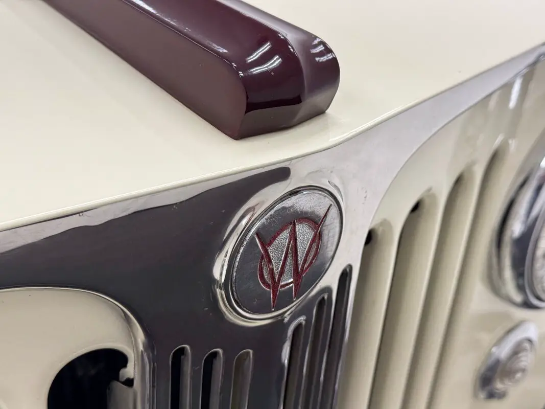 Eggshell White is just as you would image, as if a drop of yolk entered the mix giving it a subtle undertone of yellow and it works well on this model. The familiar Jeep grille is accented with a center ornamental chrome piece distinguishing it from its offroad cousins. The height of the Jeepster does that as well, much more car like than a 4x4, and the eggshell is complemented by Merlot paint, first on a straight edged, raised hood ornamentation and then on the frame of the windshield spilling back over the shoulder line and around the back in a ribbon of burgundy. With the top down, that shoulder line extends straight back putting all riders at essentially the same height over the body. The fenders have edges that round the otherwise angular bends in the fenders and 15-inch wheels with moon style W stamped chrome covers live under the fenders. There's another one mounted to the back between two tail lights at the end of protruding assemblies. A white canvas top with good plastic windows creates a weatherproof interior for occupants. A few bubbles in the paint, cracking, touched up chips, and uneven filler are some of the imperfections we note on an overall straight and clean exterior.