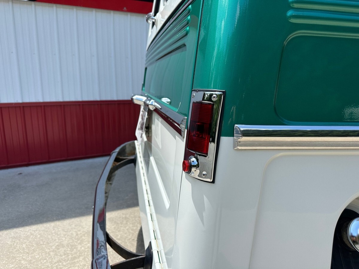 Inside, the utilitarian yet attractive interior is configured with a split front bench and two separate benches in the rear, offering a surprising amount of space for up to eight passengers. The green metal dashboard is fitted with full instrumentation, and the two-tone door panels mirror the vibrant styling of the exterior. The cabin features a standard AM radio for a touch of mid-century entertainment, and the vehicle has been converted to a modern 12V charging system to better accommodate today's electrical needs.