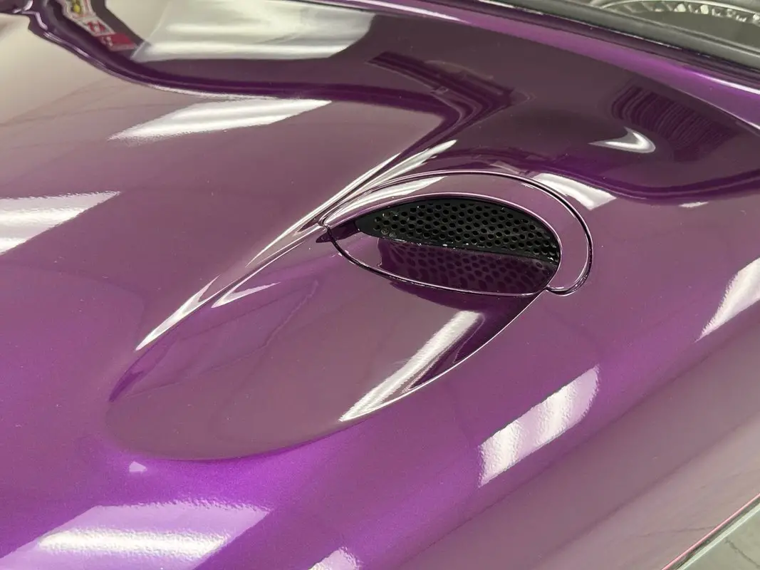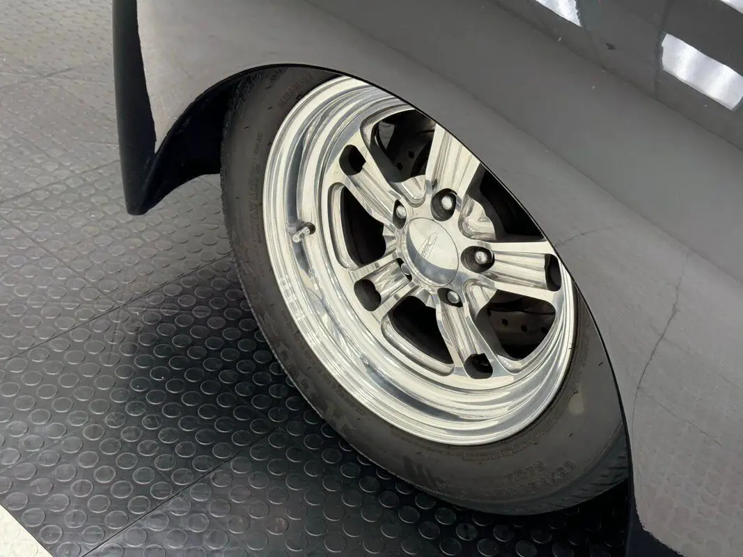 The top surface and third of the car is painted purple which encounters an elaborate pinstripe and flame design on the shoulder line, followed by inky black paint. Most of the elongated trunk lid wears purple as the wide fenders and rear valance put on black and flush tail lights are almost imperceptible, especially when your eyes are drawn to the wheelie bars protruding from the back. In front, the twin grilles form a bit of a smile between the teardrop shaped headlight rings and a pair of hood scoops near the cowl turn this happy face into a slightly menacing grin. 15-inch Budnick polished wheels occupy the axles with deeply staggered widths. In profile, the car lurches forward with the help of the shark nose, and the fenders and C-pillar that lean towards the front, as if pulling the wheels along. Imperfections include some paint runs, scratches and faded paint in rocker panel, some orange peel, cracks in the paint, and various chips and scuffs, mostly down low.