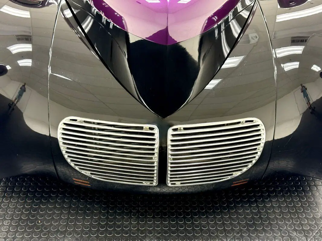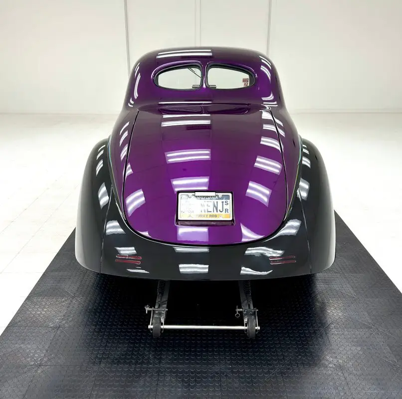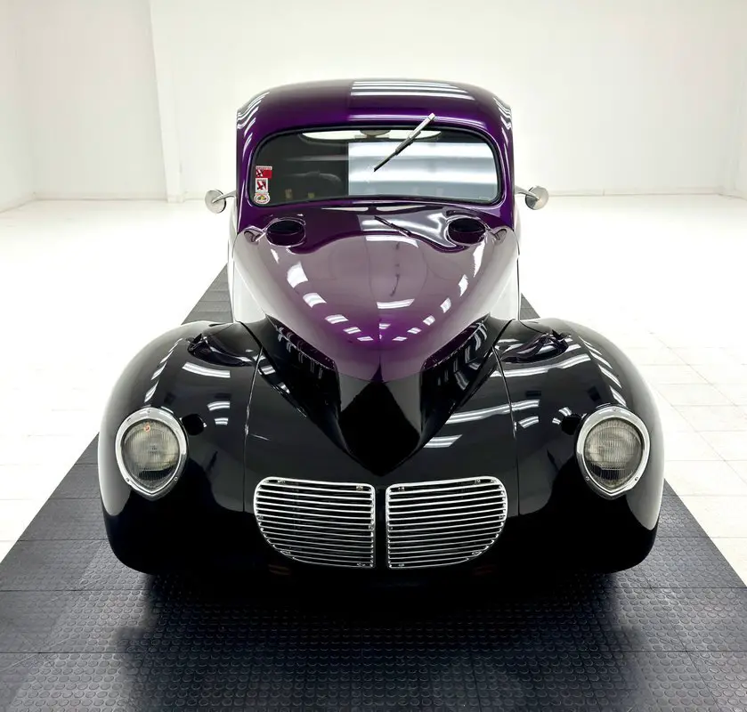 For consignment, a 1940 Willys Speedway Coupe, a purple and black street rod that barely resembles its original form, but there's no mistaking that pointed, protruding shark nose on front.
