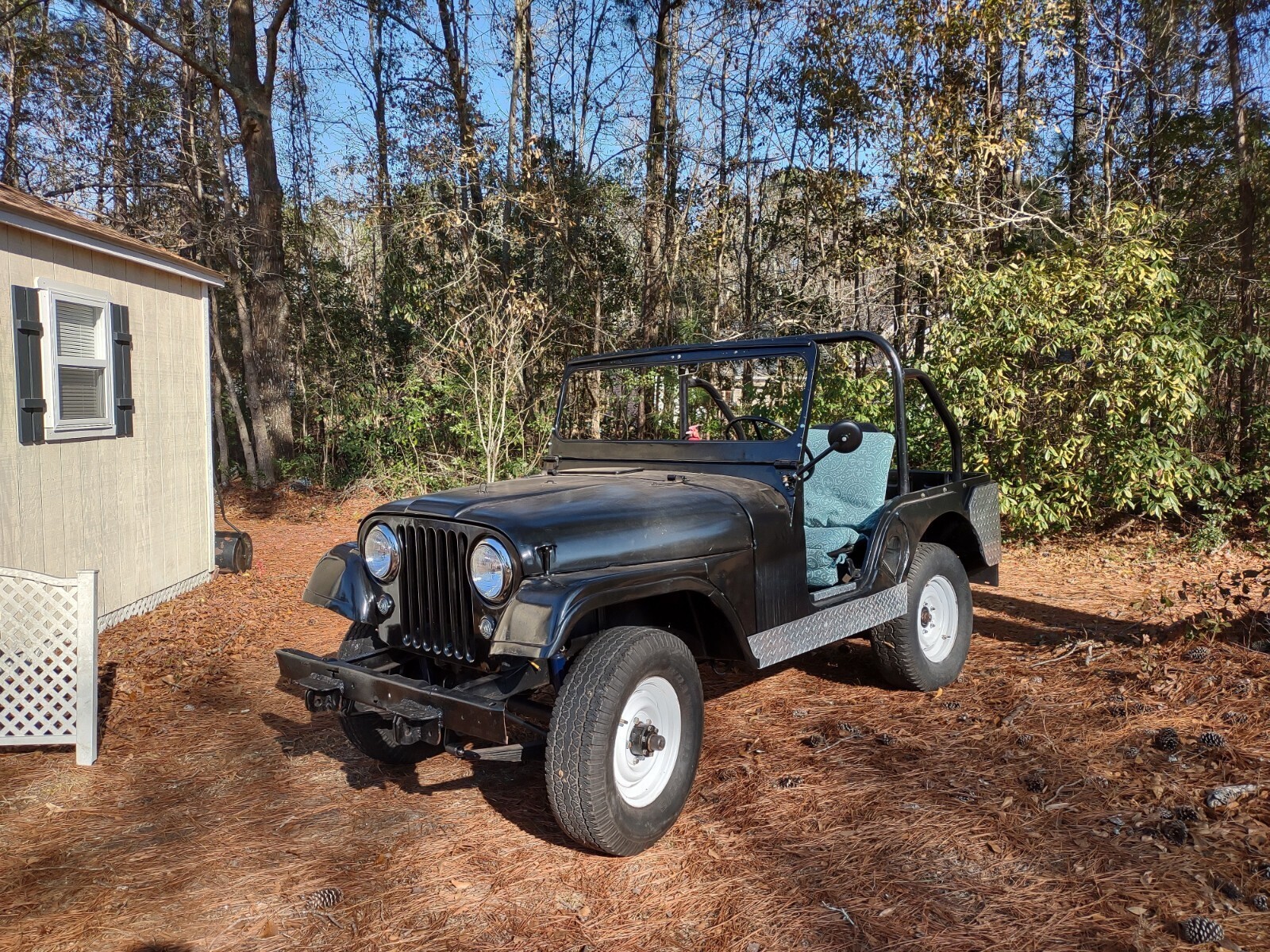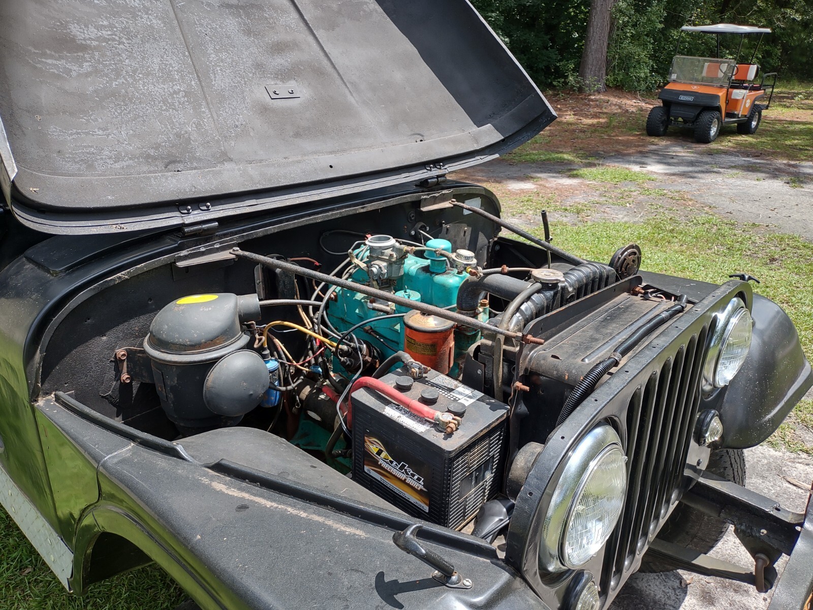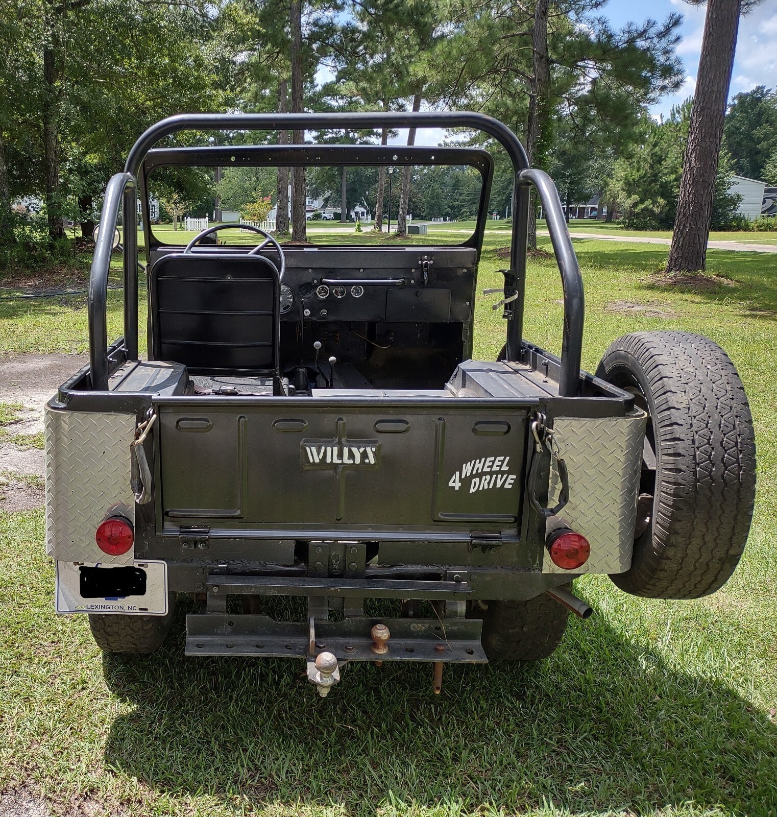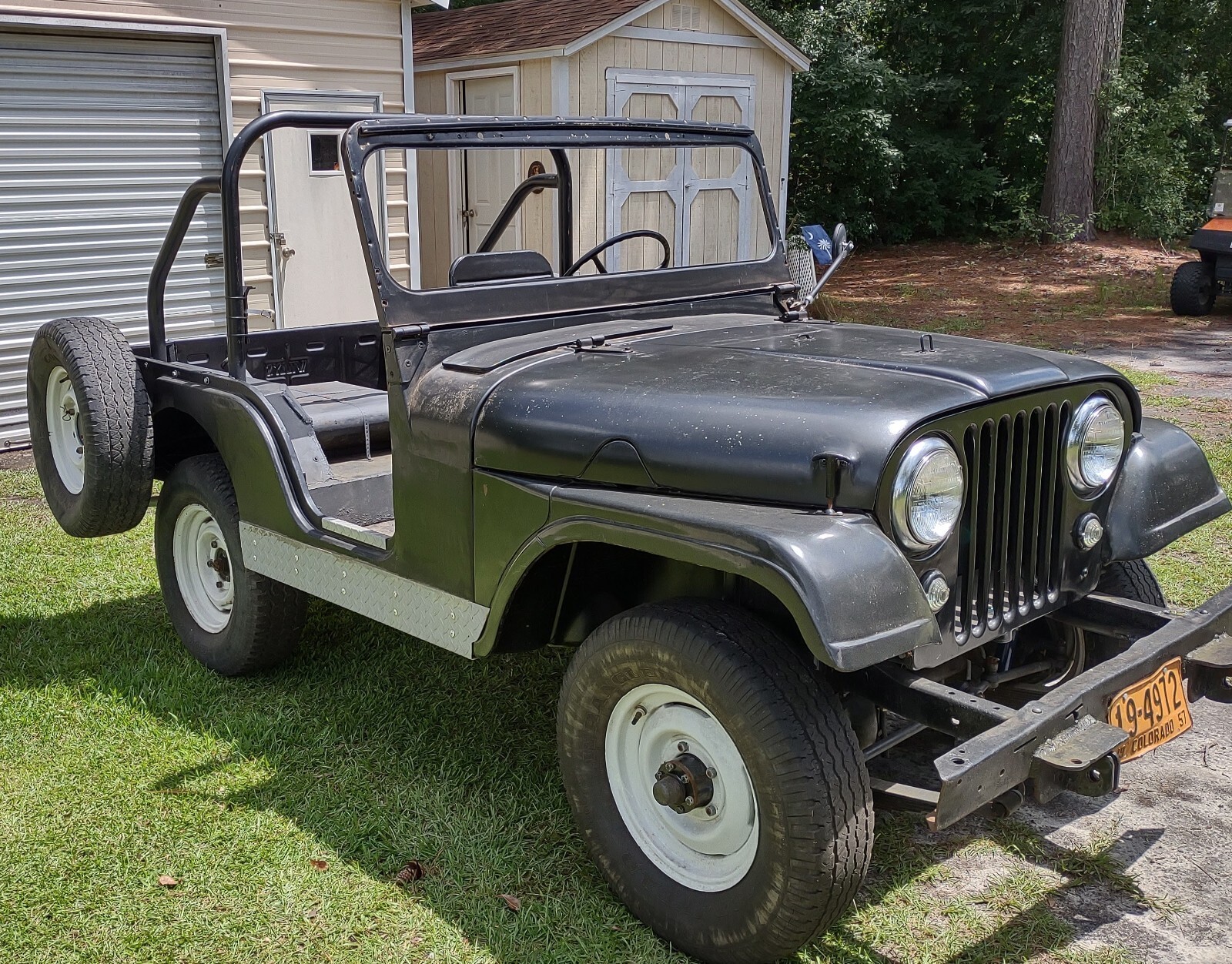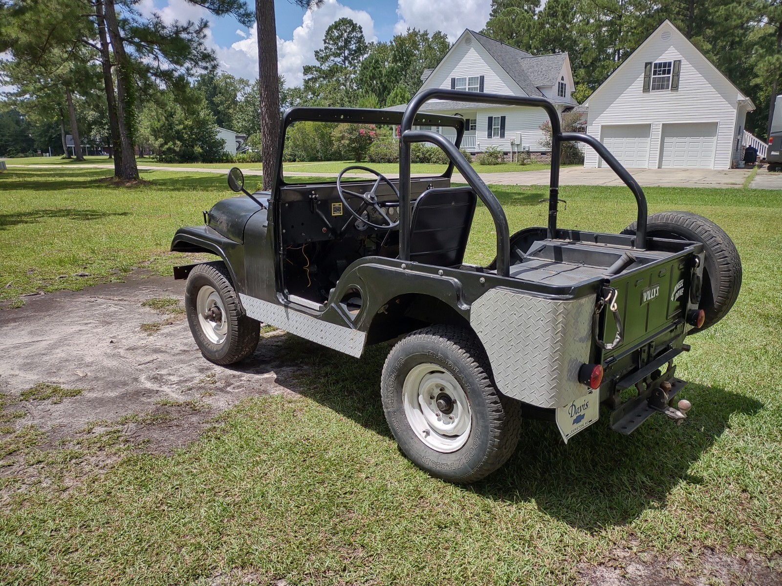 This is an early model CJ-5 Jeep, built by the Willys Motor Company, powered by the original six volt F4-134 engine (4 cylinder, 134 cubic inch displacement, 75 Hp) and a T-90A1 three forward - one reverse speed transmission, with a two speed four wheel drive transfer case.This Jeep is bare bones. No heater or AC, no top or doors, no radio, and only a driver's seat. It does have a new (in box) Bestop bikini top, a roll bar, a new tailgate, and a new under seat tool box. The fuel tank is clean, but is mounted in the rear passenger area.The brakes have been re-conditioned with new pads, new wheel cylinders, new brake lines, and new master cylinder.The brakes have not been bled. There is no emergency brake.The clutch,clutch bearing, and clutch release fork arebrand new.The clutch has not been adjusted since installation.The headlights and taillights are new.The coil, regulator, horn, points, and distributor are all six volt and are new.The windshield frame and rubber seals are new, but there is no glass.The engine was removed, cleaned, stripped, and painted, the head was removed, refreshed, all valves inspected and adjusted, and reinstalled with a new gasket. The water pump, thermostat, and hoses are new. All fluids are new.The engine mounts, transmission mount,and transaxle mount are all new.The carburetor is new, but includes the original Carter YF carburetor.The fuel lines are new. The exhaust is new from from the manifold back.The front axle hubs were serviced, bronze bushings replaced, and repacked.