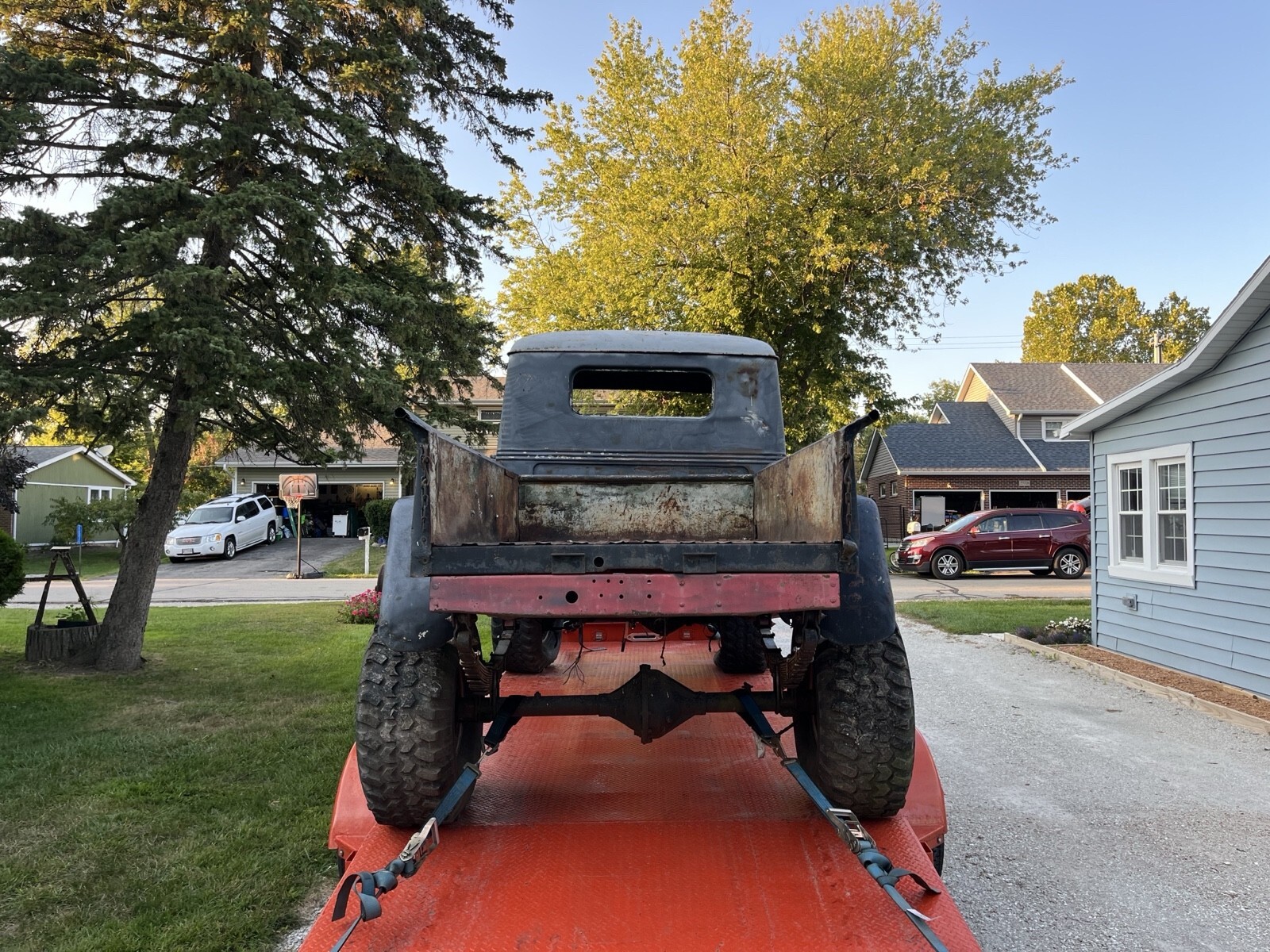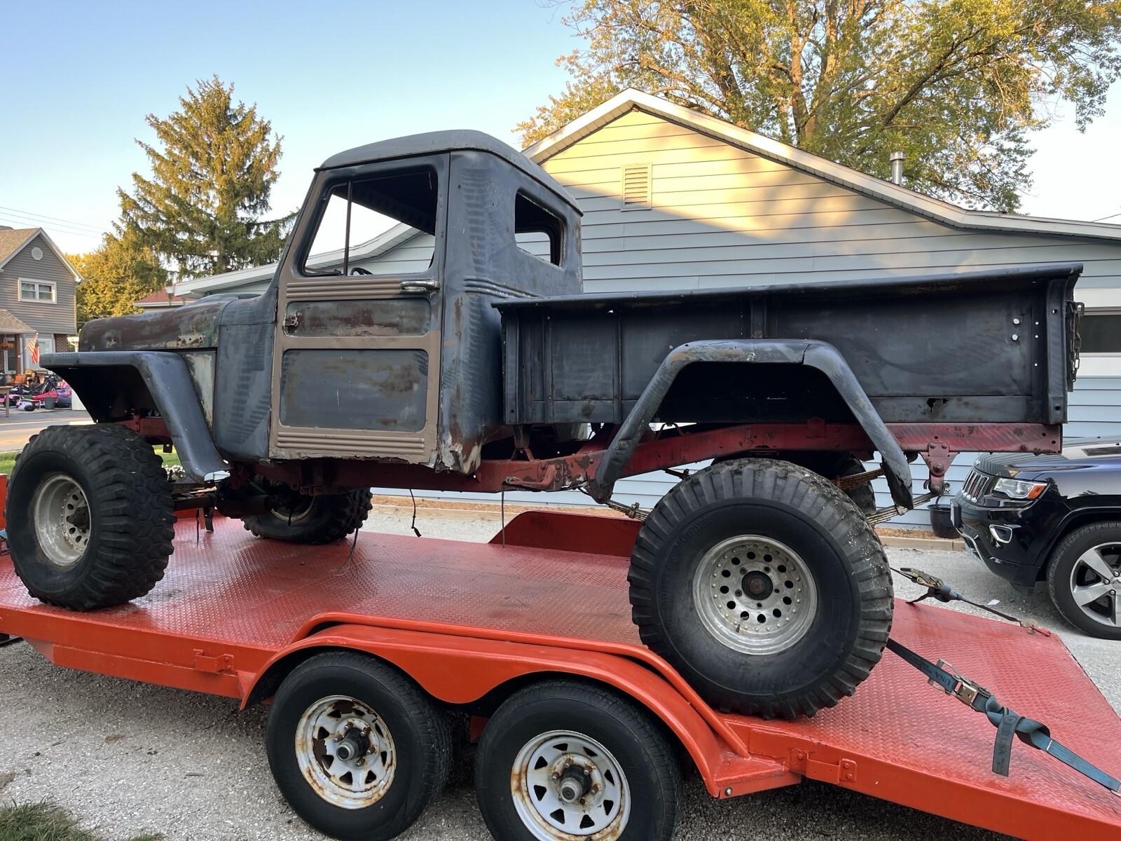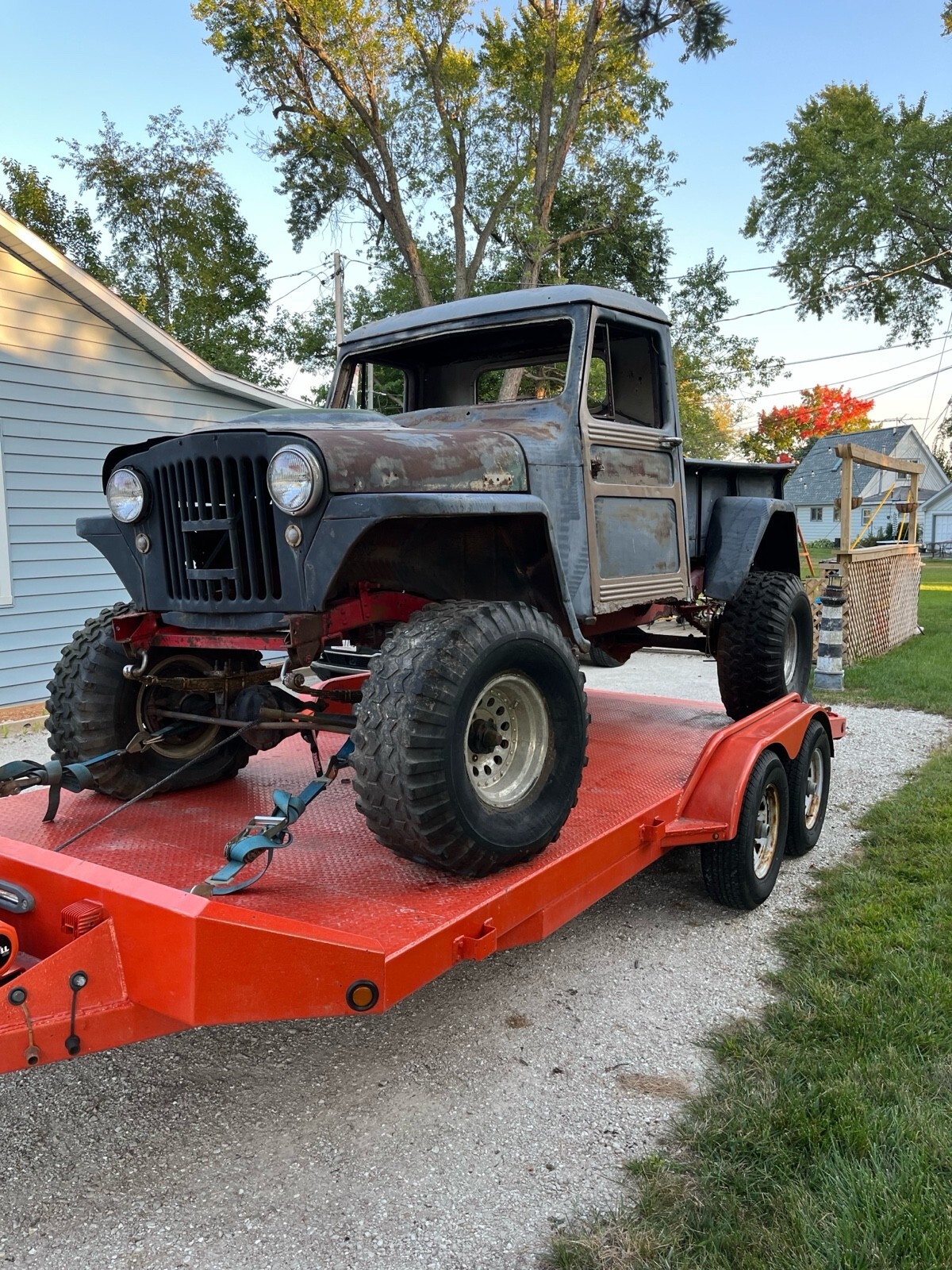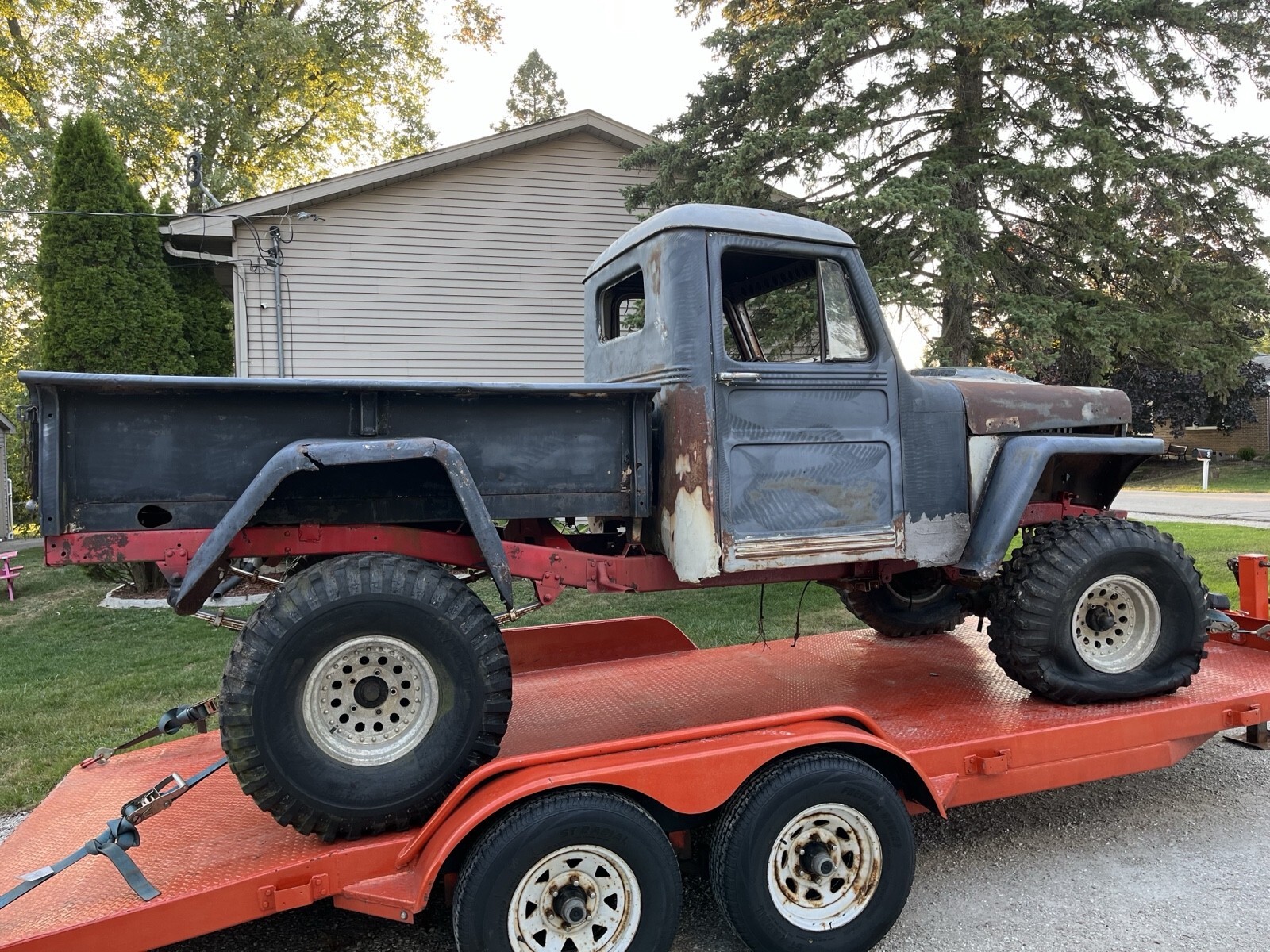 1950 Jeep Willys on 38 1/2 inch tall 15 wide 15 inch rim Mud tires, their gumbos original Jeep rear axle big lift kit, original frame, body hood bed upgraded front axle no motor needs some floor repair no transmission no title The hood scoop is just a façade. If you wanted to remove it it would be pretty easy to do. The hood is not cut. This truck would be great to turn back into a mud truck or use as a parts vehicle. Lots of potential left looks super cool would also make some really cool on lawn art